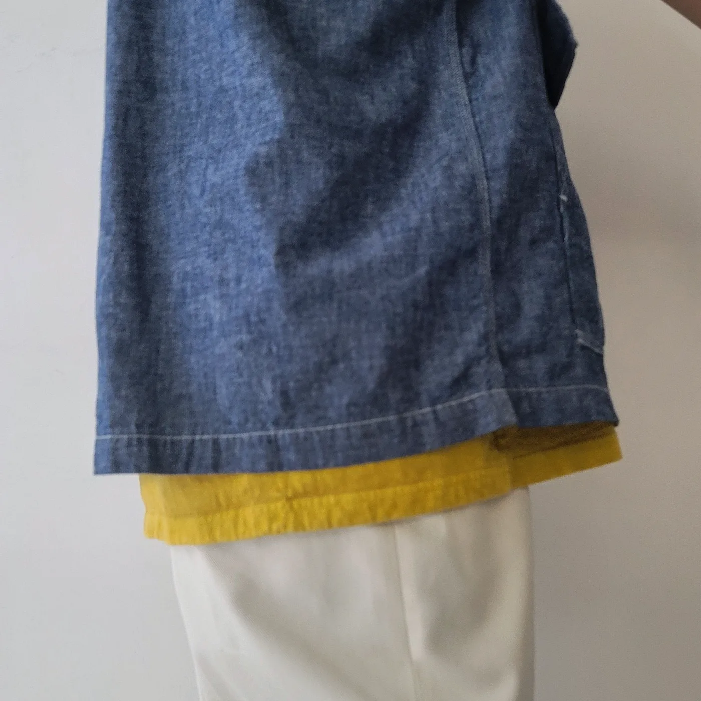 - Soft cotton chambray material with a crisp texture.