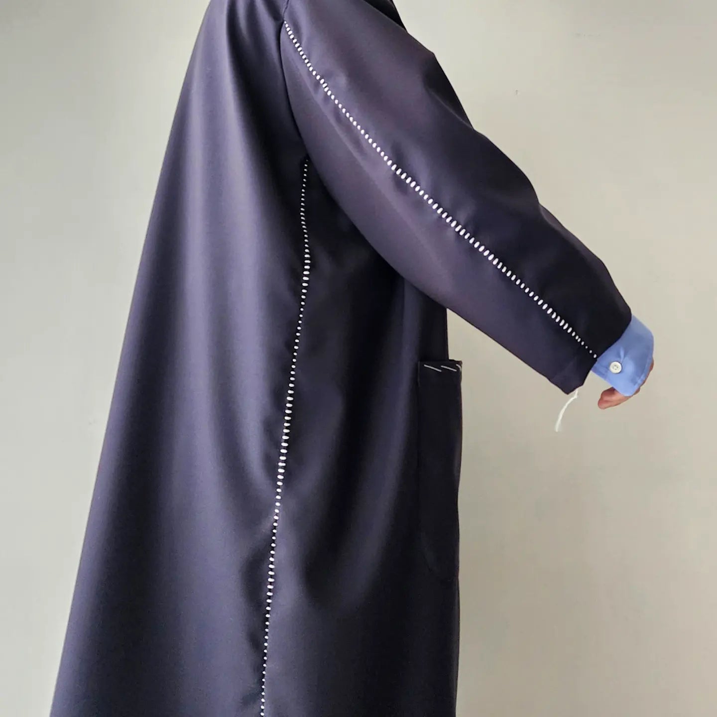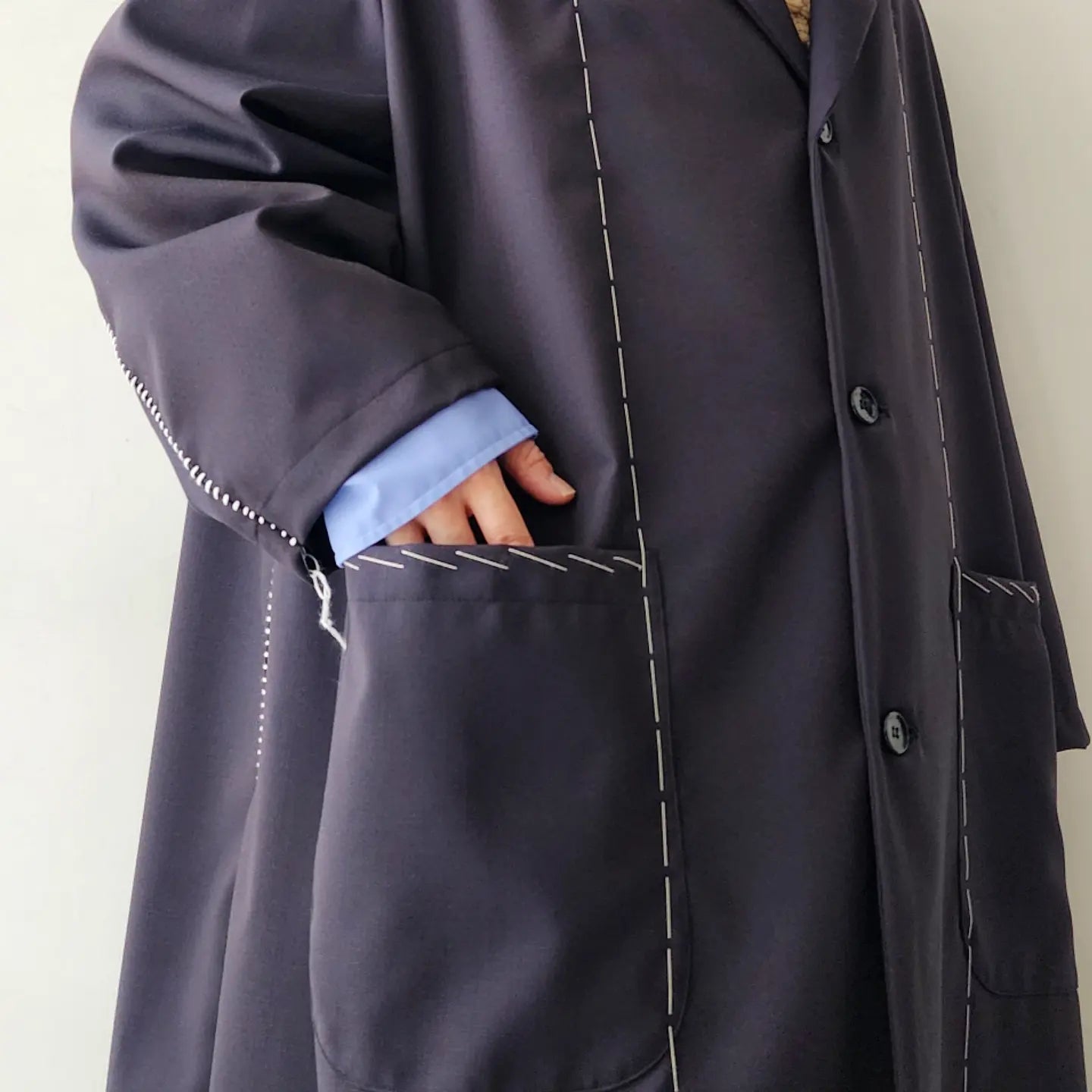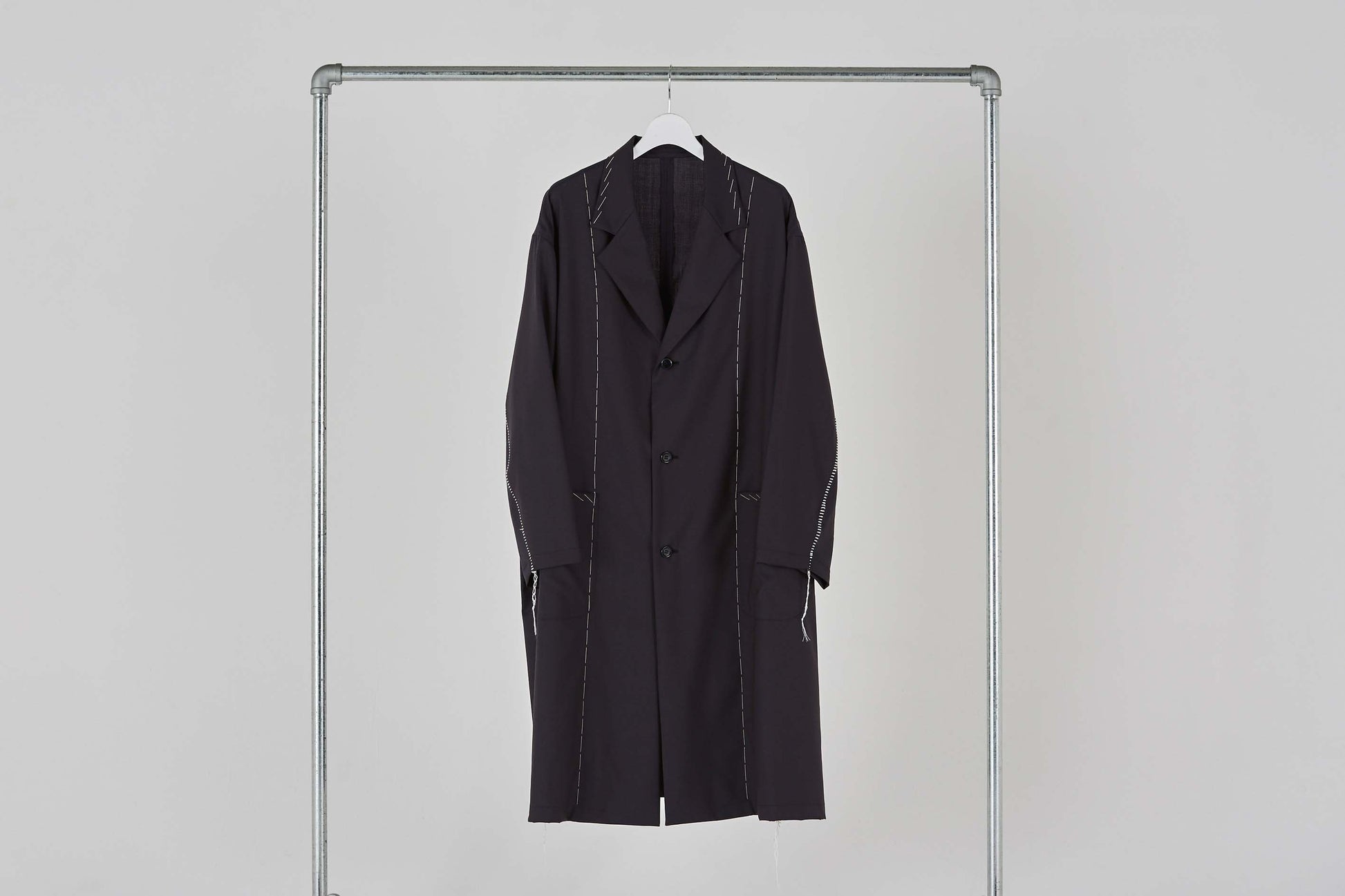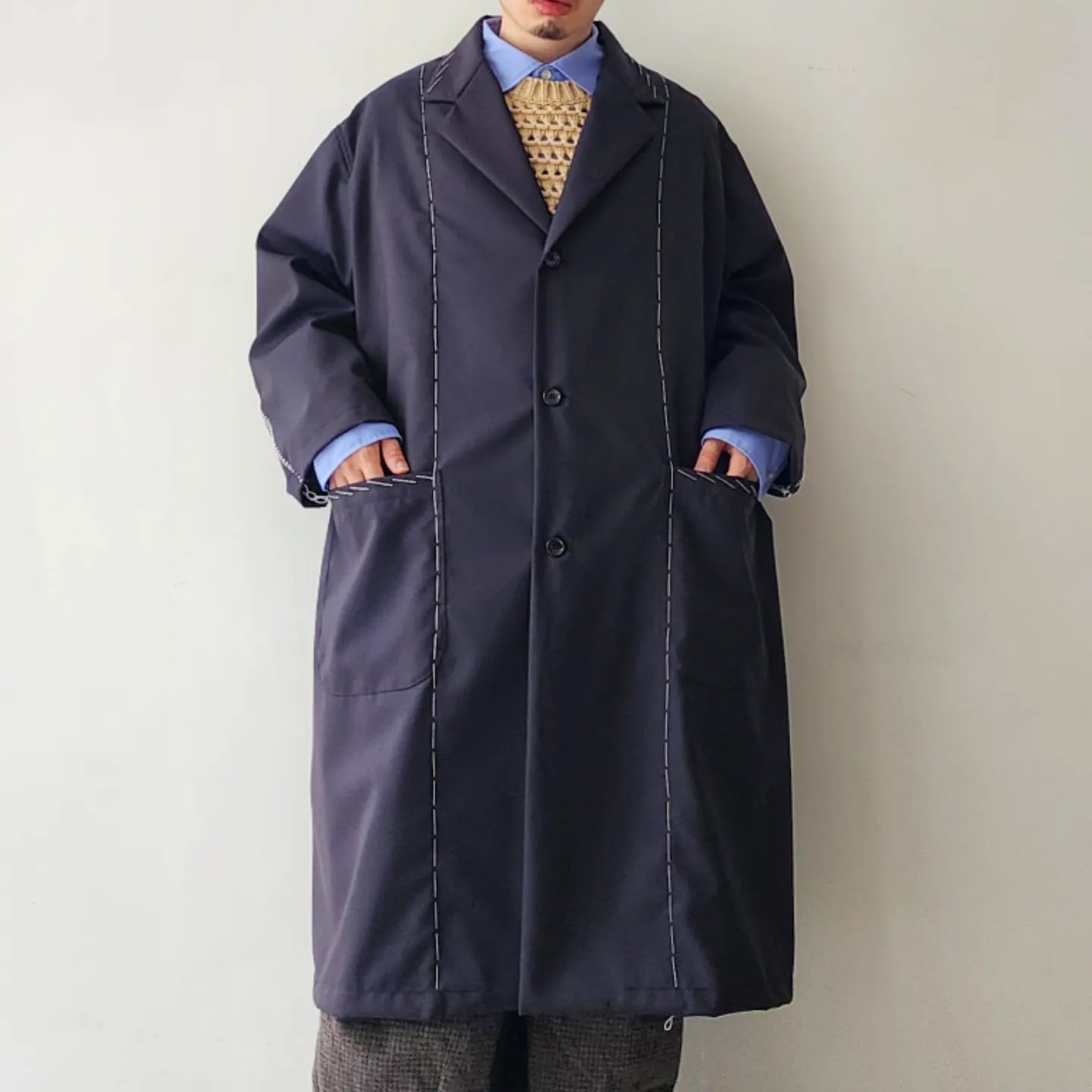 Jacket coat made of European dobby summer wool. Relaxed big silhouette and formal specifications are the key points. Blanket embroidery on the seams and hand stitching that looks like it is in the middle of tailoring make this item unique.