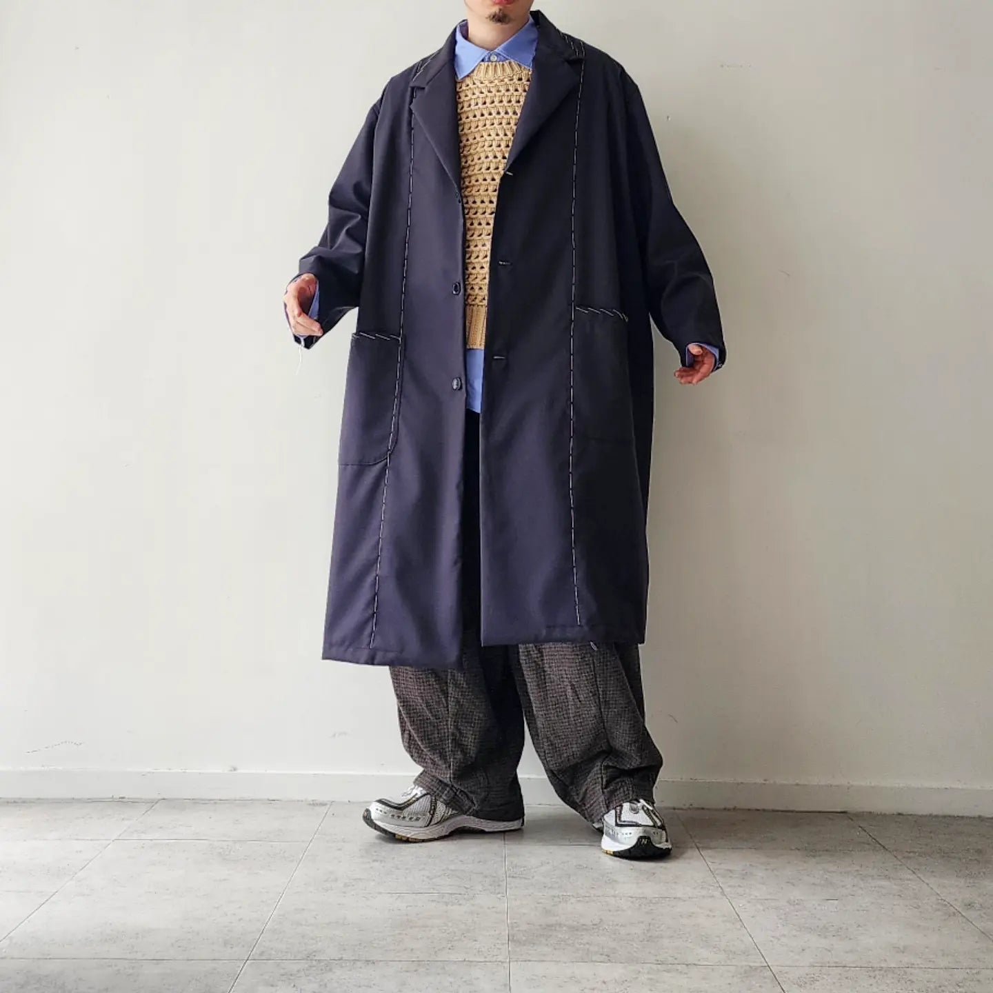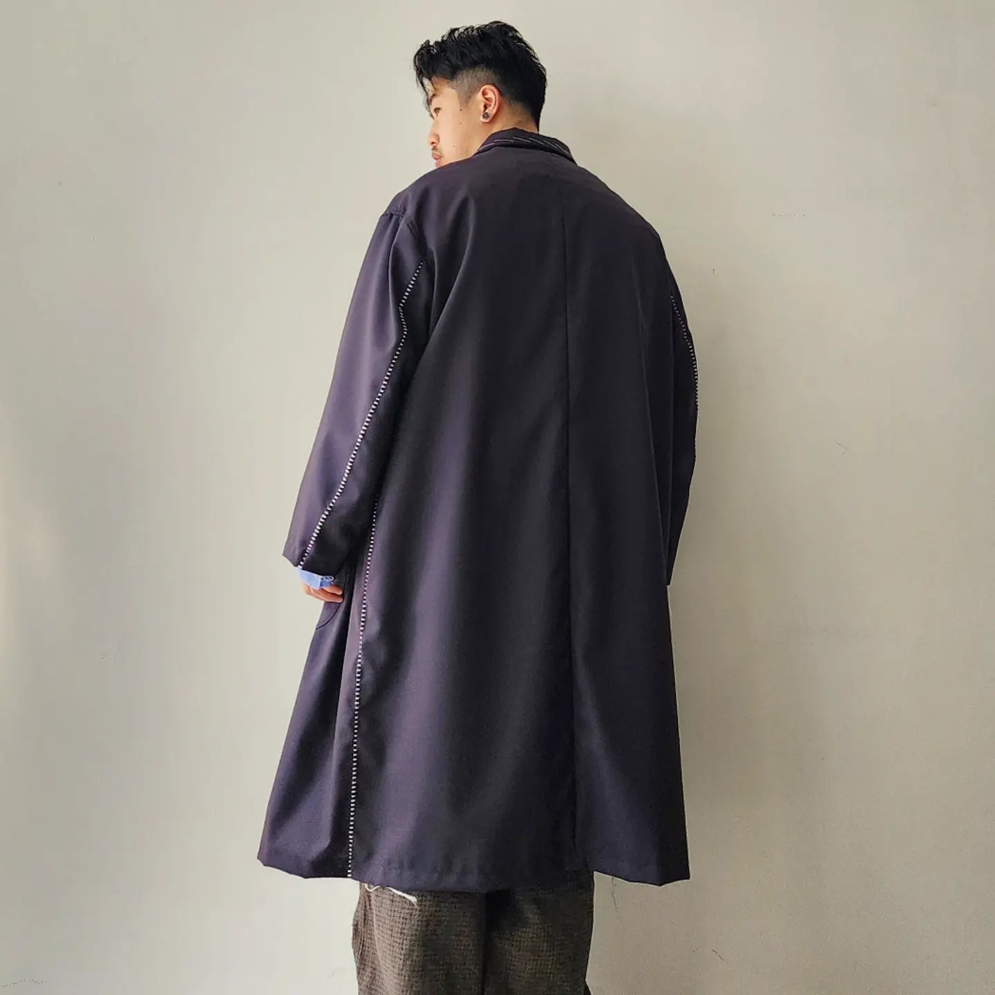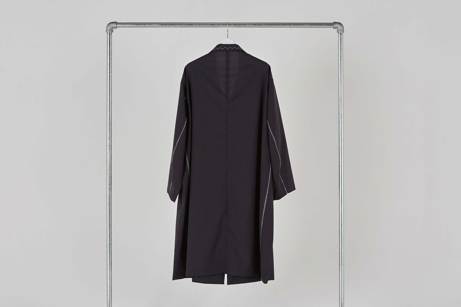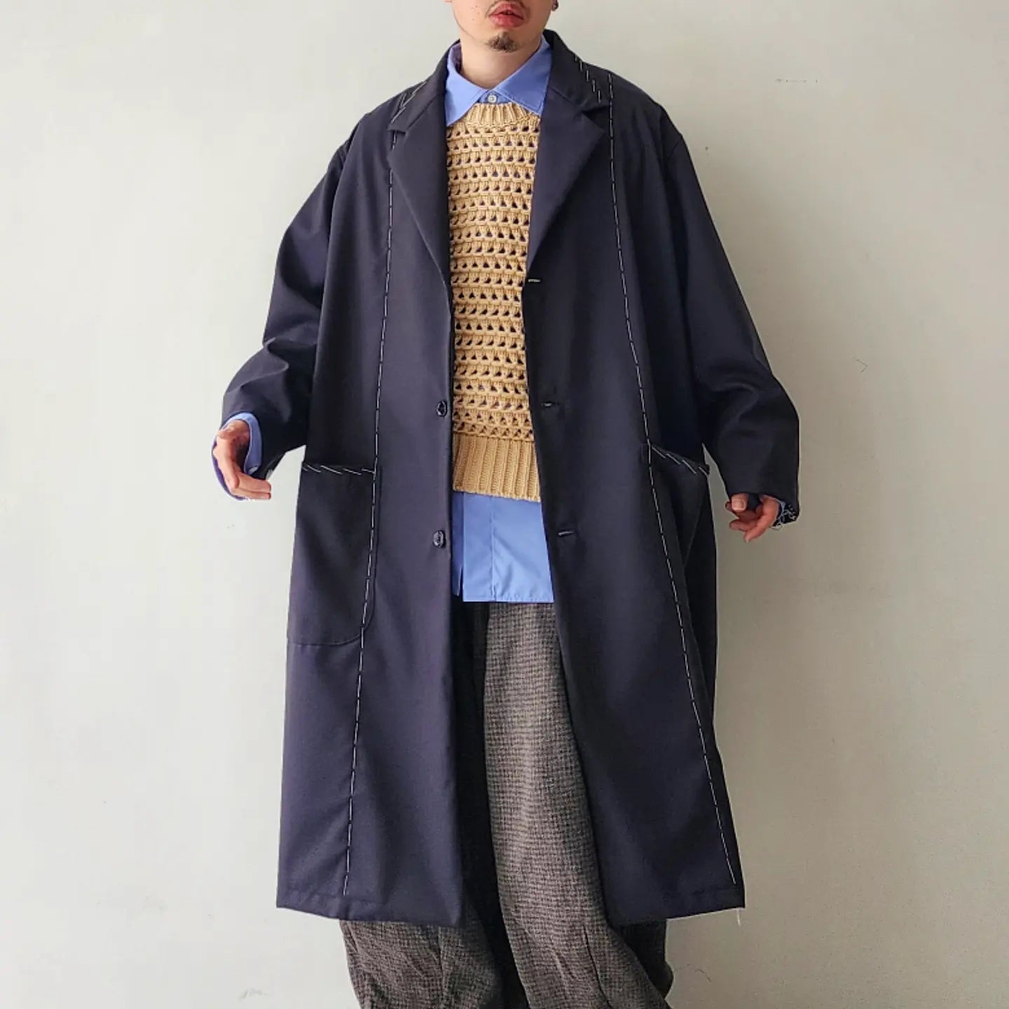 Jacket coat made of European dobby summer wool. Relaxed big silhouette and formal specifications are the key points. Blanket embroidery on the seams and hand stitching that looks like it is in the middle of tailoring make this item unique.