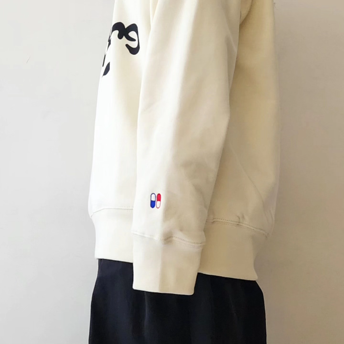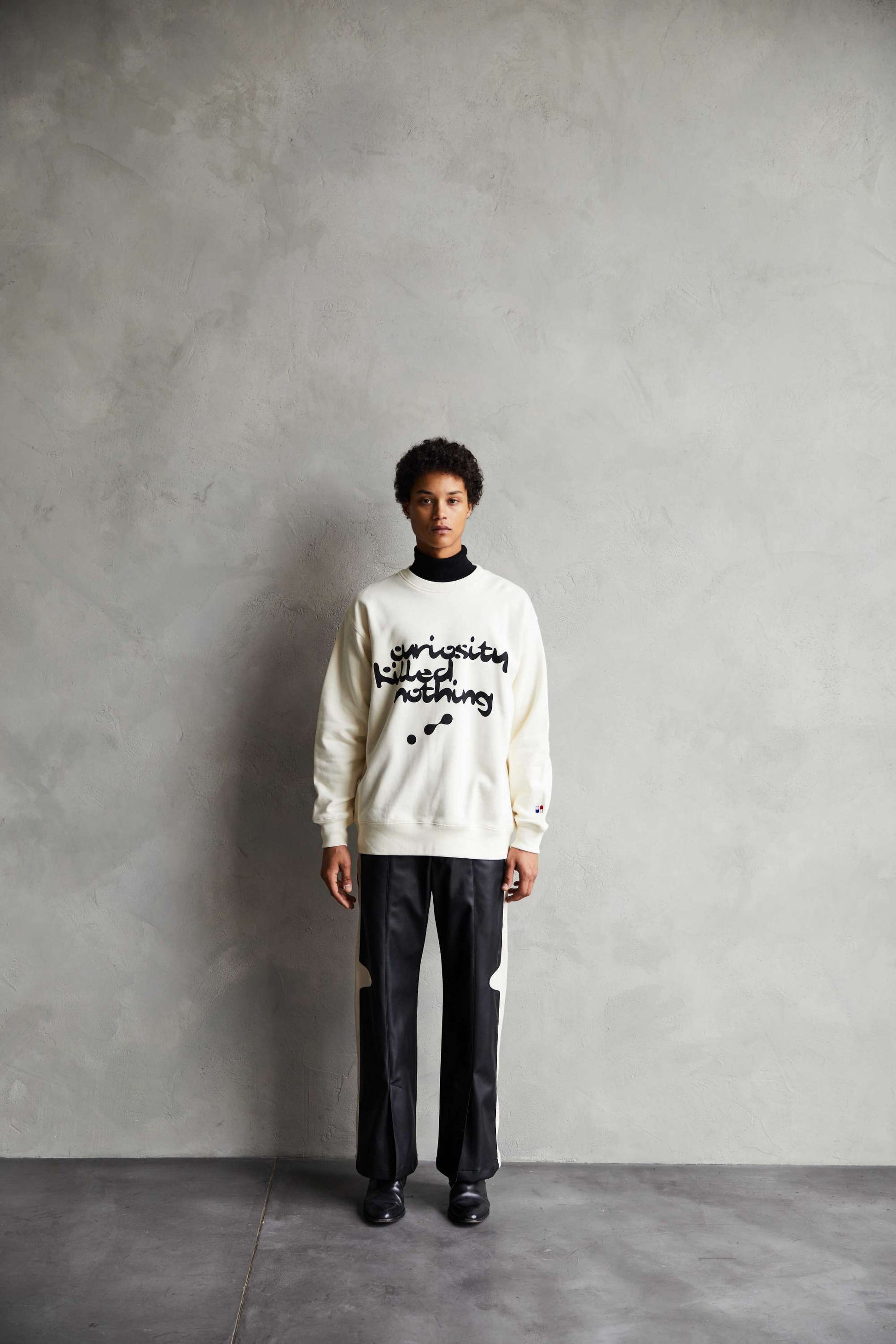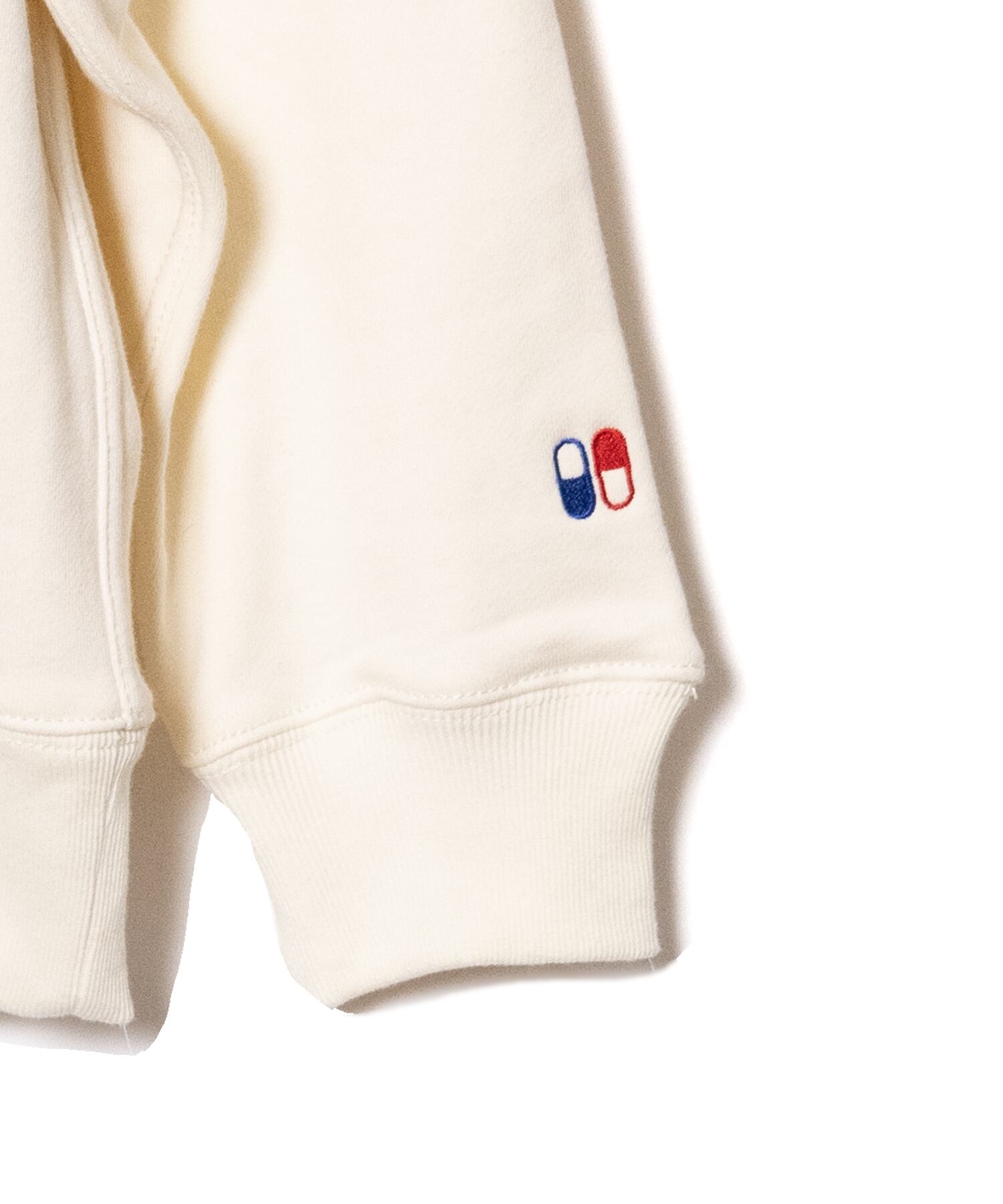 “Curiosity Killed Nothing” A paradoxical message to the old American proverb, “Too much curiosity is a recipe for disaster.” It means that despite failures, curiosity and initial impulses have driven humans to make new discoveries and evolve. Graphics reminiscent of the Chemical Brothers, who led the electro rave scene. It expresses curiosity in search of a trip feeling. The left cuff is embroidered with a Red Pill/Blue Pill motif that represents choice.