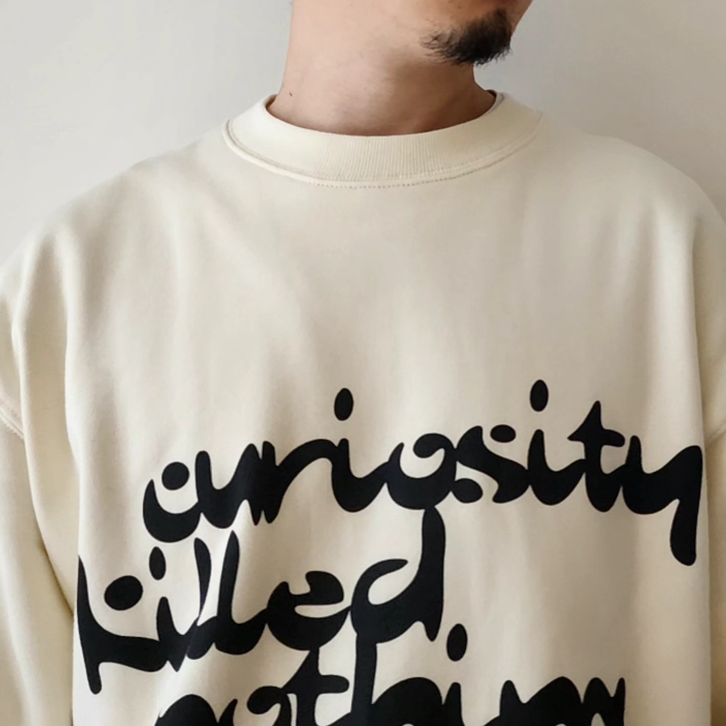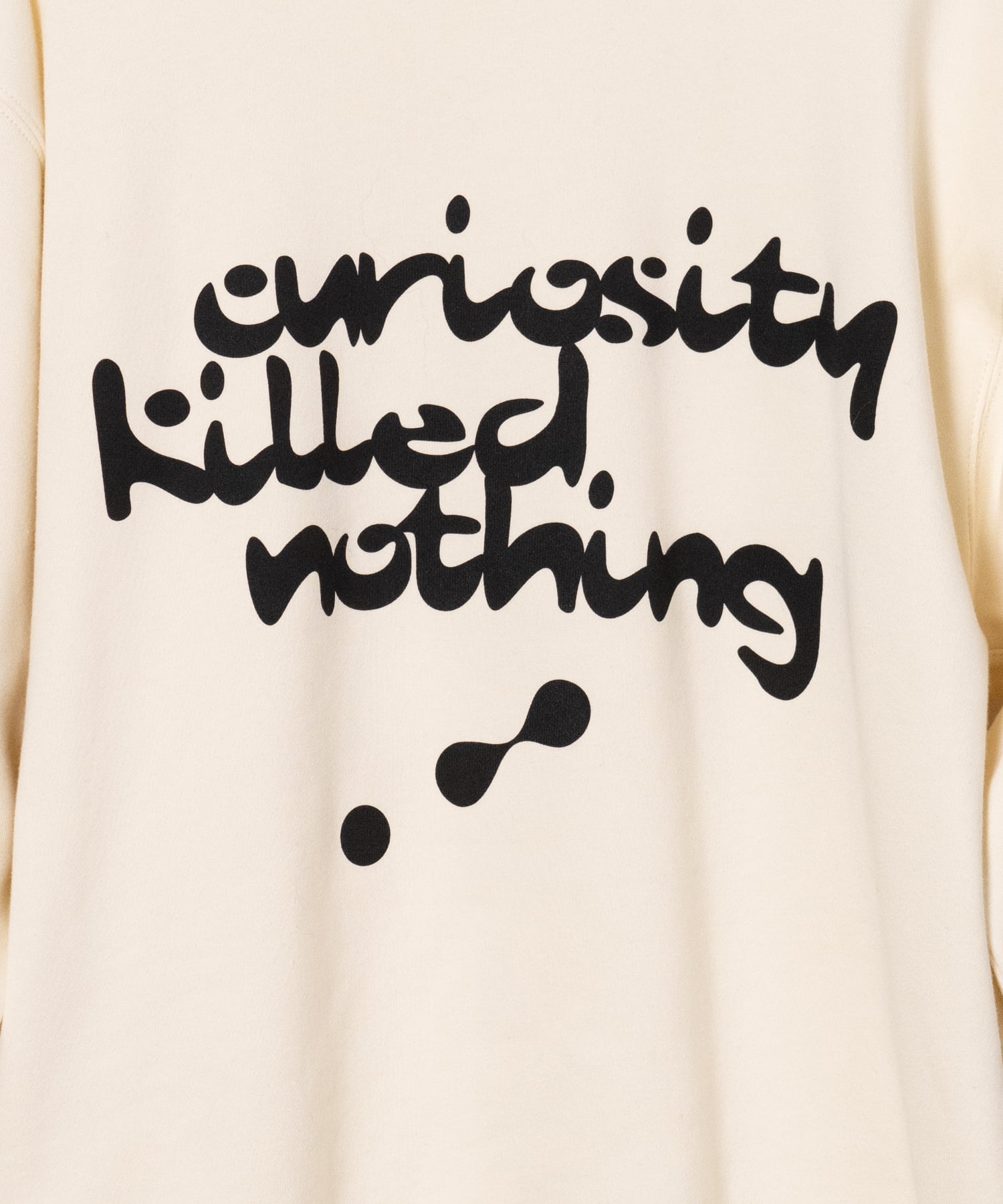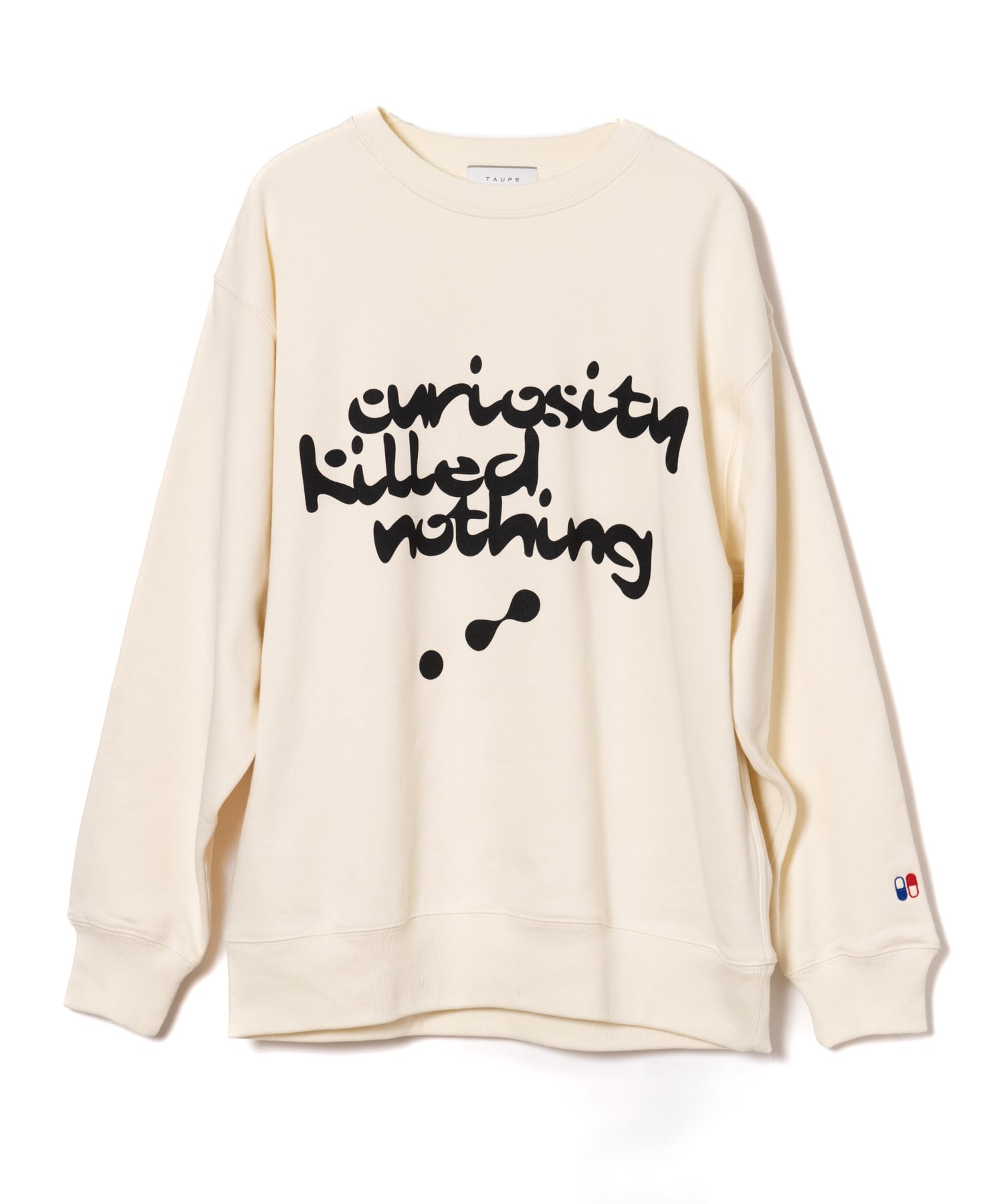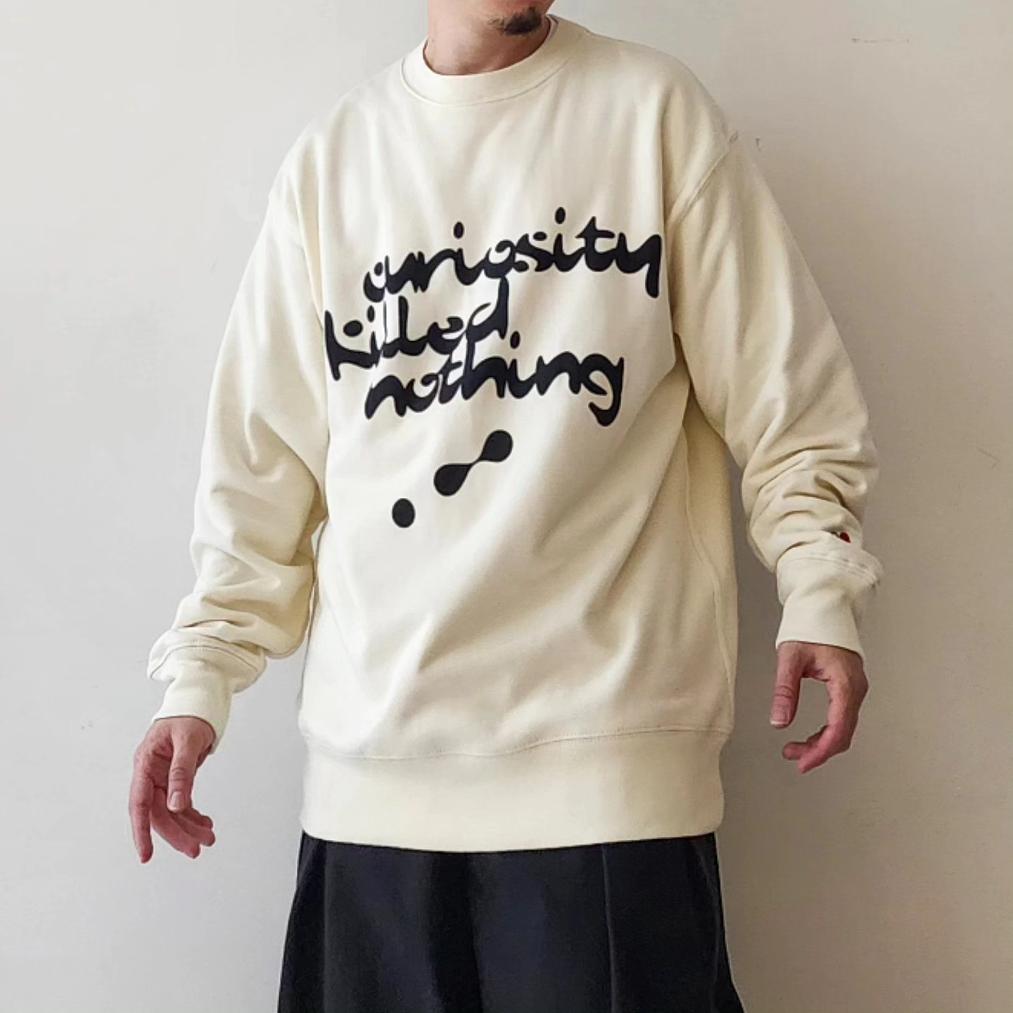 “Curiosity Killed Nothing” A paradoxical message to the old American proverb, “Too much curiosity is a recipe for disaster.” It means that despite failures, curiosity and initial impulses have driven humans to make new discoveries and evolve. Graphics reminiscent of the Chemical Brothers, who led the electro rave scene. It expresses curiosity in search of a trip feeling. The left cuff is embroidered with a Red Pill/Blue Pill motif that represents choice.