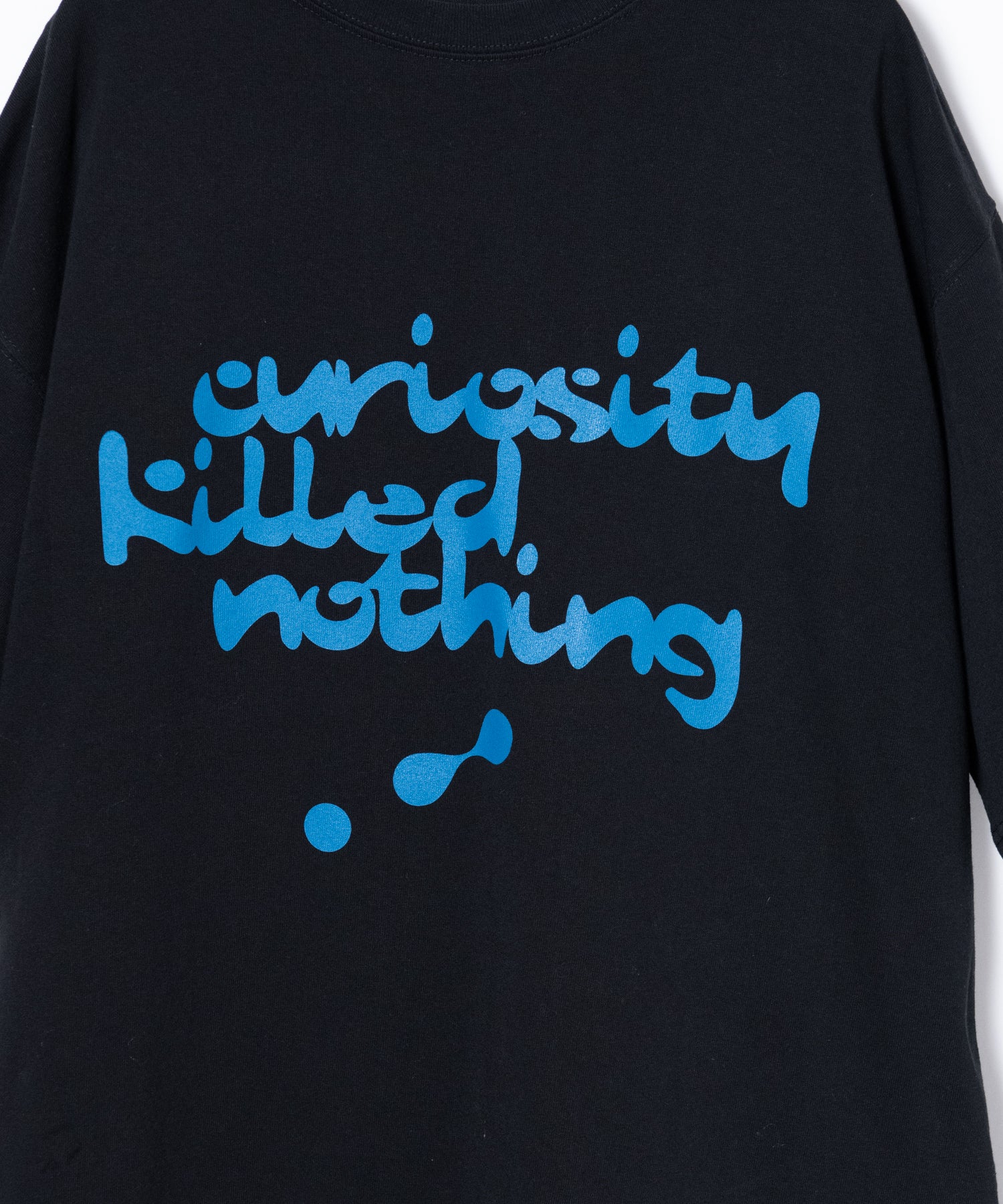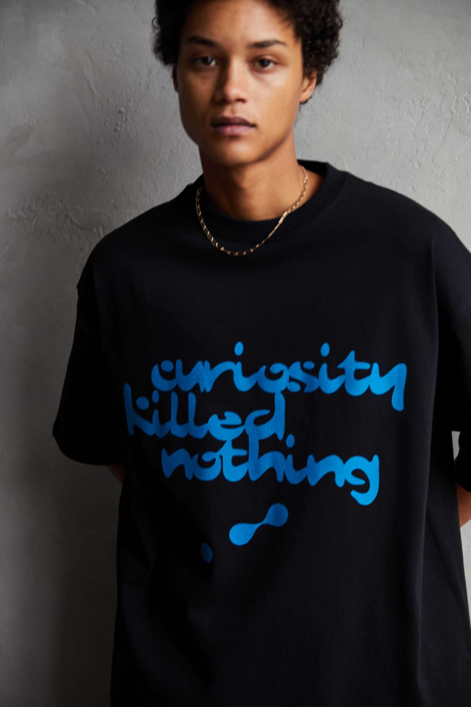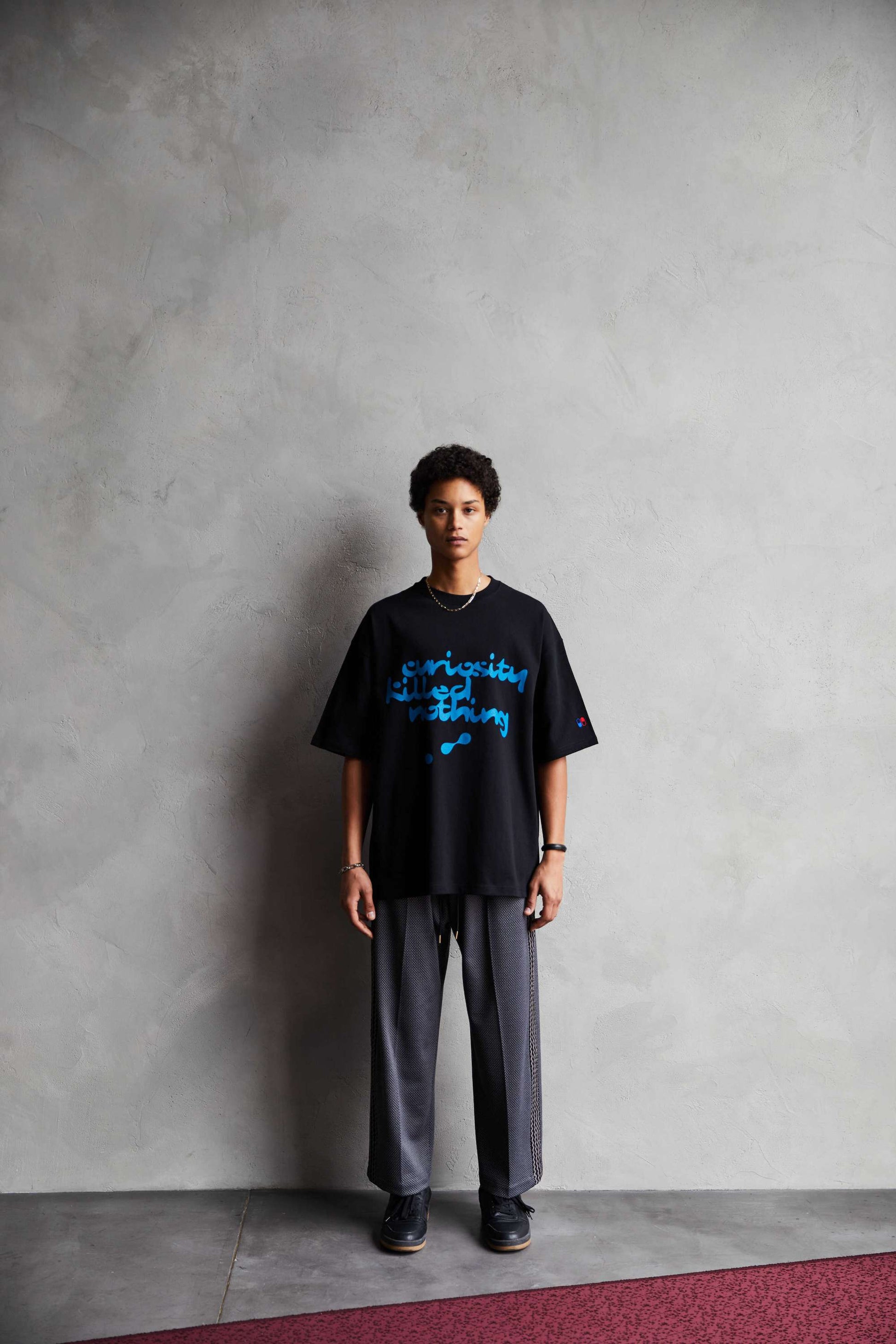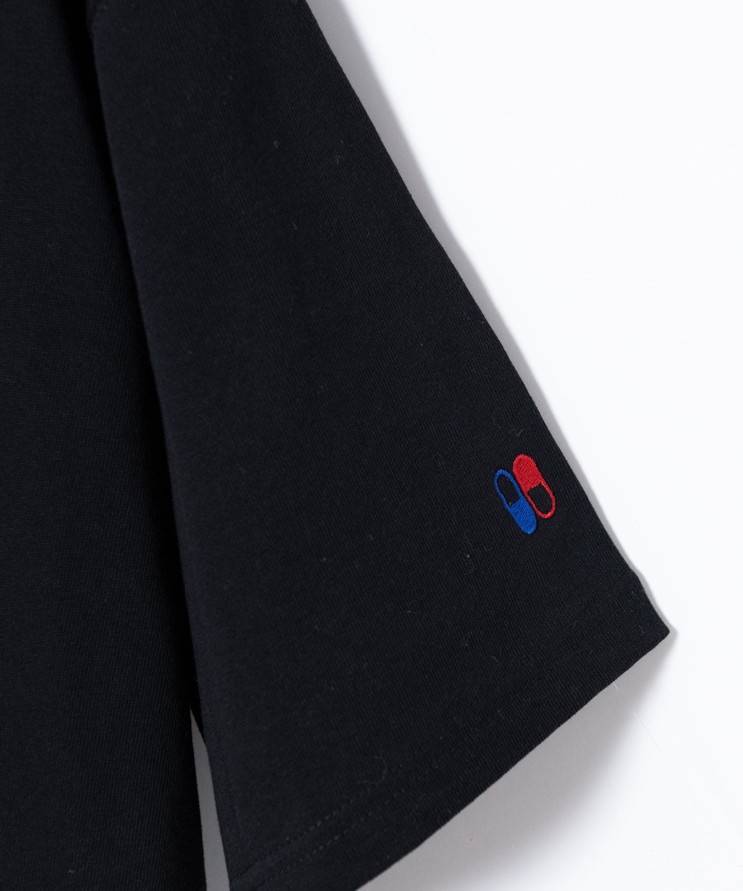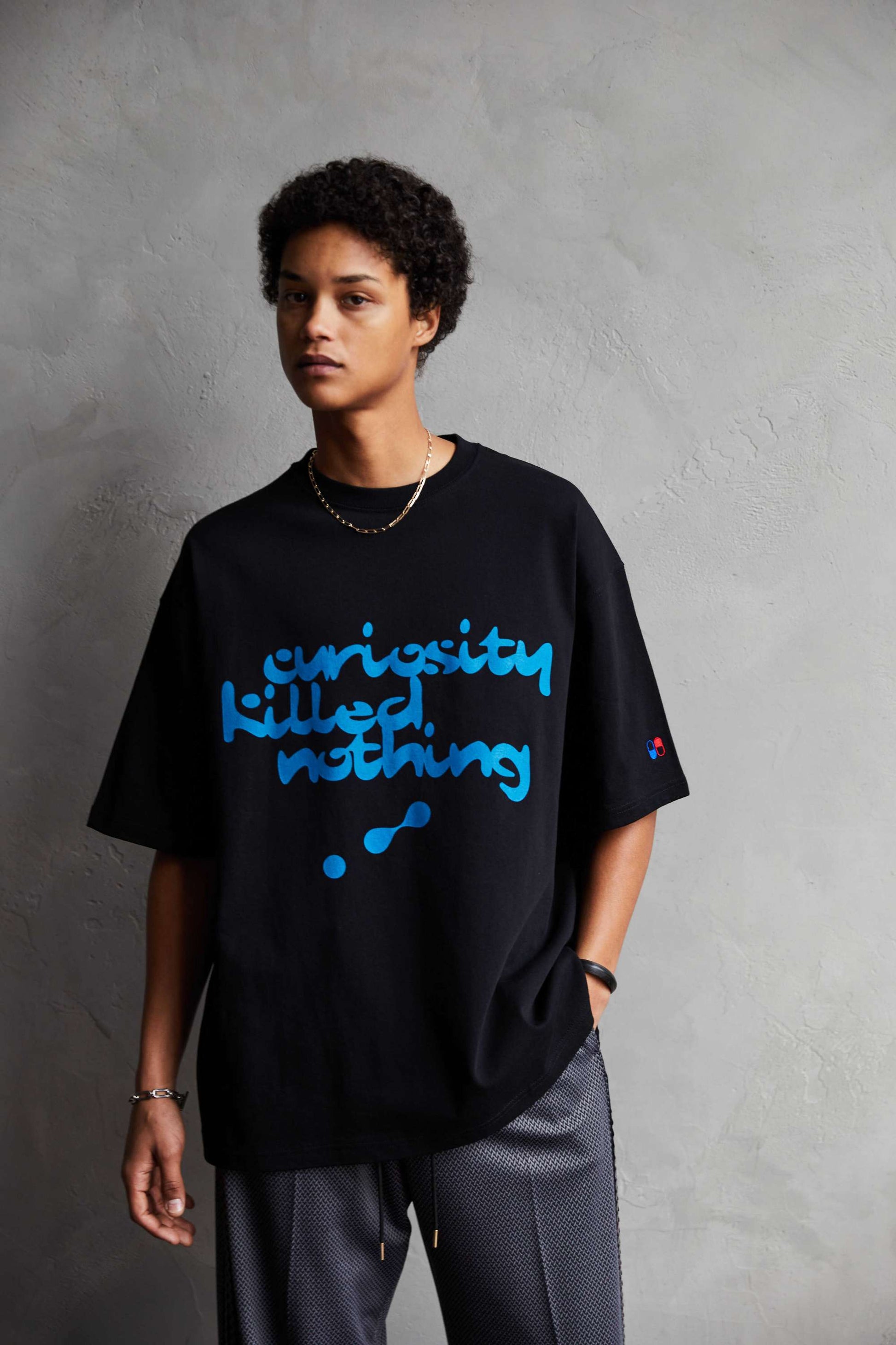 “Curiosity Killed Nothing” A paradoxical message to the old American proverb, “Too much curiosity is a recipe for disaster.” It means that despite failures, curiosity and initial impulses have driven humans to make new discoveries and evolve. Graphics reminiscent of the Chemical Brothers, who led the electro rave scene. It expresses curiosity in search of a trip feeling. The left cuff is embroidered with a Red Pill/Blue Pill motif that represents choice.