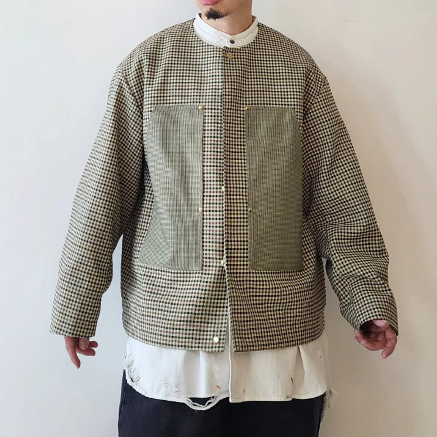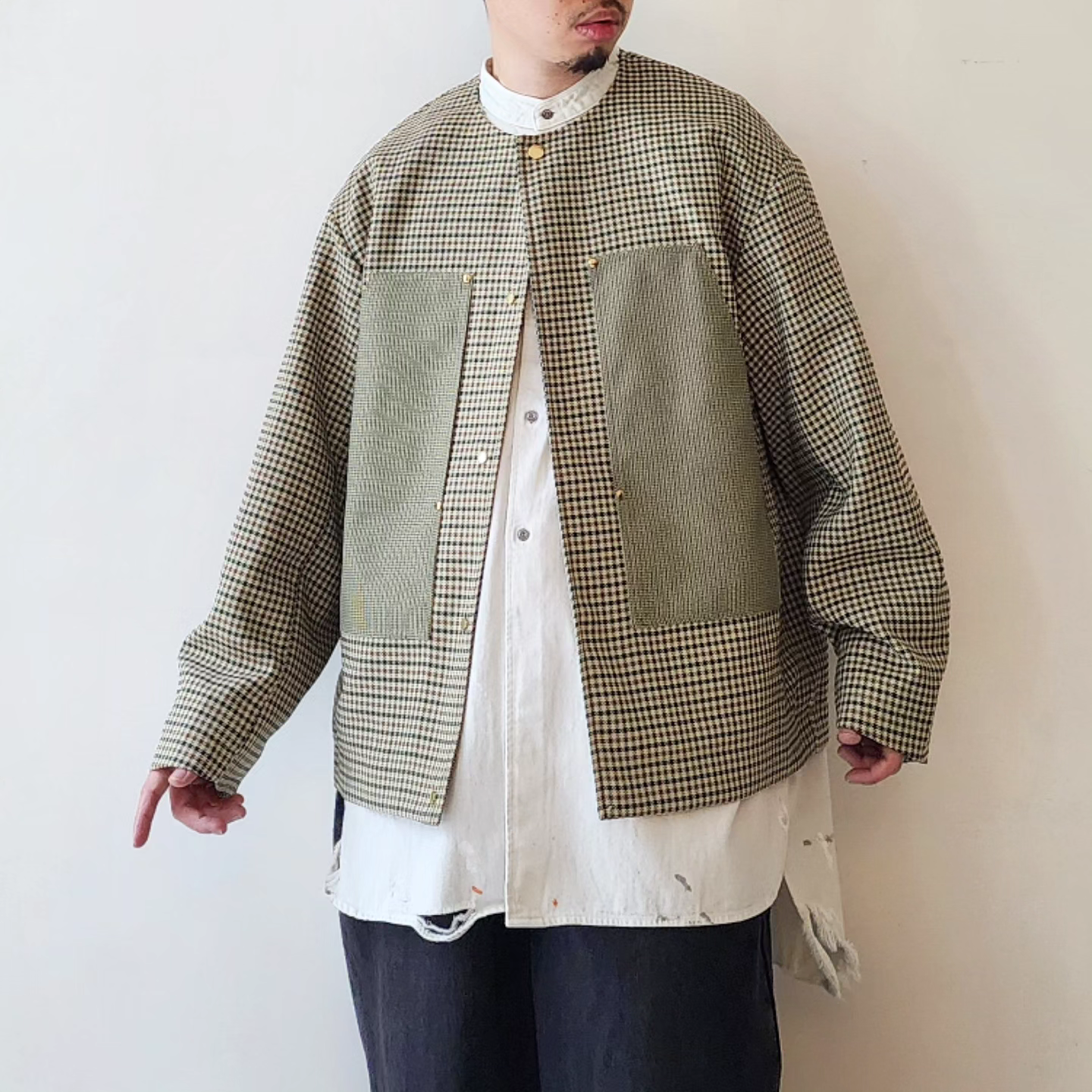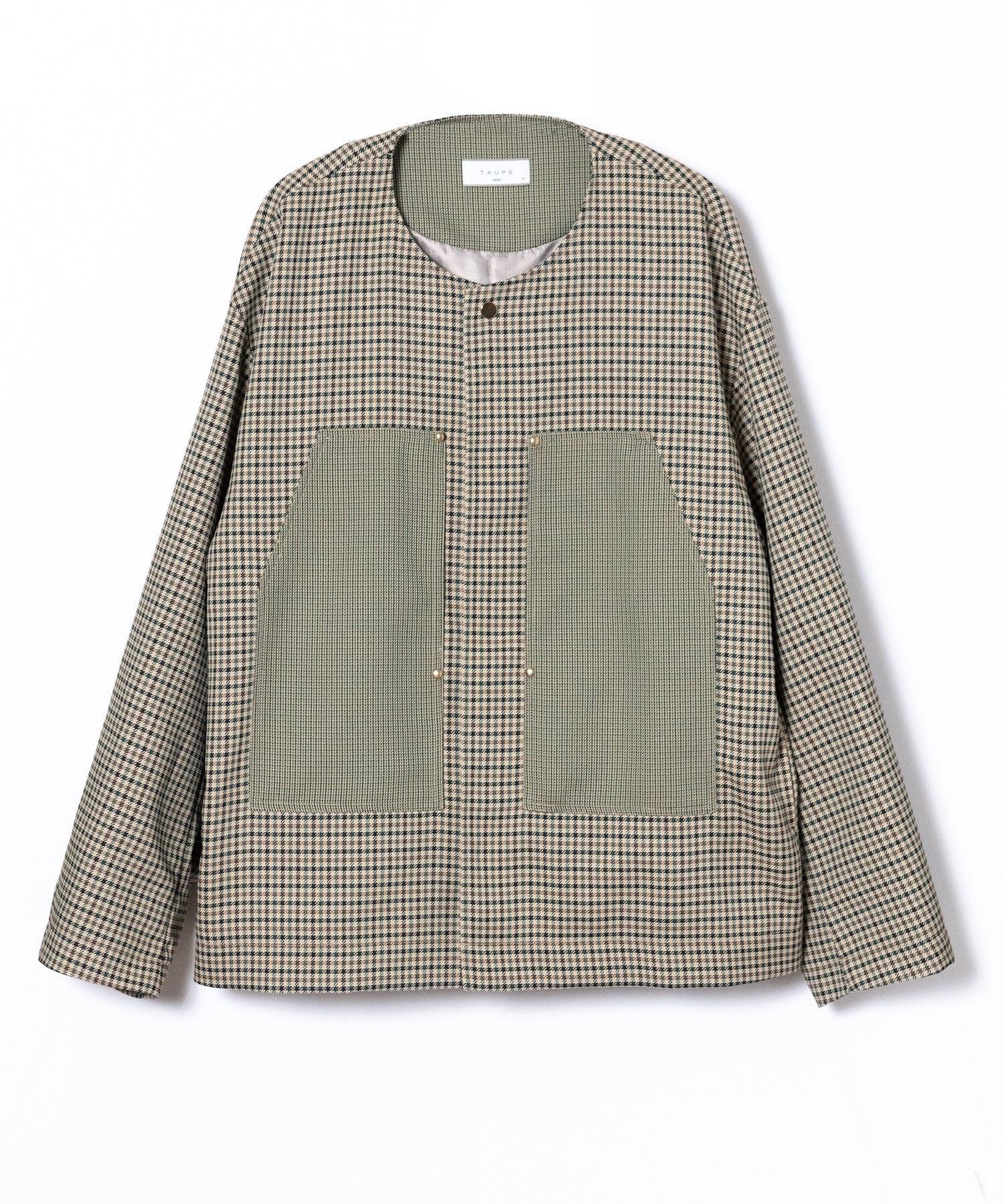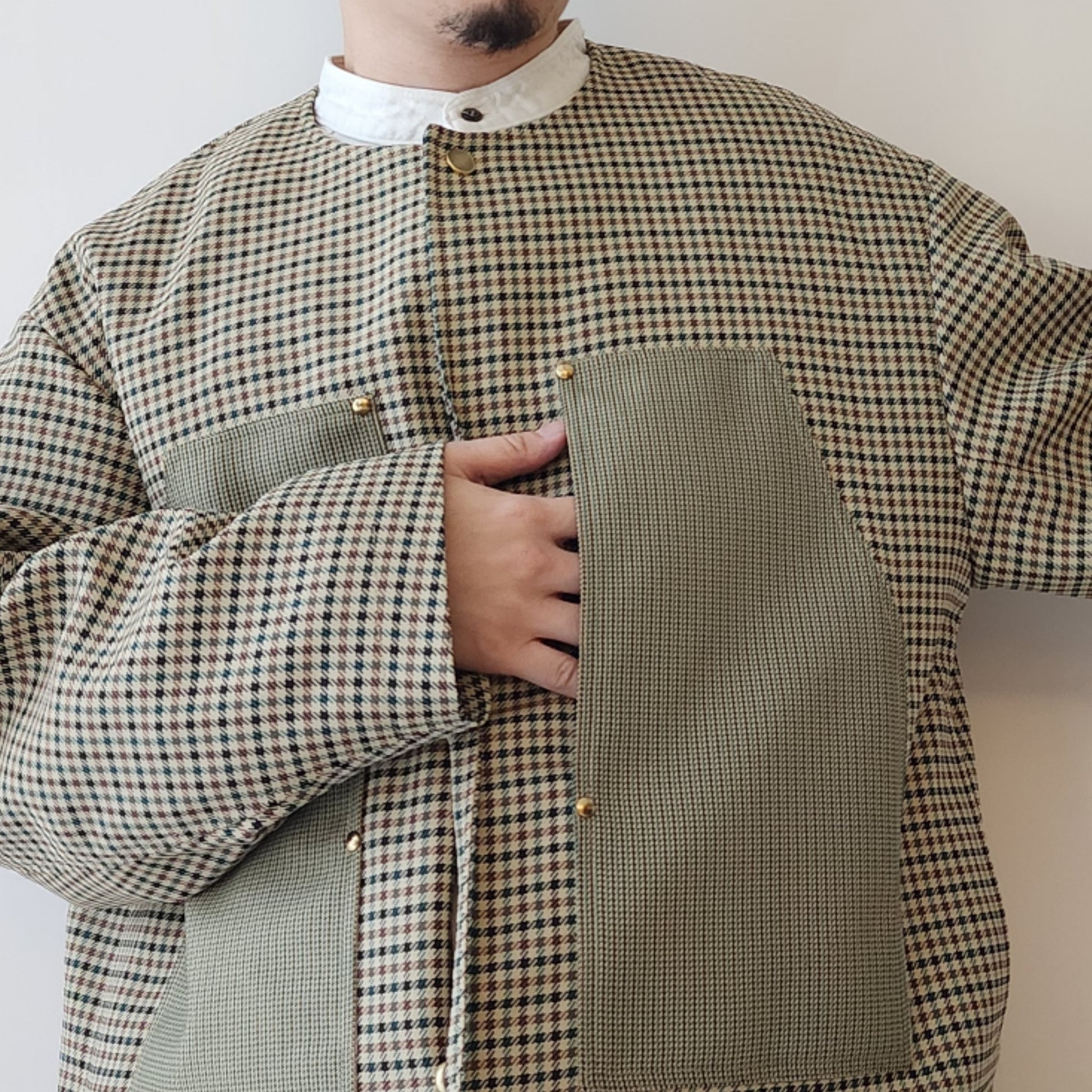 A work design jacket featuring large pockets made of different materials. By making it colorless, we eliminate the unfashionable look and incorporate trendy elements. The combination of an elegant British check pattern creates a unique design point. There are also hidden pockets in the side seams, making it extremely convenient to use.