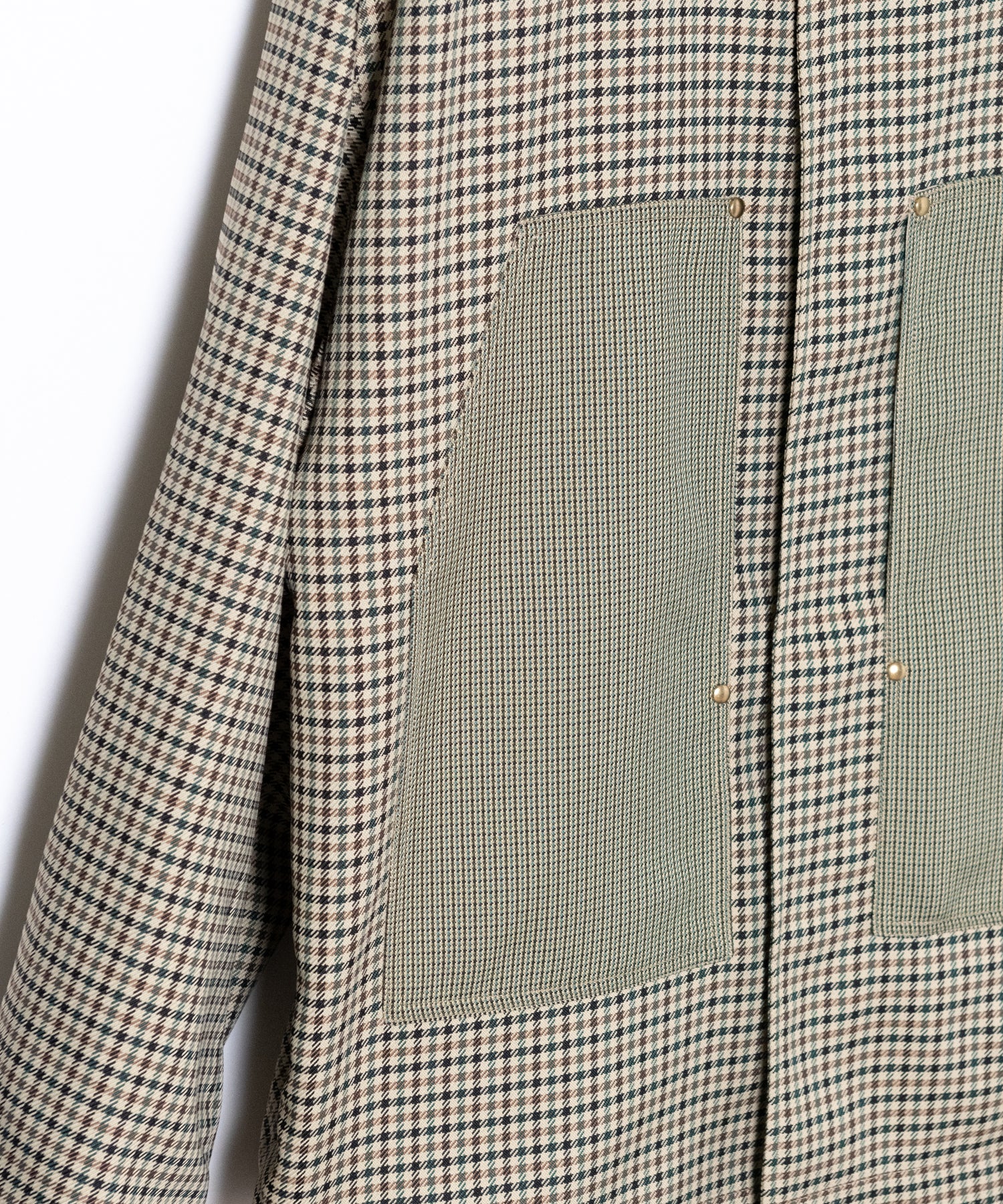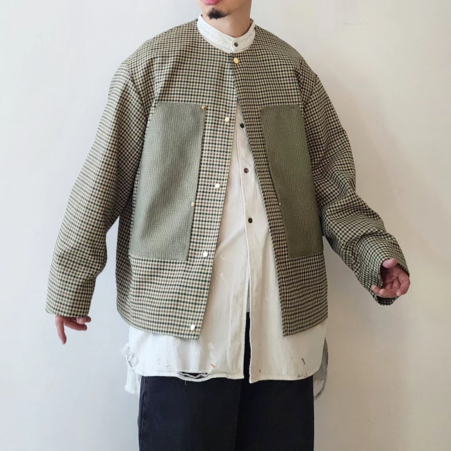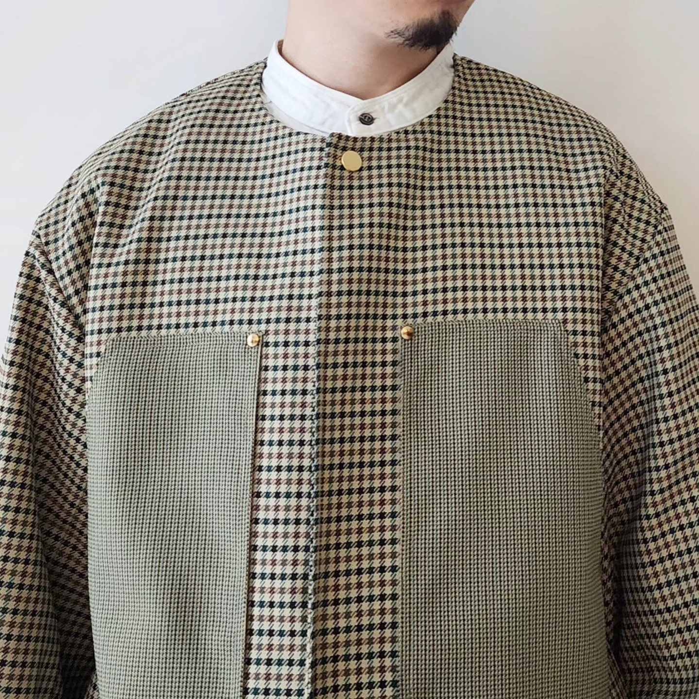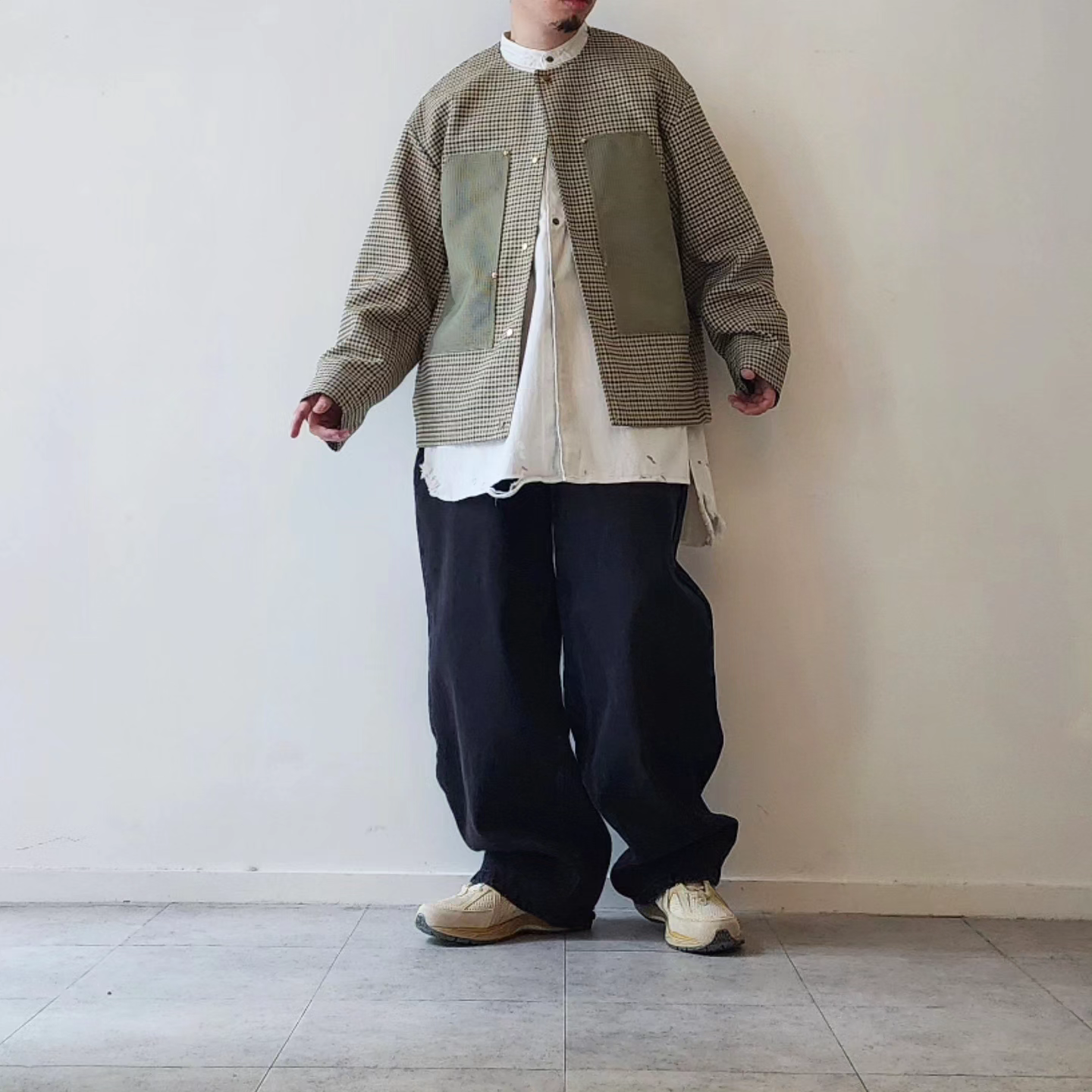 A work design jacket featuring large pockets made of different materials. By making it colorless, we eliminate the unfashionable look and incorporate trendy elements. The combination of an elegant British check pattern creates a unique design point. There are also hidden pockets in the side seams, making it extremely convenient to use.
