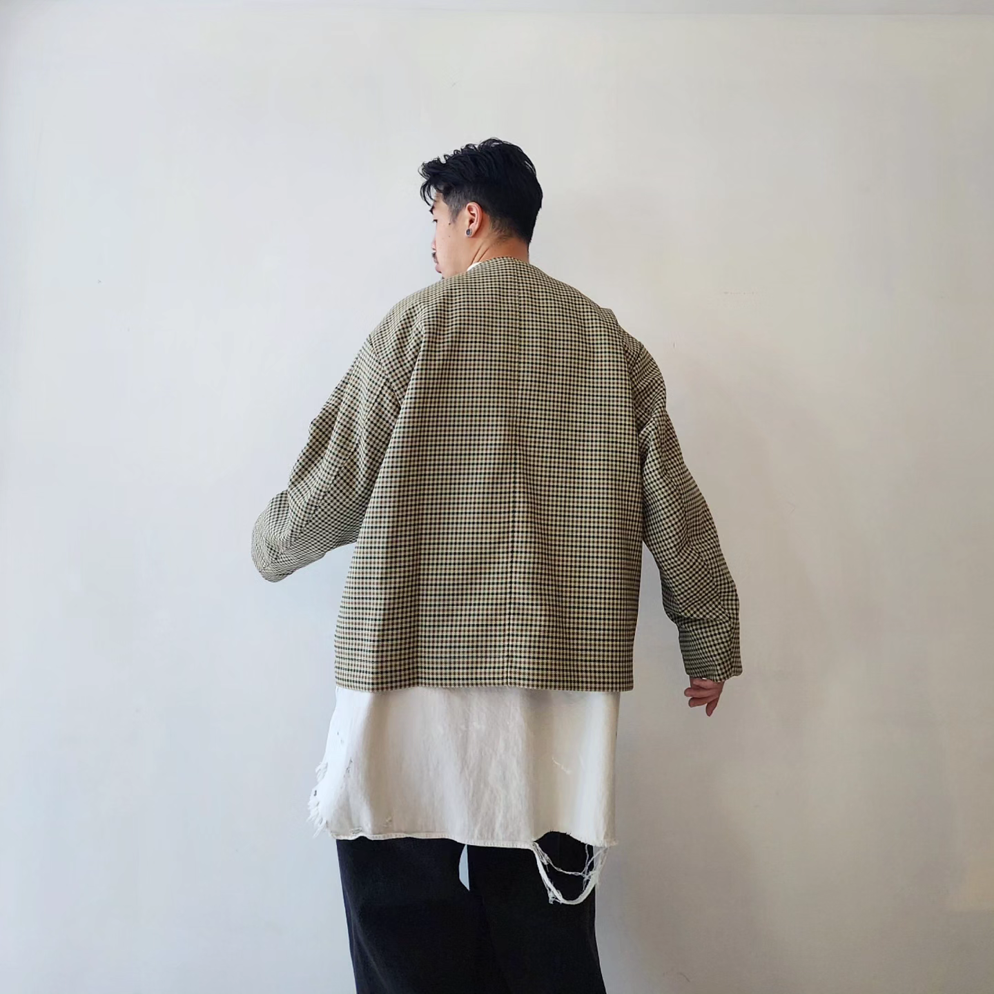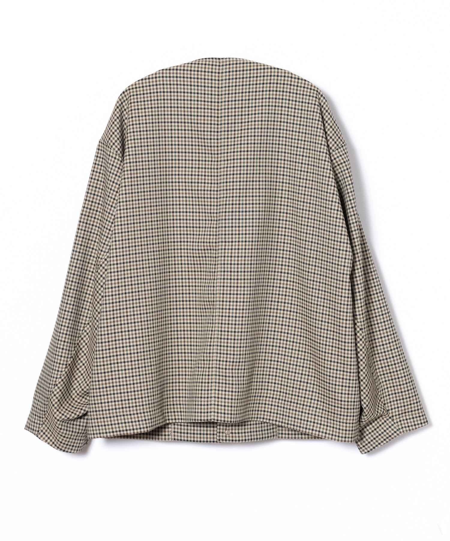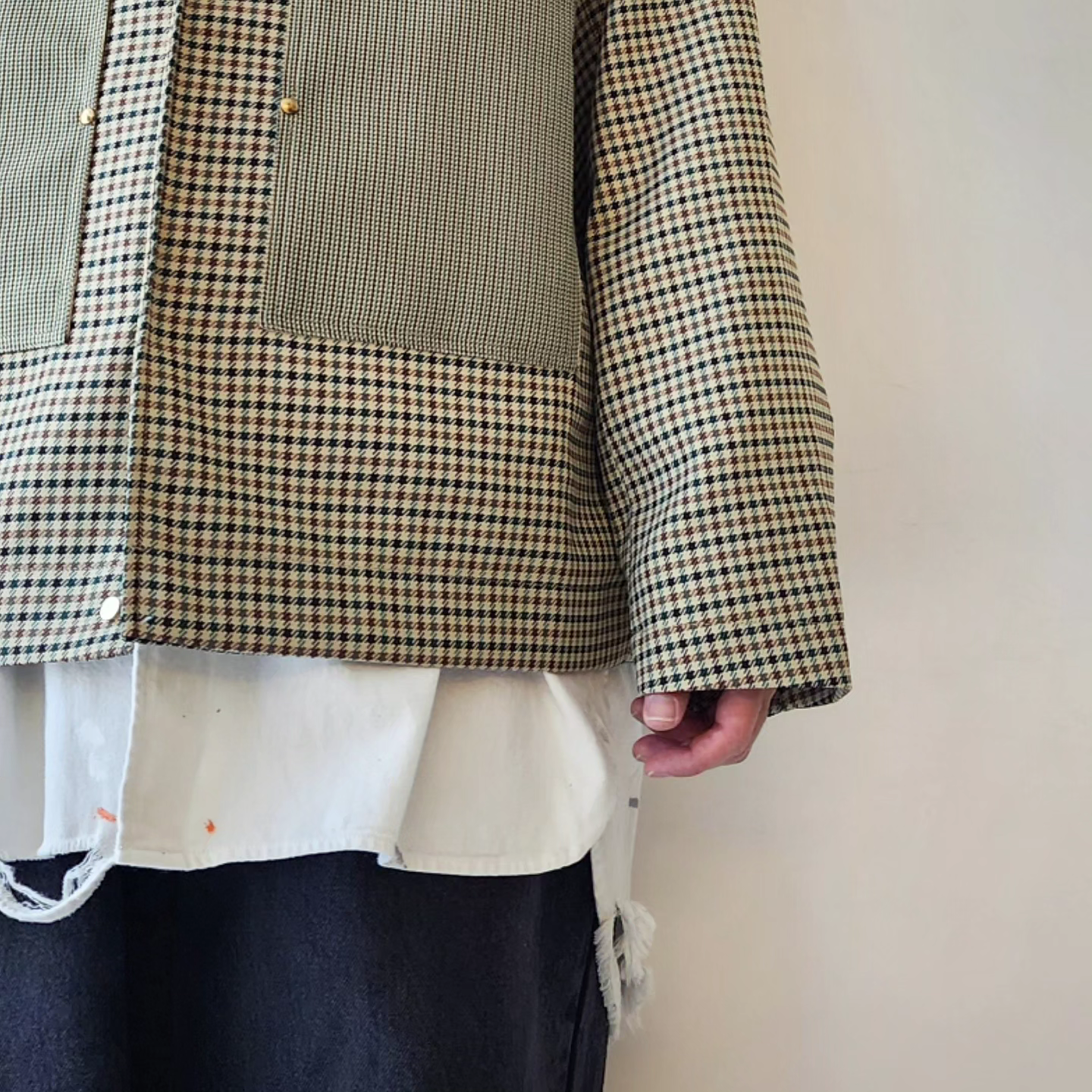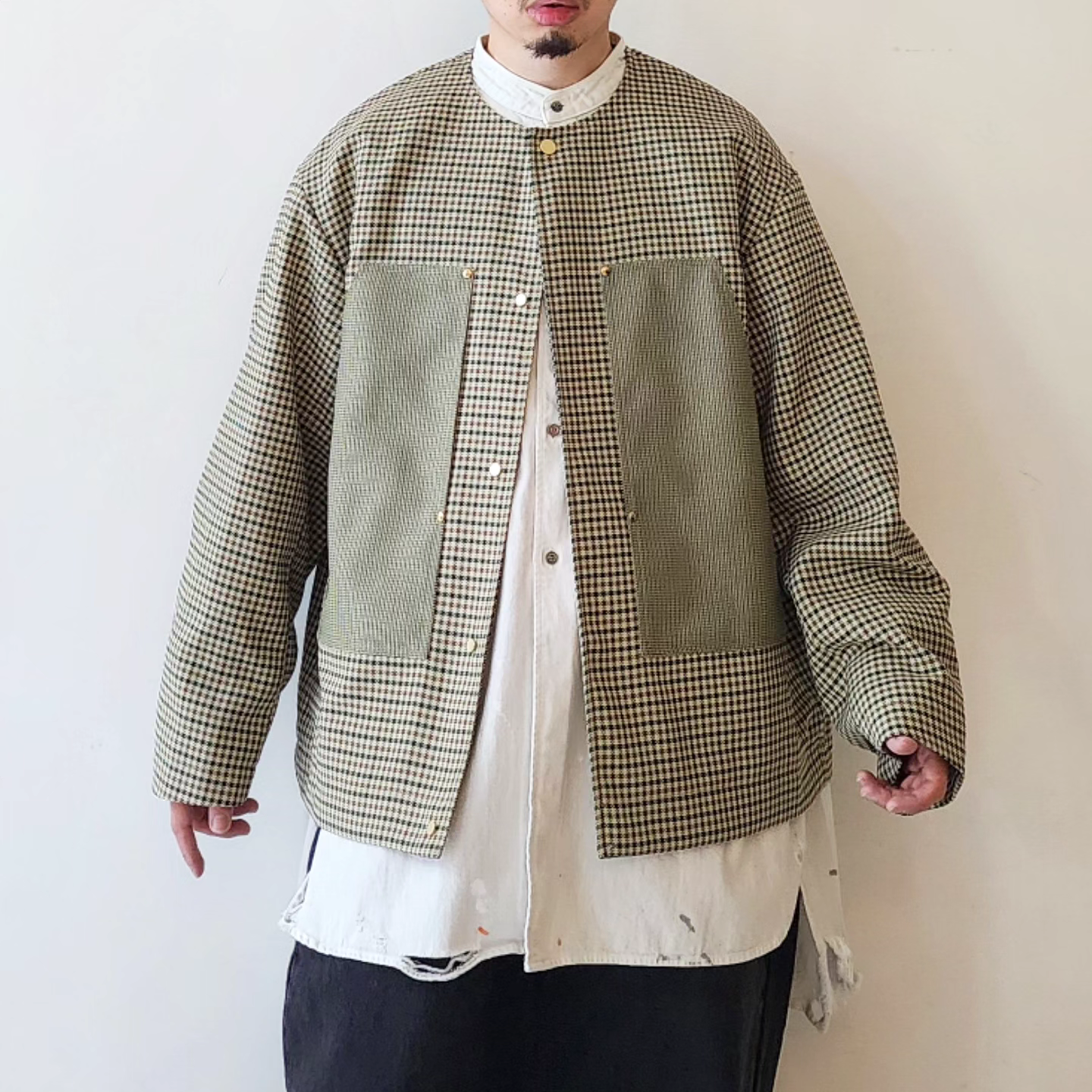 A work design jacket featuring large pockets made of different materials. By making it colorless, we eliminate the unfashionable look and incorporate trendy elements. The combination of an elegant British check pattern creates a unique design point. There are also hidden pockets in the side seams, making it extremely convenient to use.