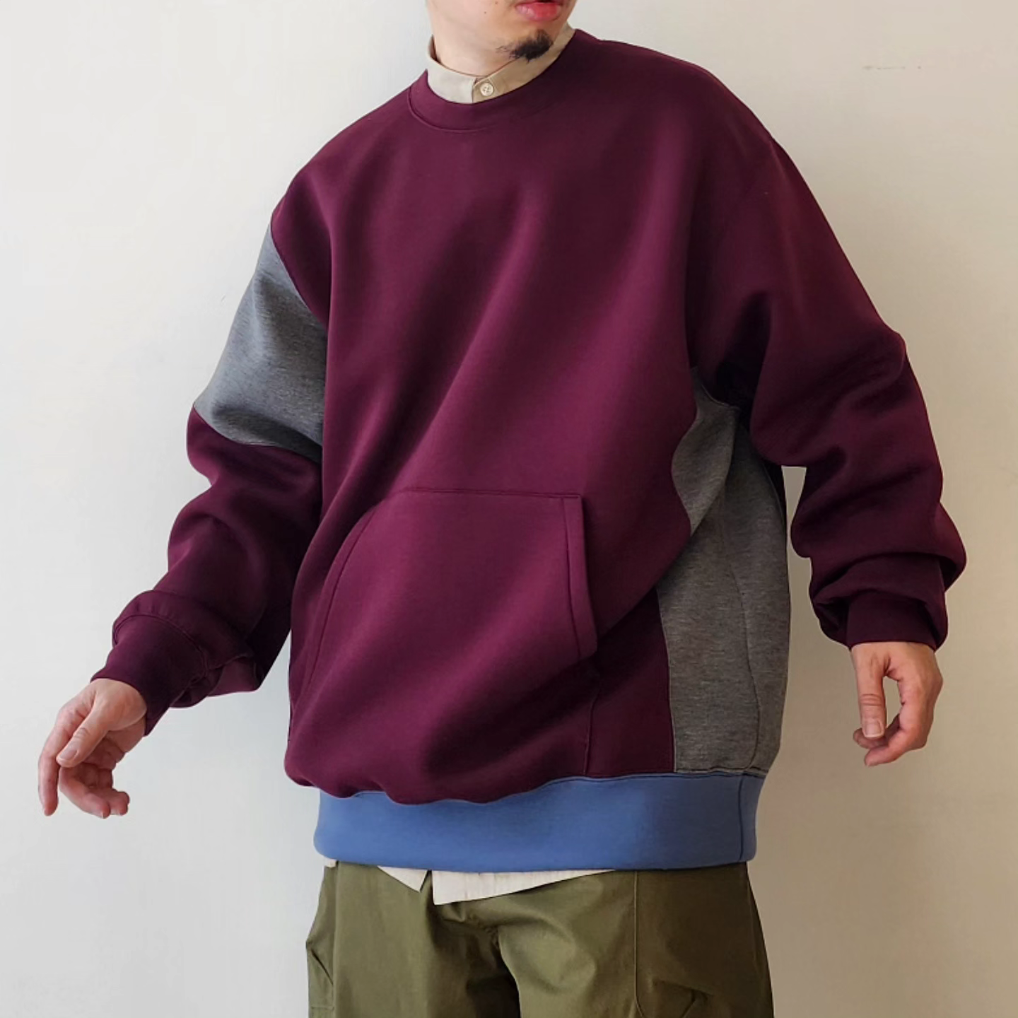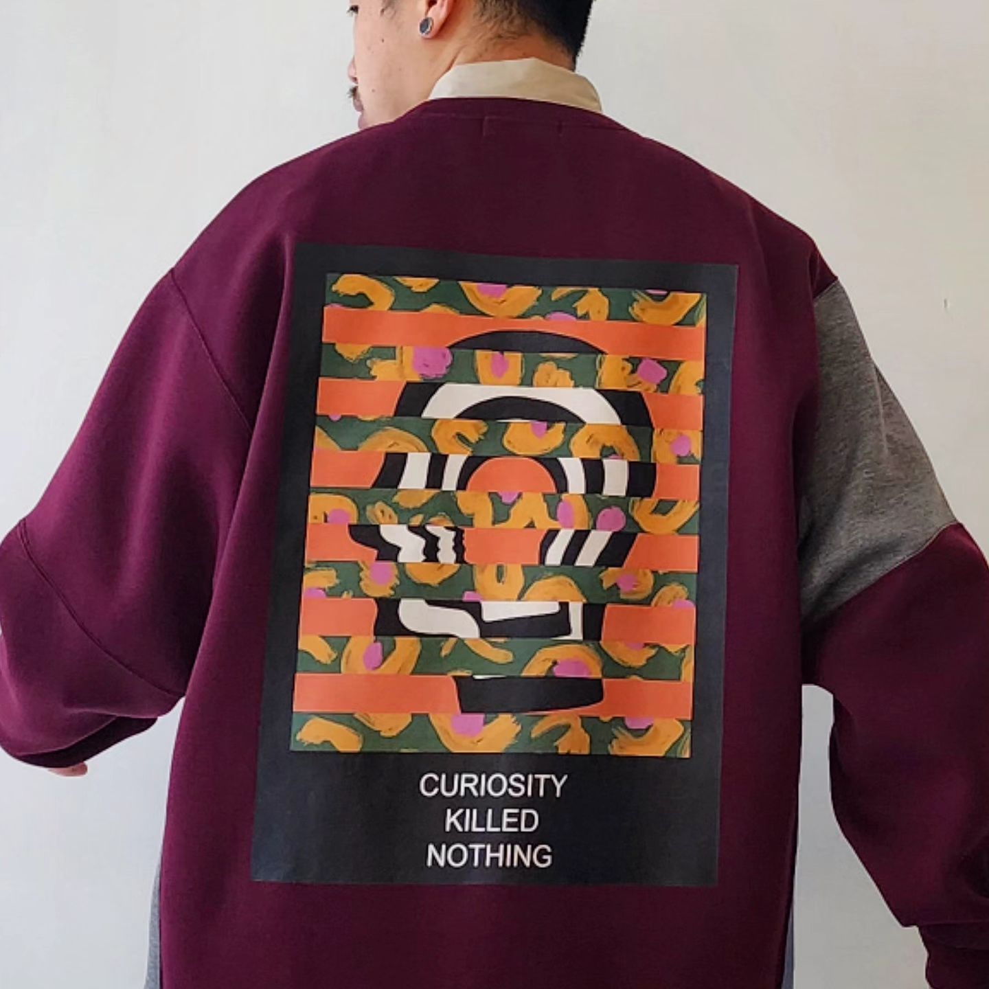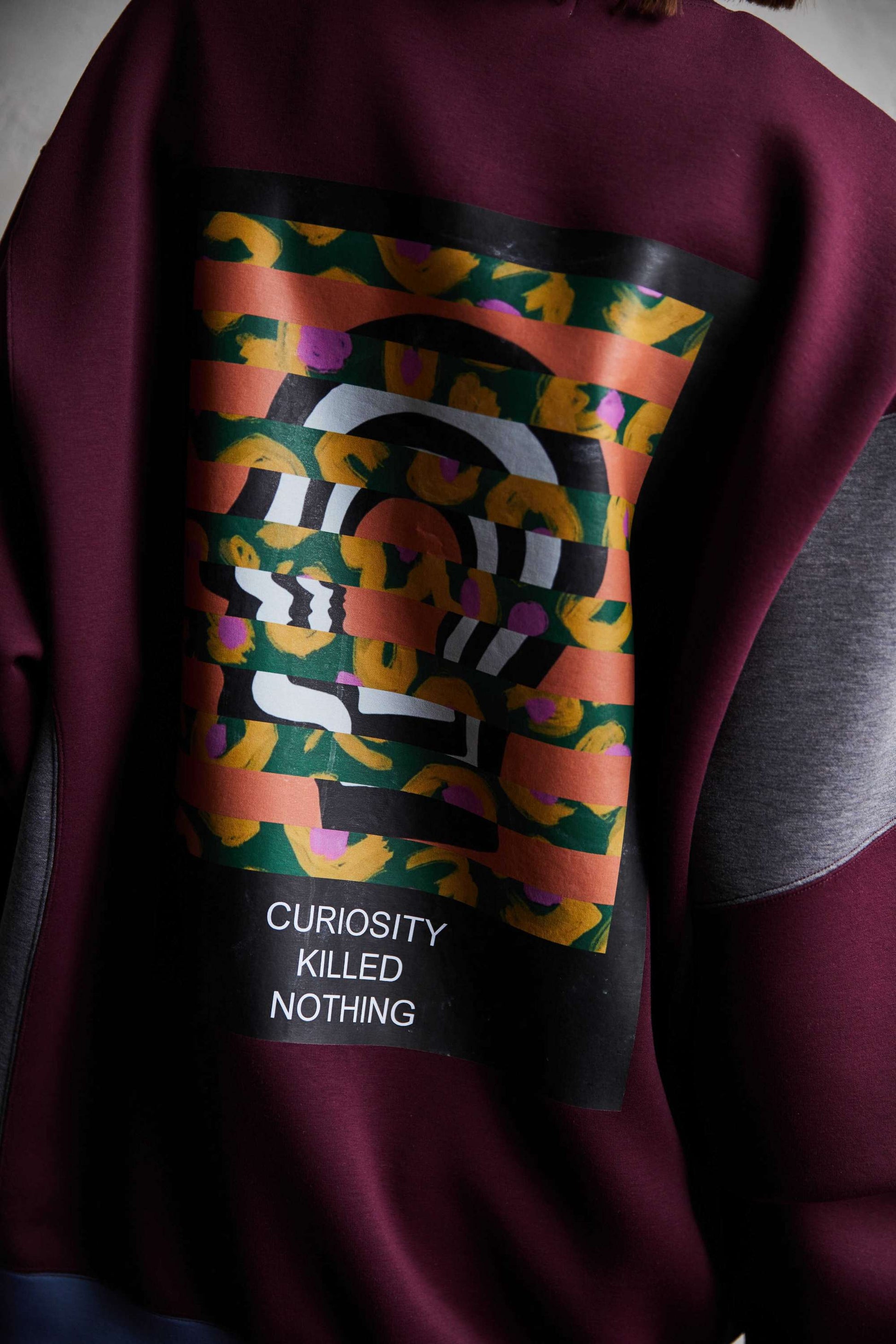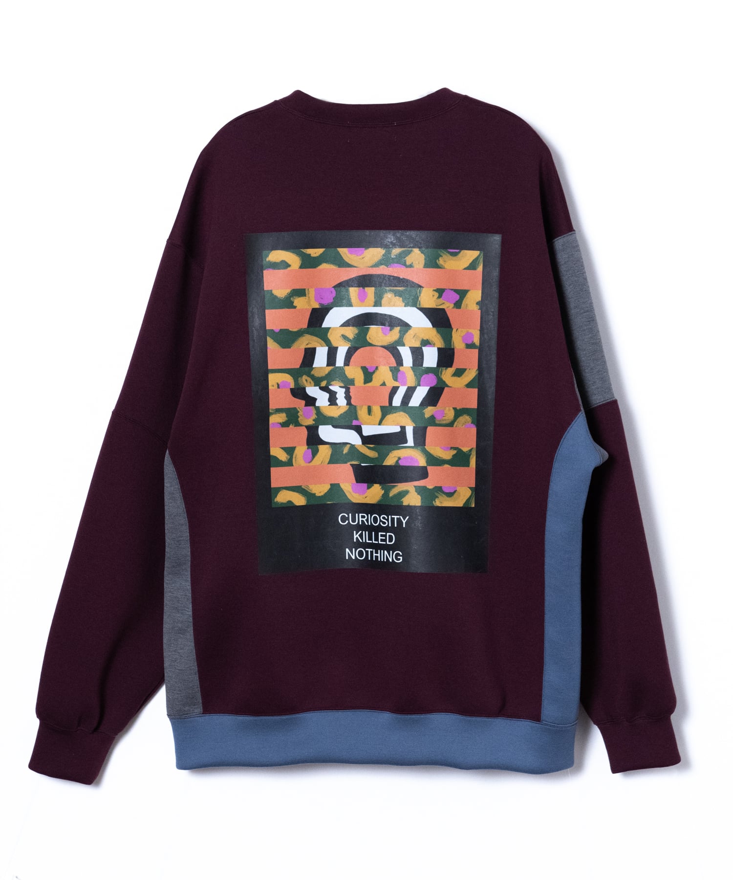 Designed sweatshirt made from cardboard jersey material. It features a panel-shaped color scheme and a back print with a "flower head" motif. A relaxed, rounded silhouette. The switching method creates a piece that has a good design no matter where you look at it. The print uses a transfer printing method with good color reproduction. The song has an ironically funny message: ``My head is a flower garden.''