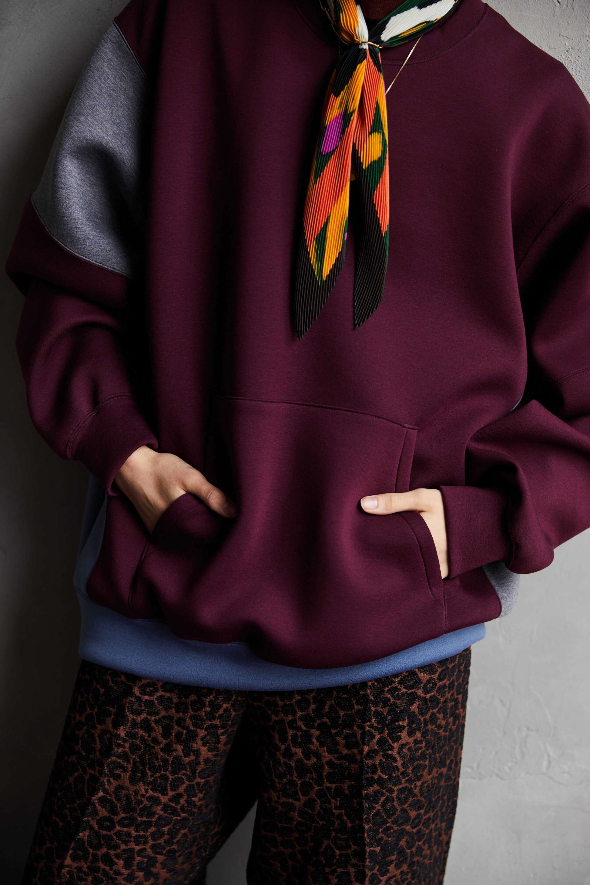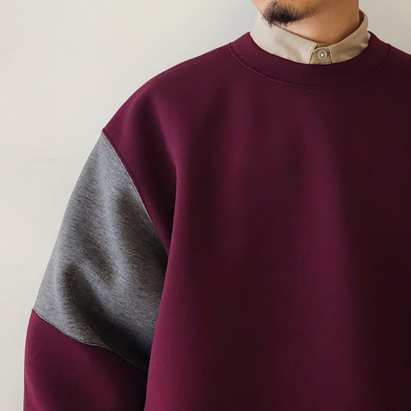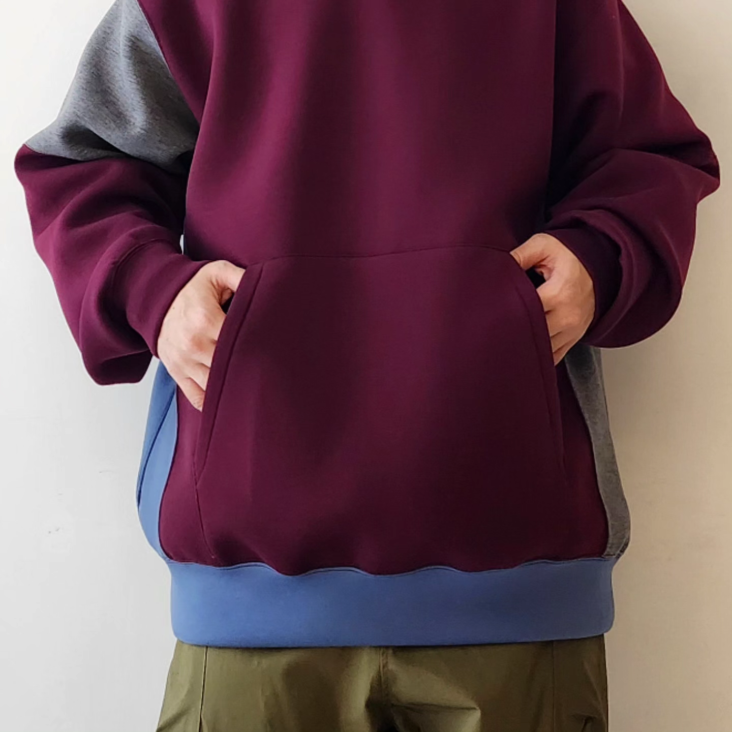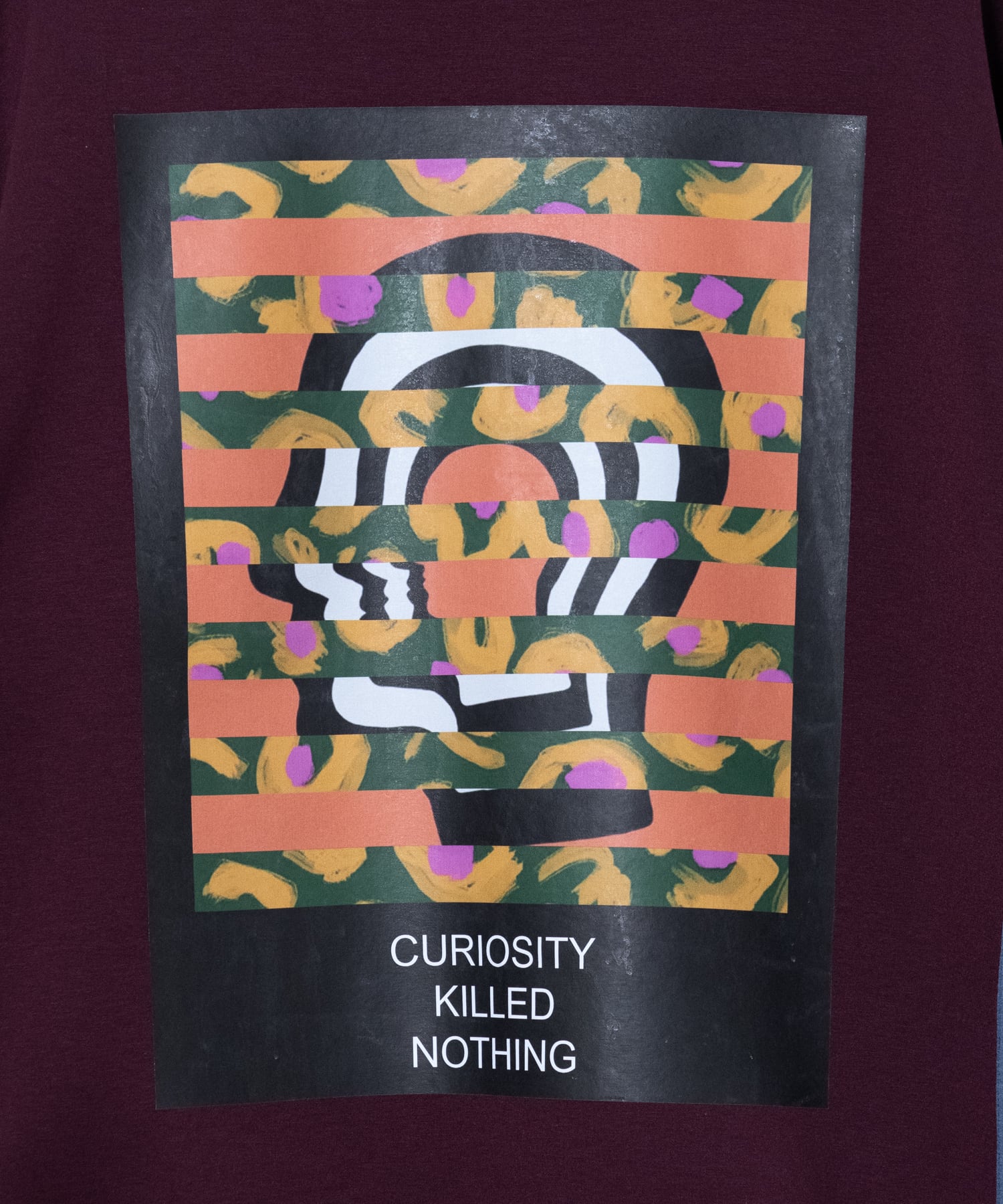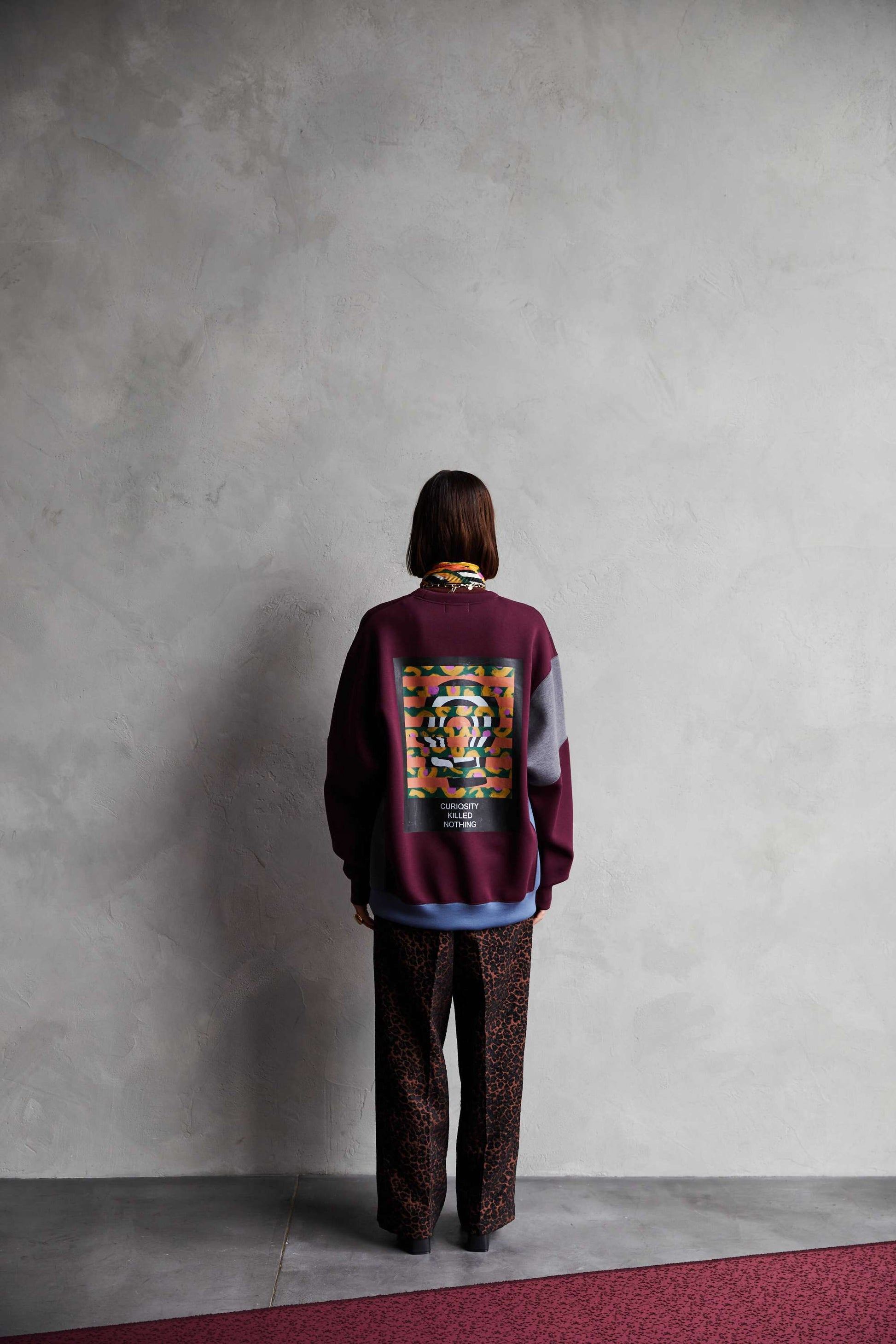 Designed sweatshirt made from cardboard jersey material. It features a panel-shaped color scheme and a back print with a "flower head" motif. A relaxed, rounded silhouette. The switching method creates a piece that has a good design no matter where you look at it. The print uses a transfer printing method with good color reproduction. The song has an ironically funny message: ``My head is a flower garden.''
