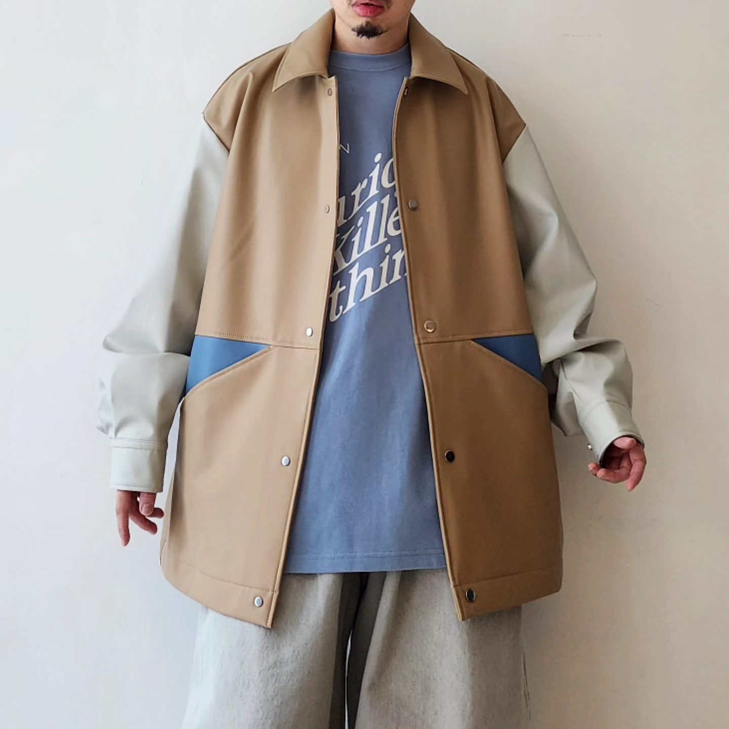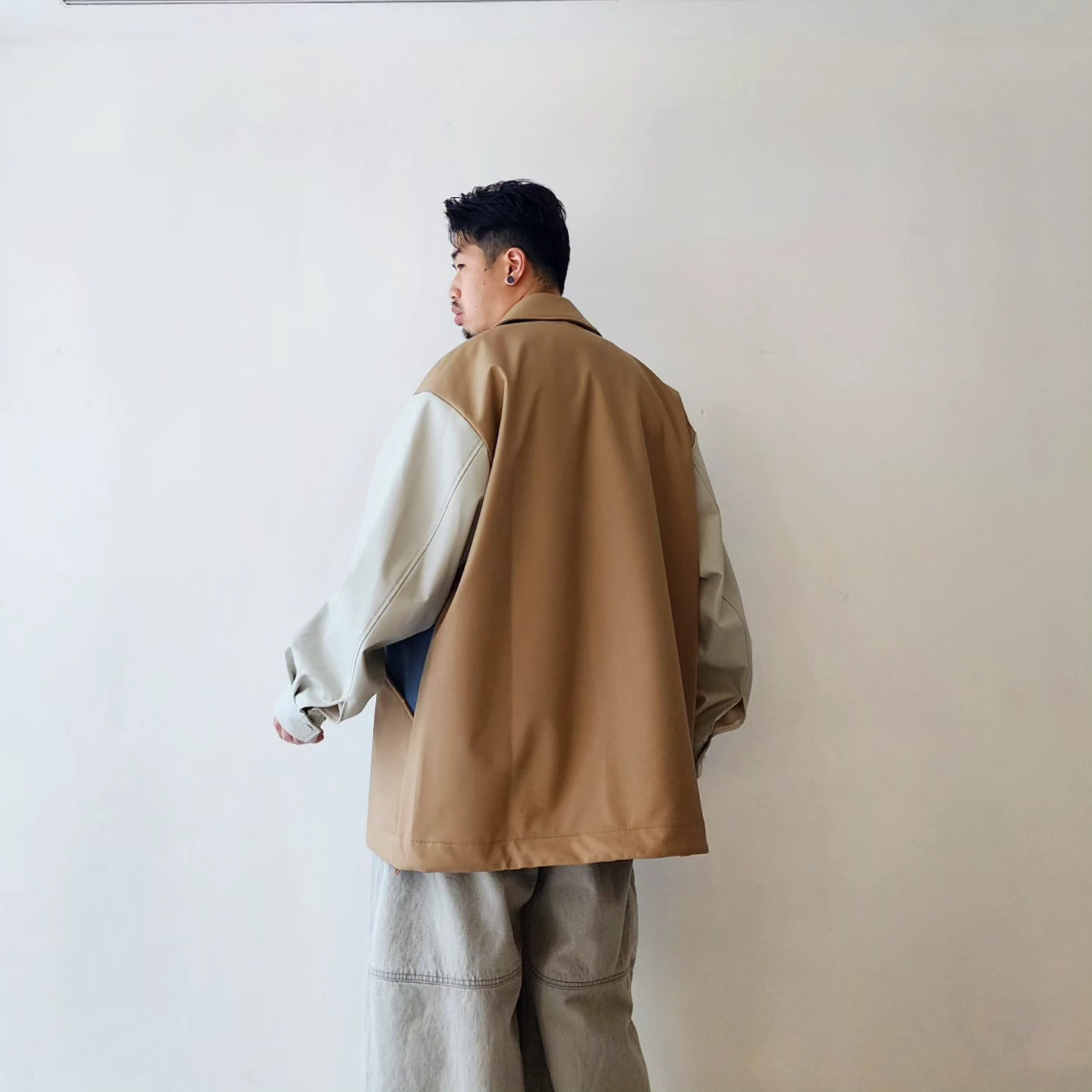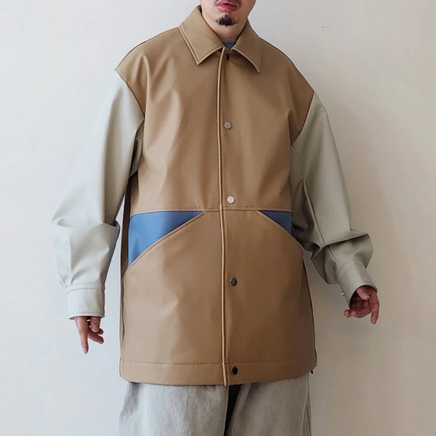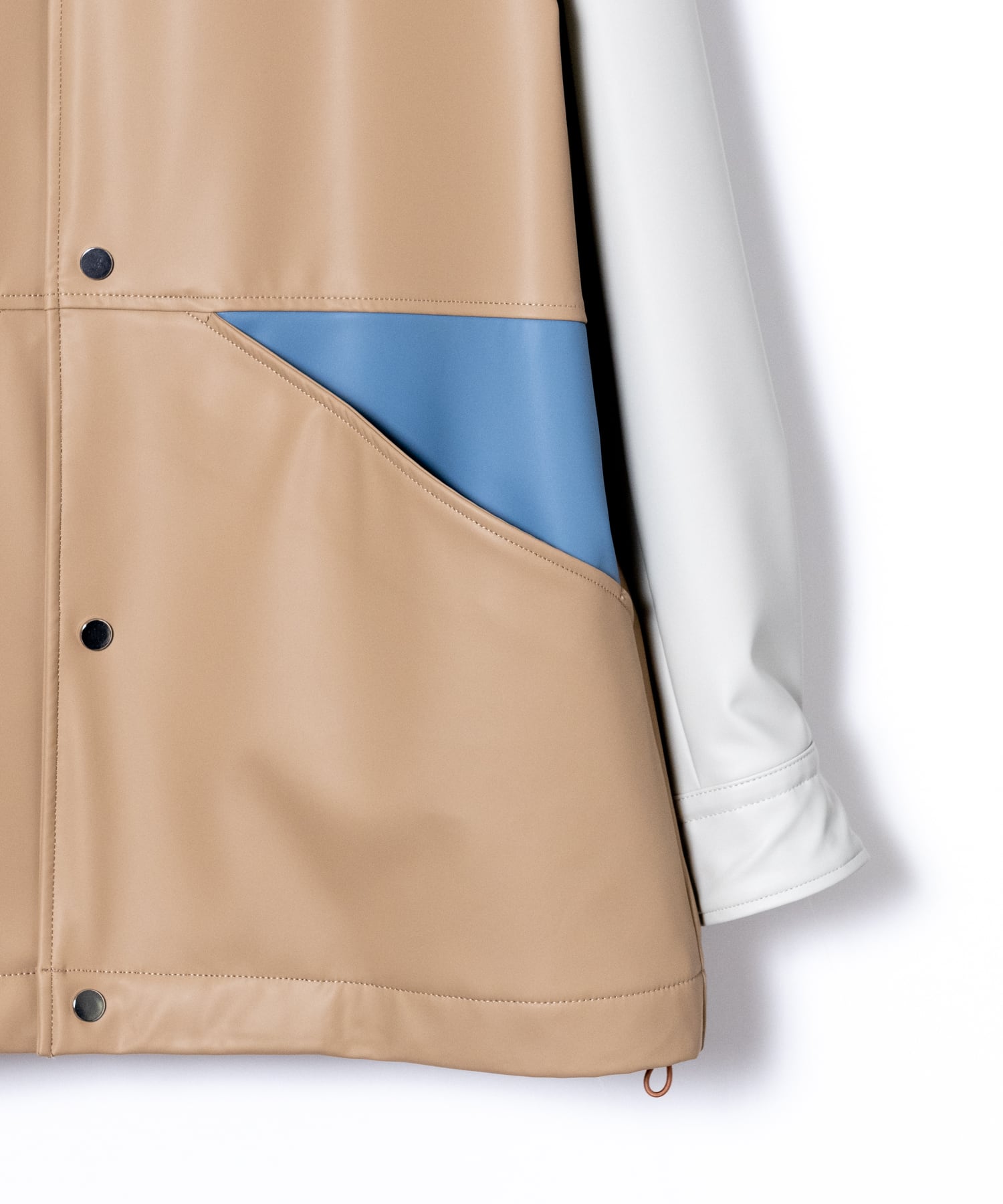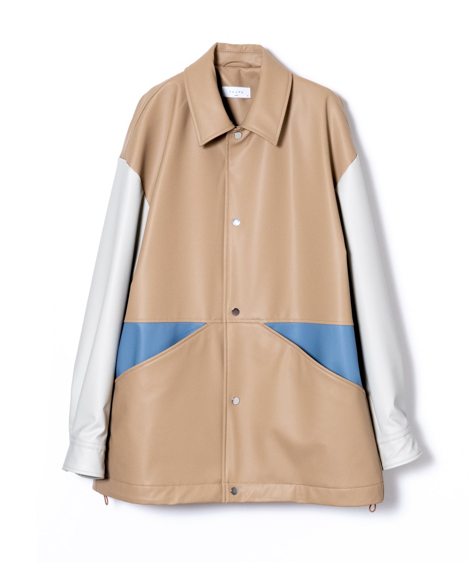 Coach jacket design using leather-like laminate material. Designed with a loose box silhouette with dropped shoulders. Pocket specification that takes advantage of the switching design. By changing the color scheme in a panel shape, we express a sense of playfulness that is unique to TAUPE. The cuffs are cuffed and can be adjusted to 2 levels. The use of flat metal dot buttons adds elegance to a casual coach jacket.