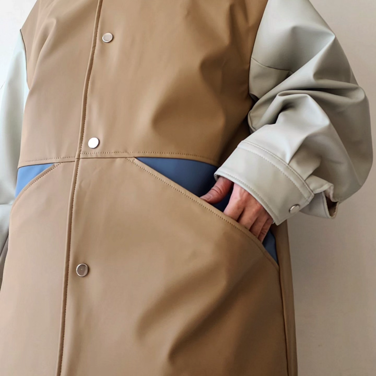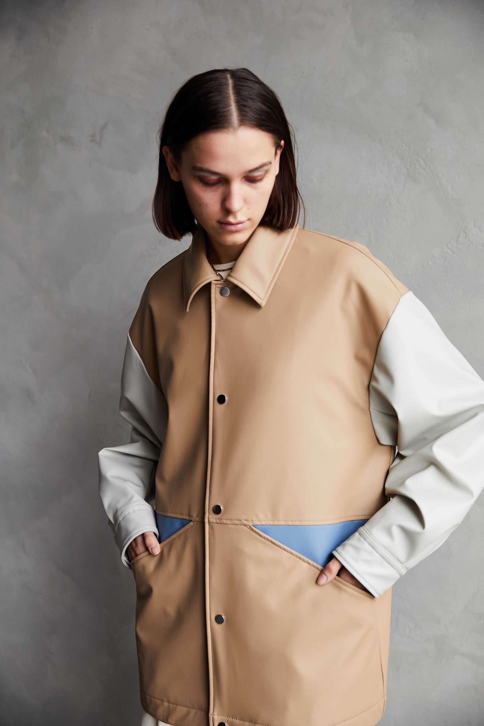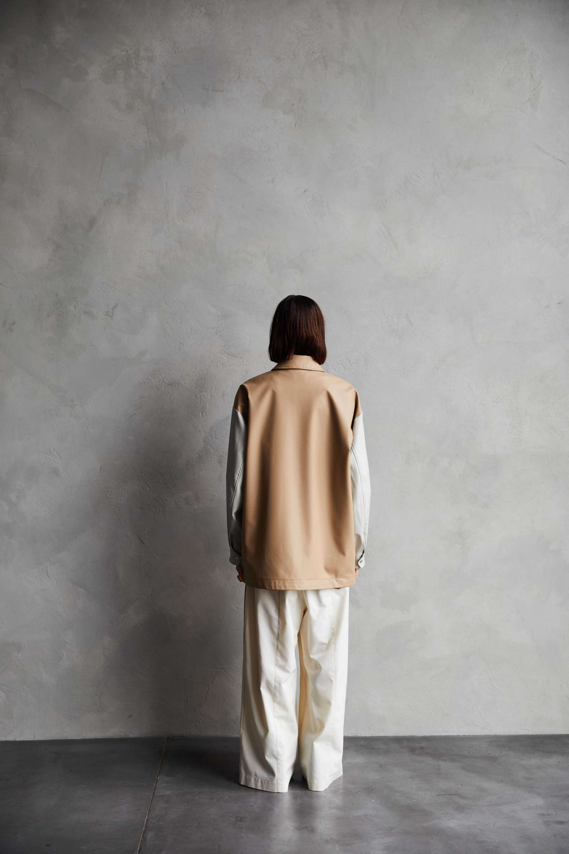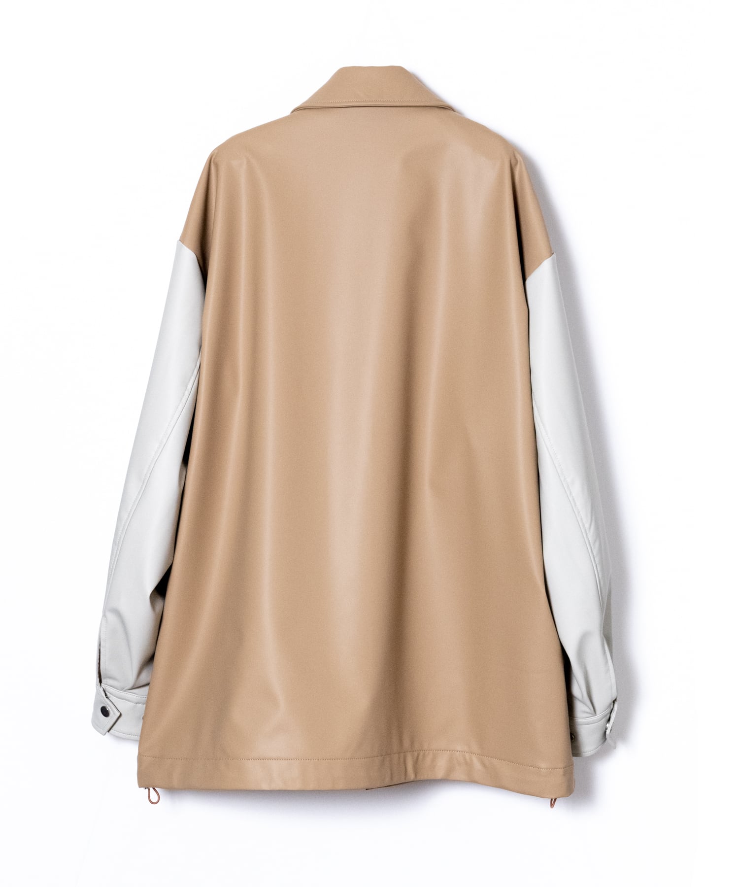 Coach jacket design using leather-like laminate material. Designed with a loose box silhouette with dropped shoulders. Pocket specification that takes advantage of the switching design. By changing the color scheme in a panel shape, we express a sense of playfulness that is unique to TAUPE. The cuffs are cuffed and can be adjusted to 2 levels. The use of flat metal dot buttons adds elegance to a casual coach jacket.