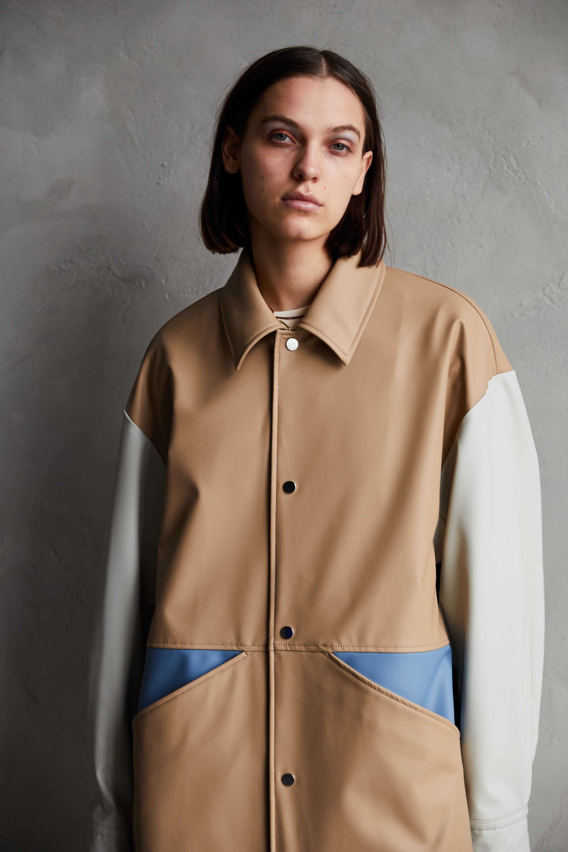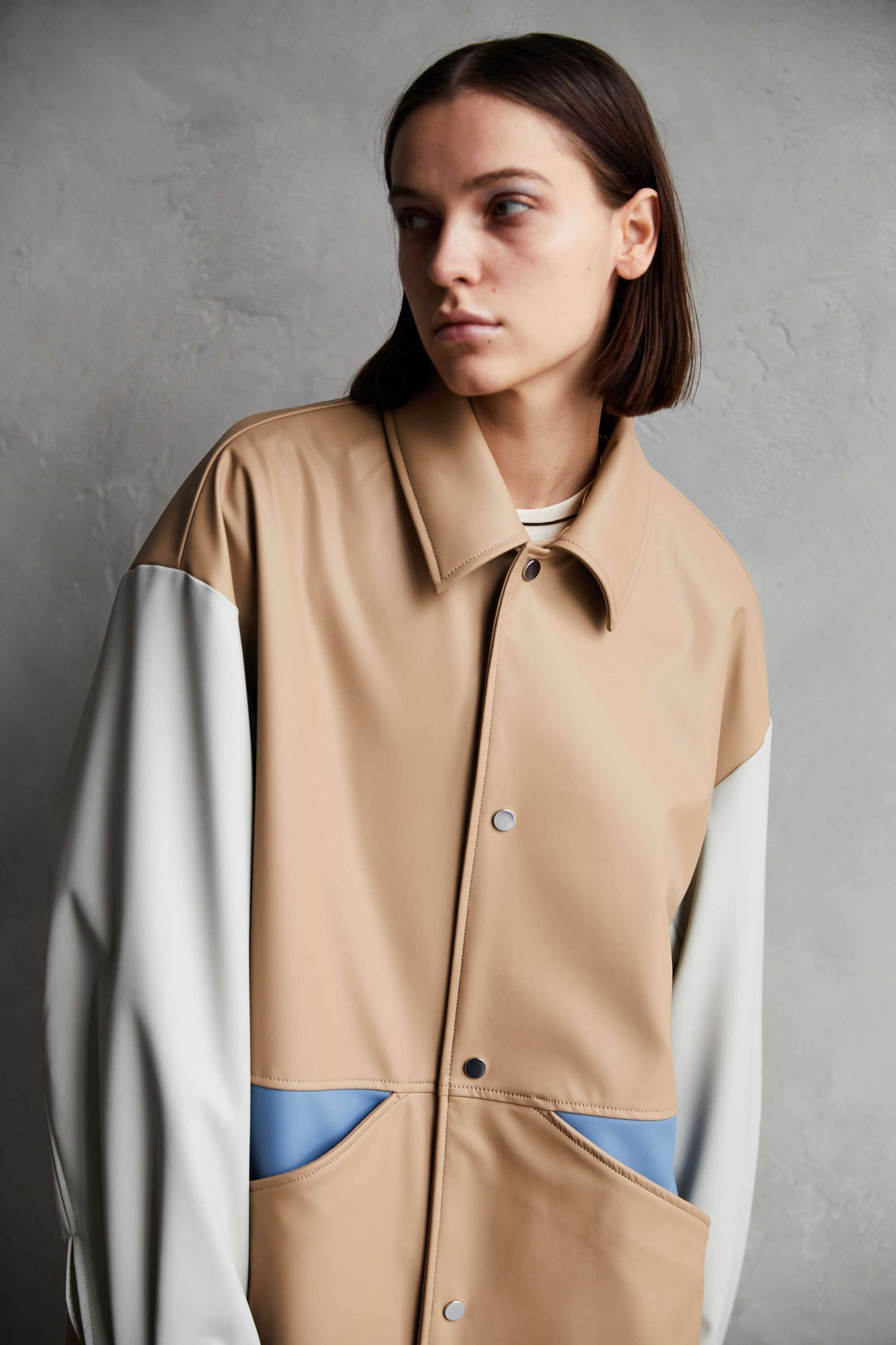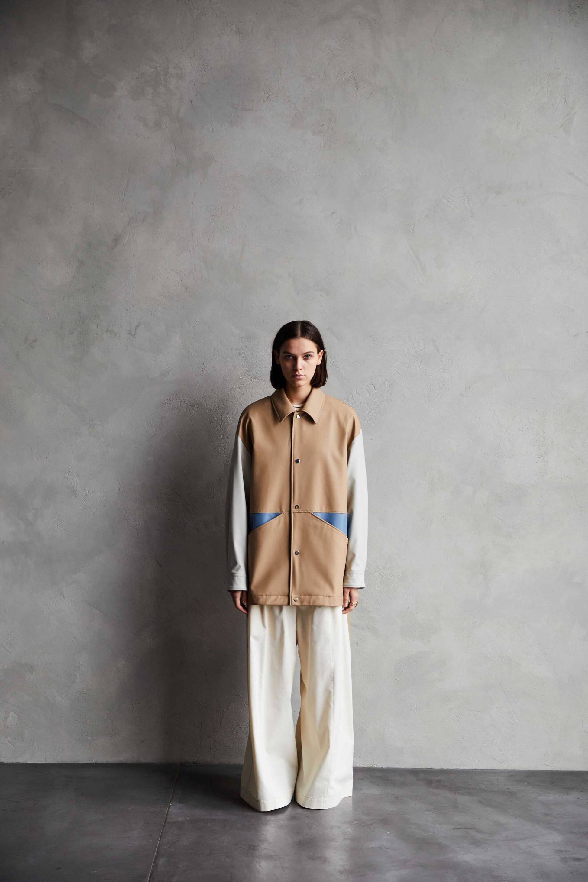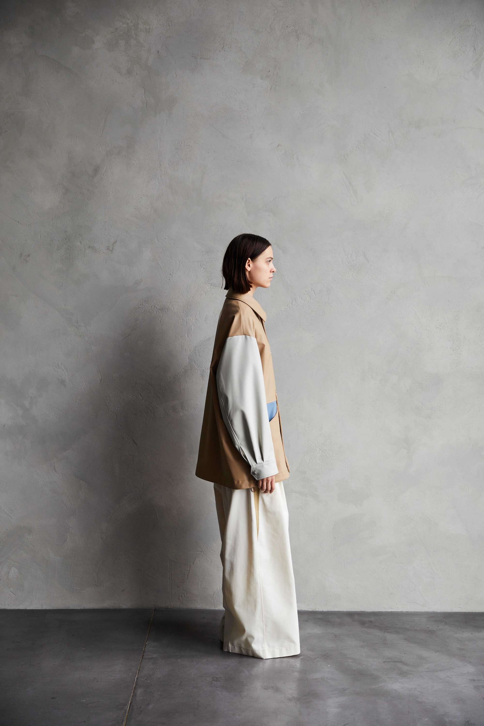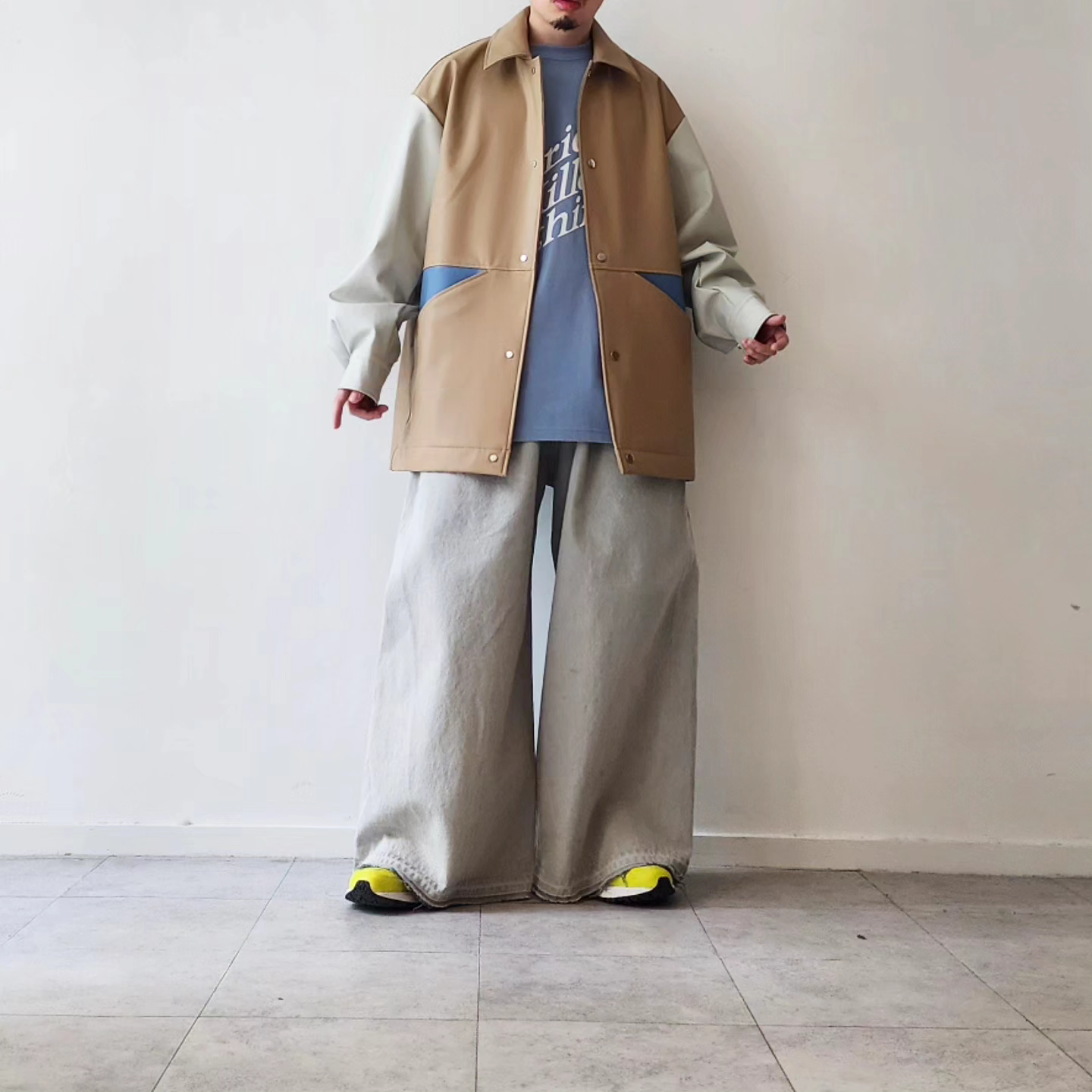 Coach jacket design using leather-like laminate material. Designed with a loose box silhouette with dropped shoulders. Pocket specification that takes advantage of the switching design. By changing the color scheme in a panel shape, we express a sense of playfulness that is unique to TAUPE. The cuffs are cuffed and can be adjusted to 2 levels. The use of flat metal dot buttons adds elegance to a casual coach jacket.
