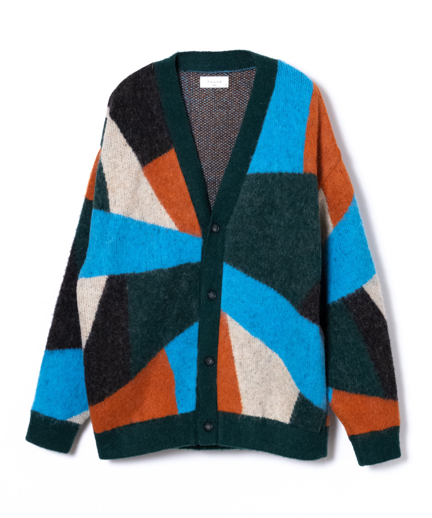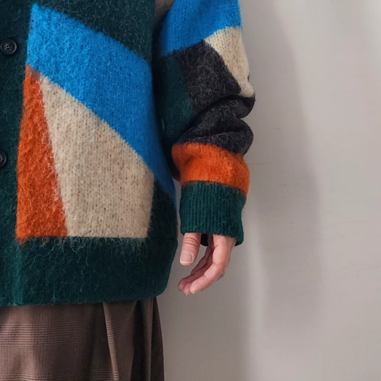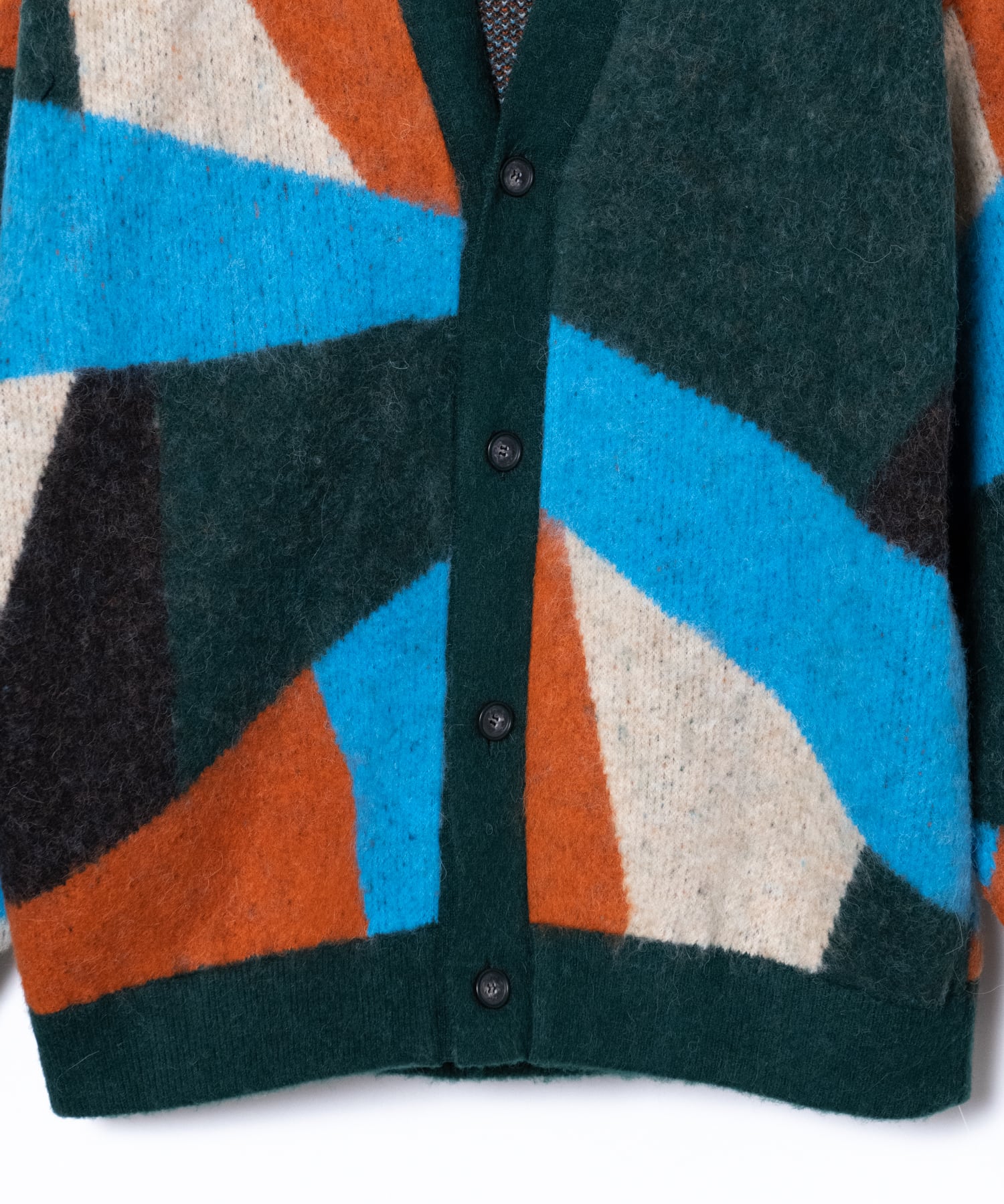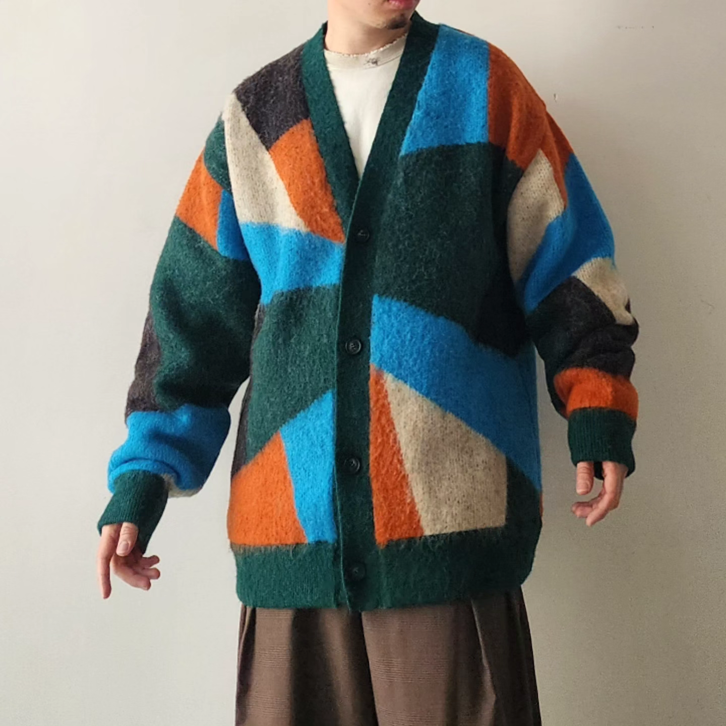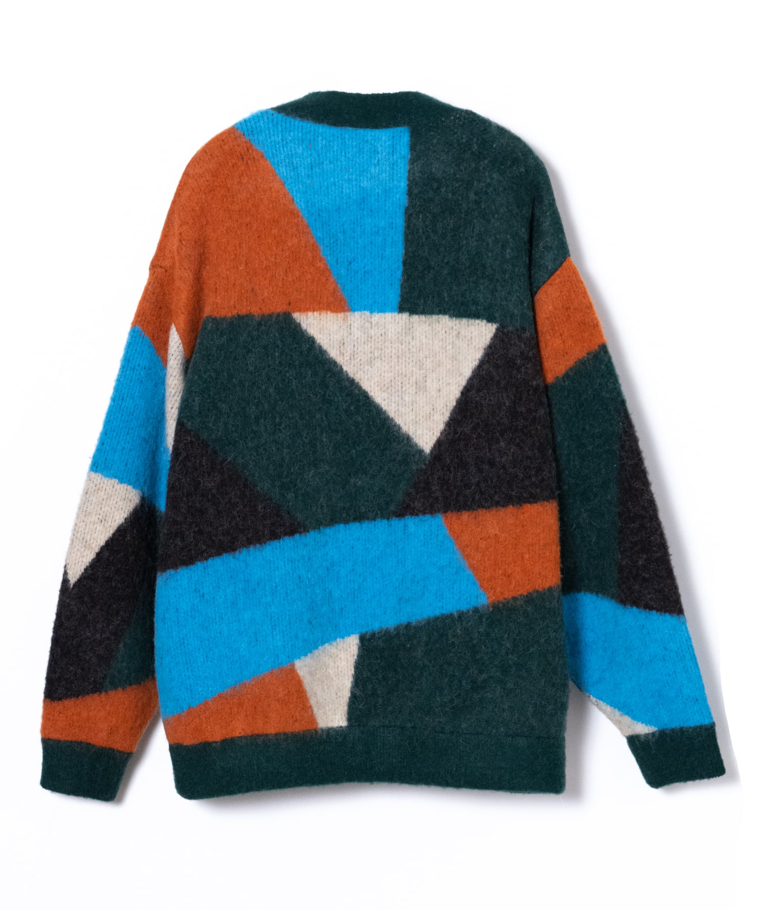 -A loose-fit car guardigan featuring a color scheme with intricate panels. Designed with a rounded, voluminous silhouette with dropped shoulders. By using alpaca yarn with a pile, this item has a warm appearance. We also recommend coordinating it with a muffler of the same color scheme made from the same thread.