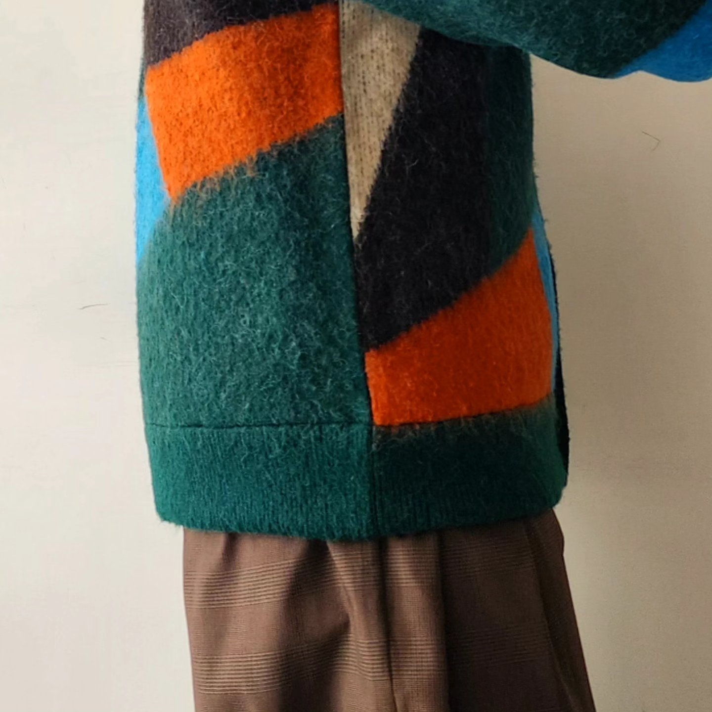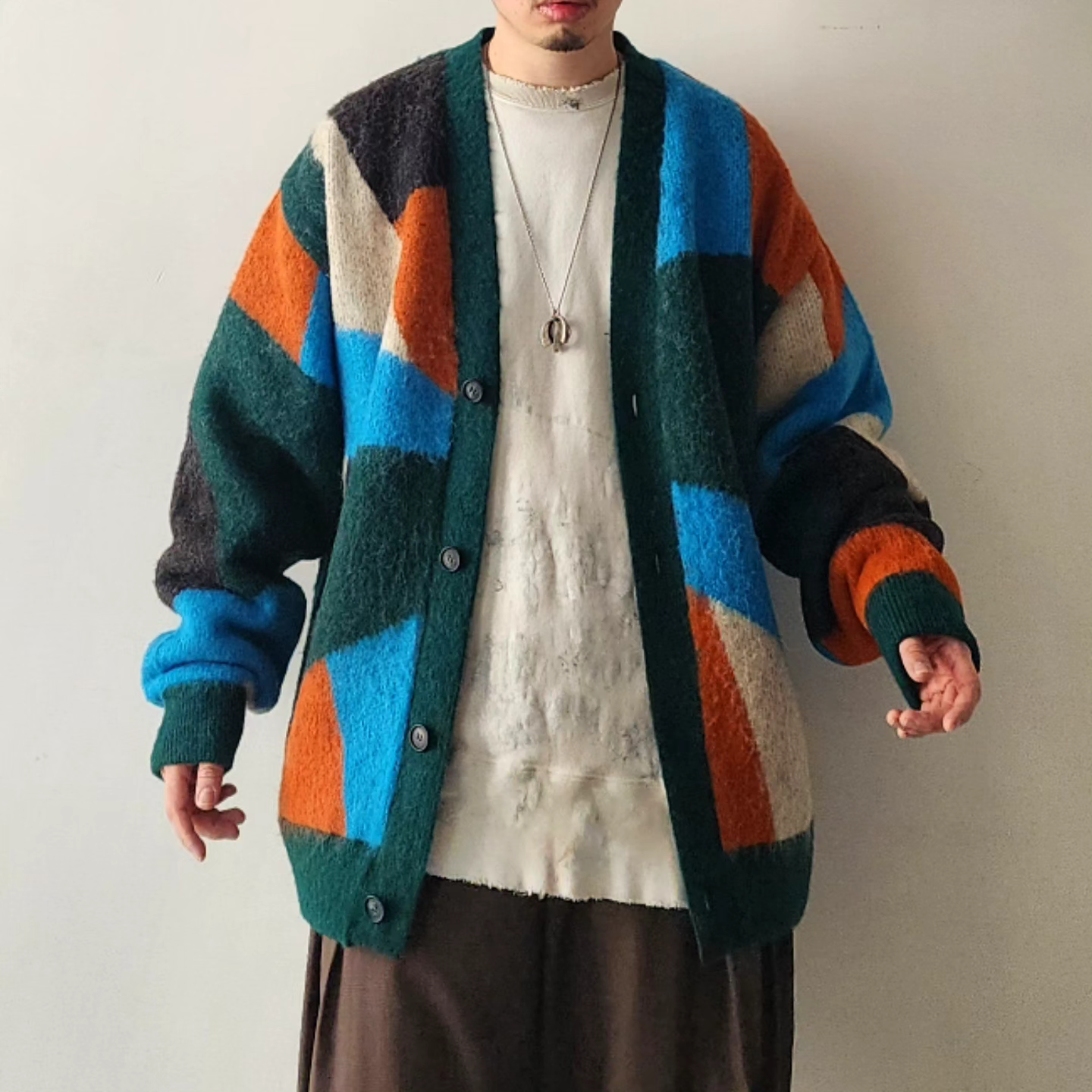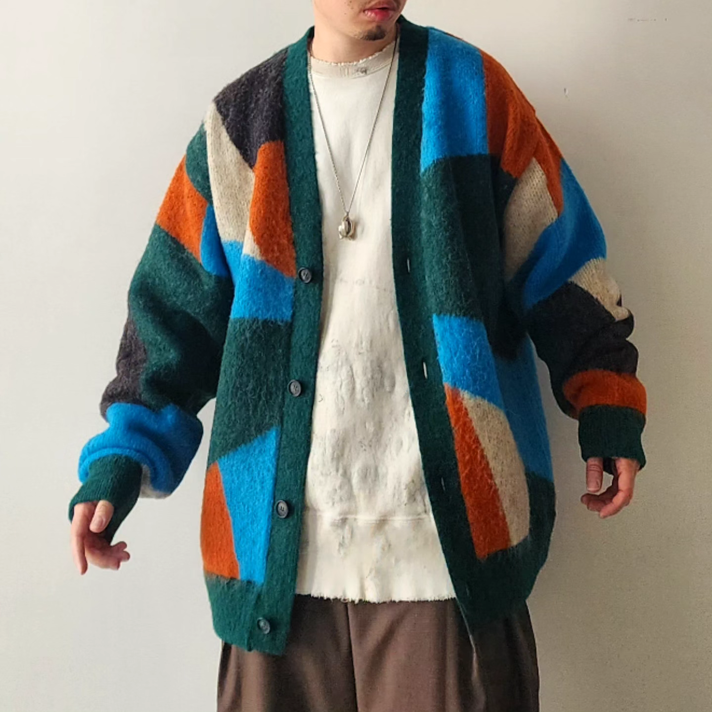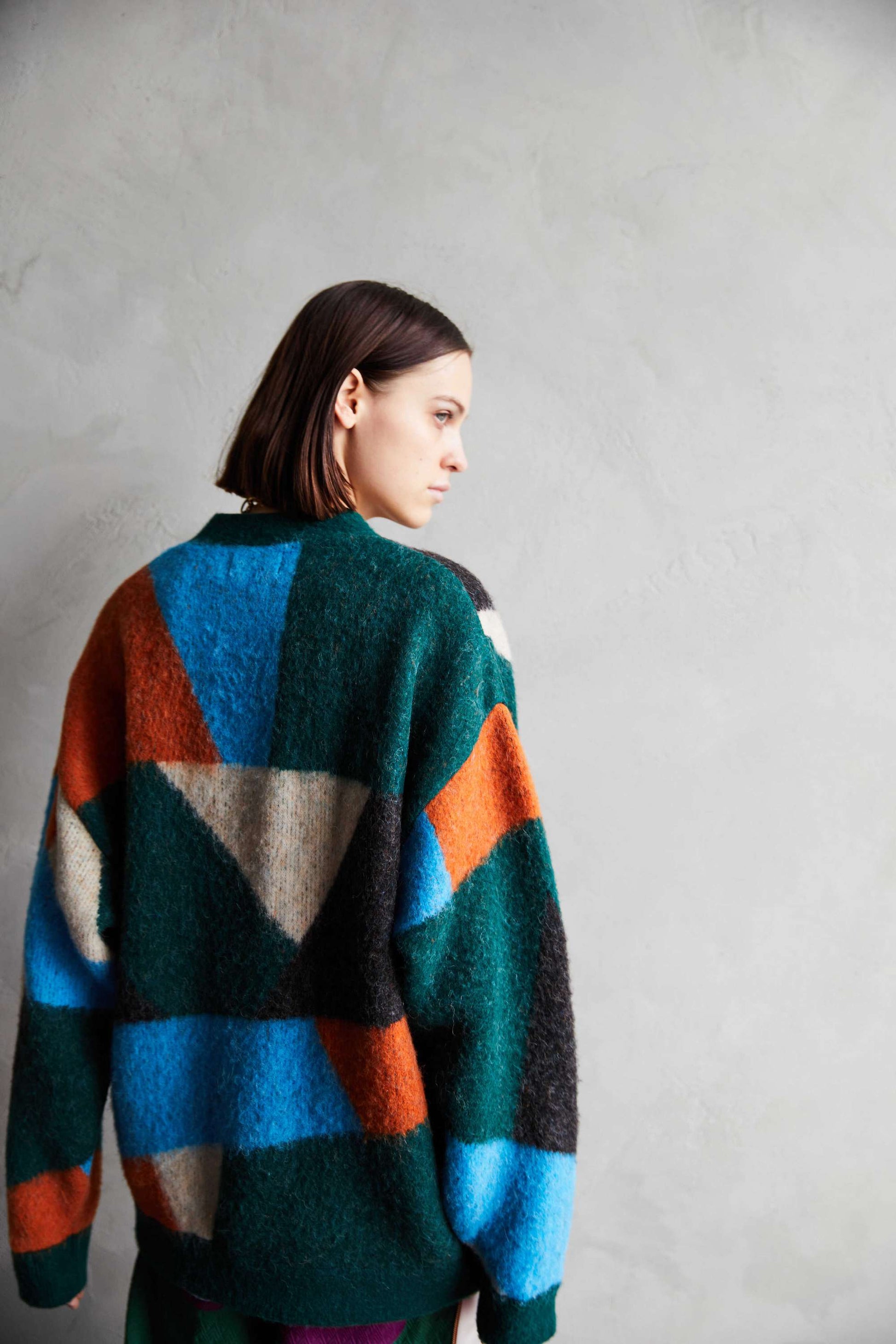 -A loose-fit car guardigan featuring a color scheme with intricate panels. Designed with a rounded, voluminous silhouette with dropped shoulders. By using alpaca yarn with a pile, this item has a warm appearance. We also recommend coordinating it with a muffler of the same color scheme made from the same thread.