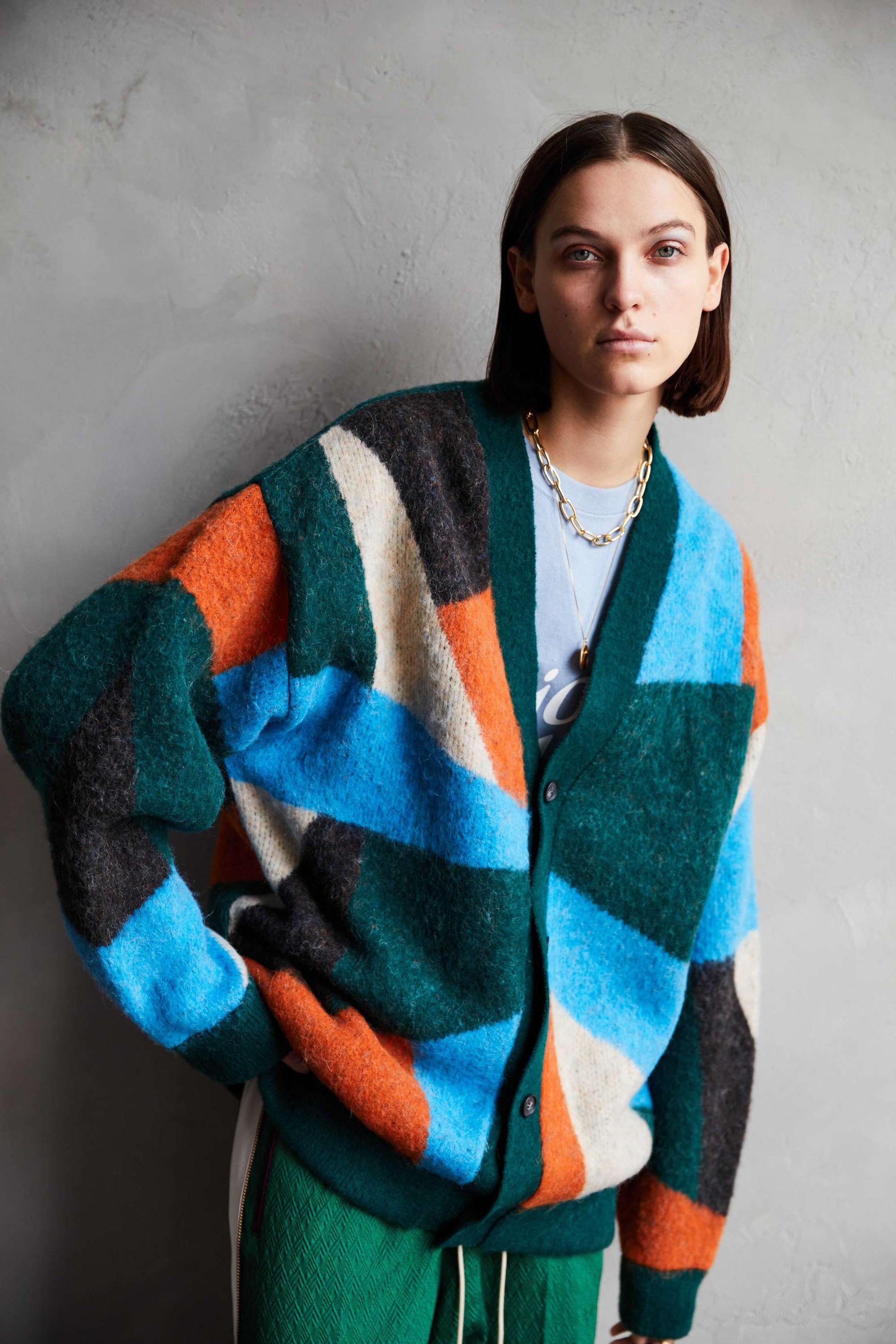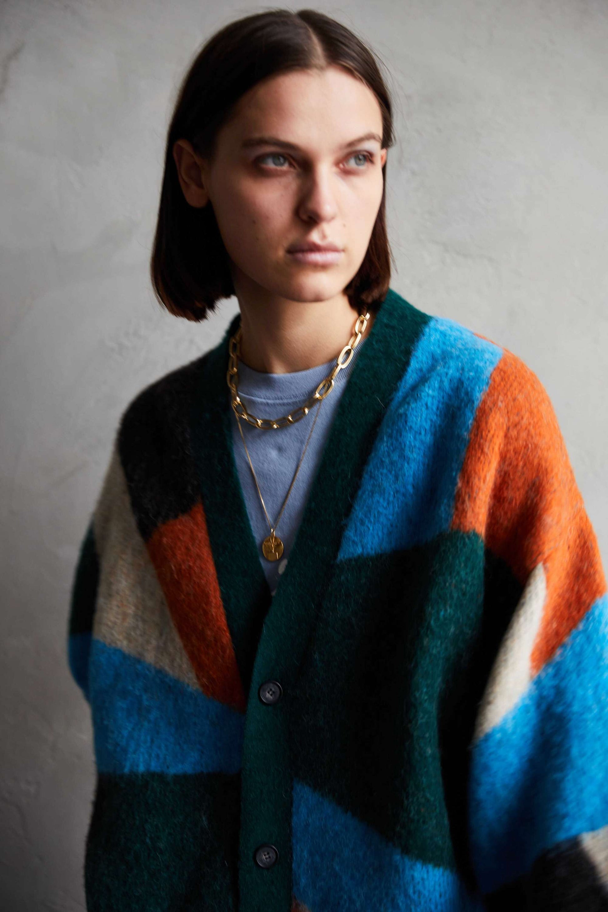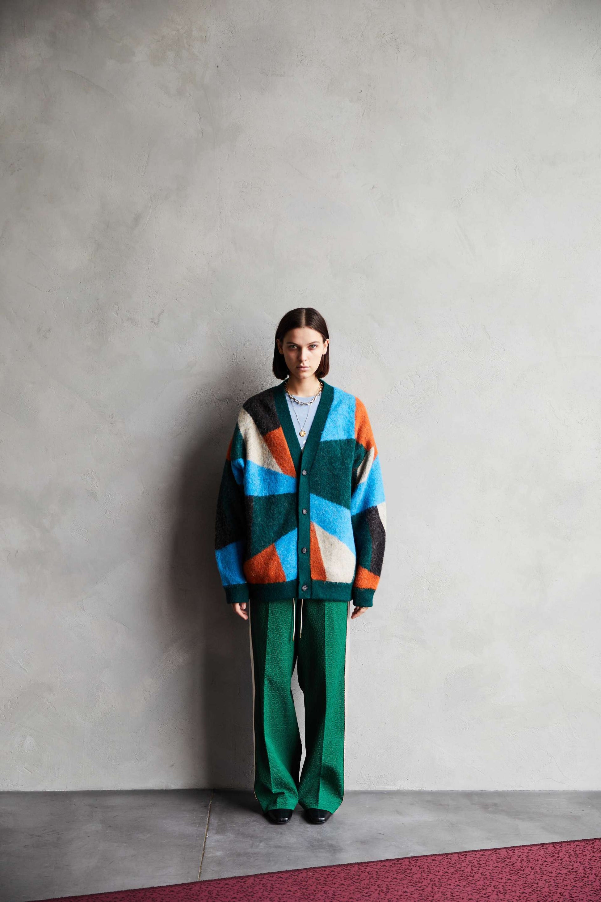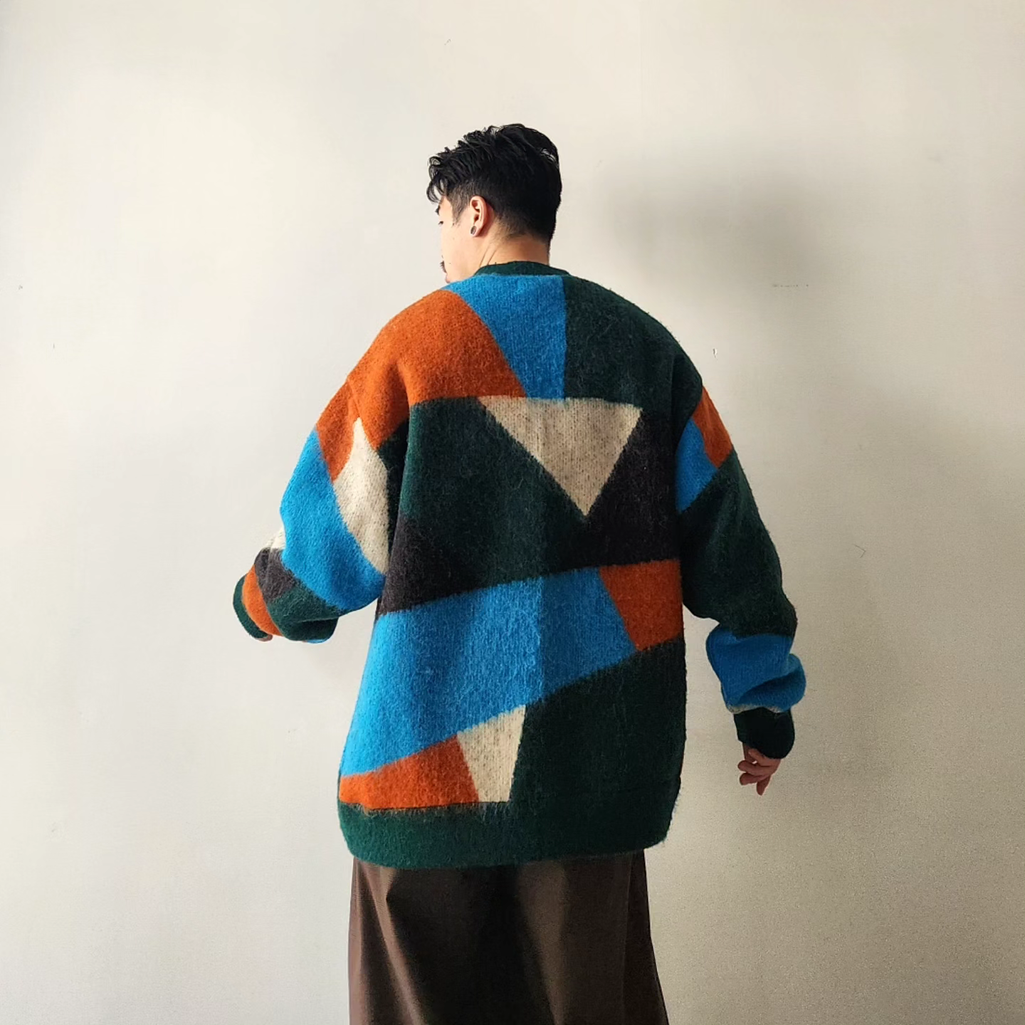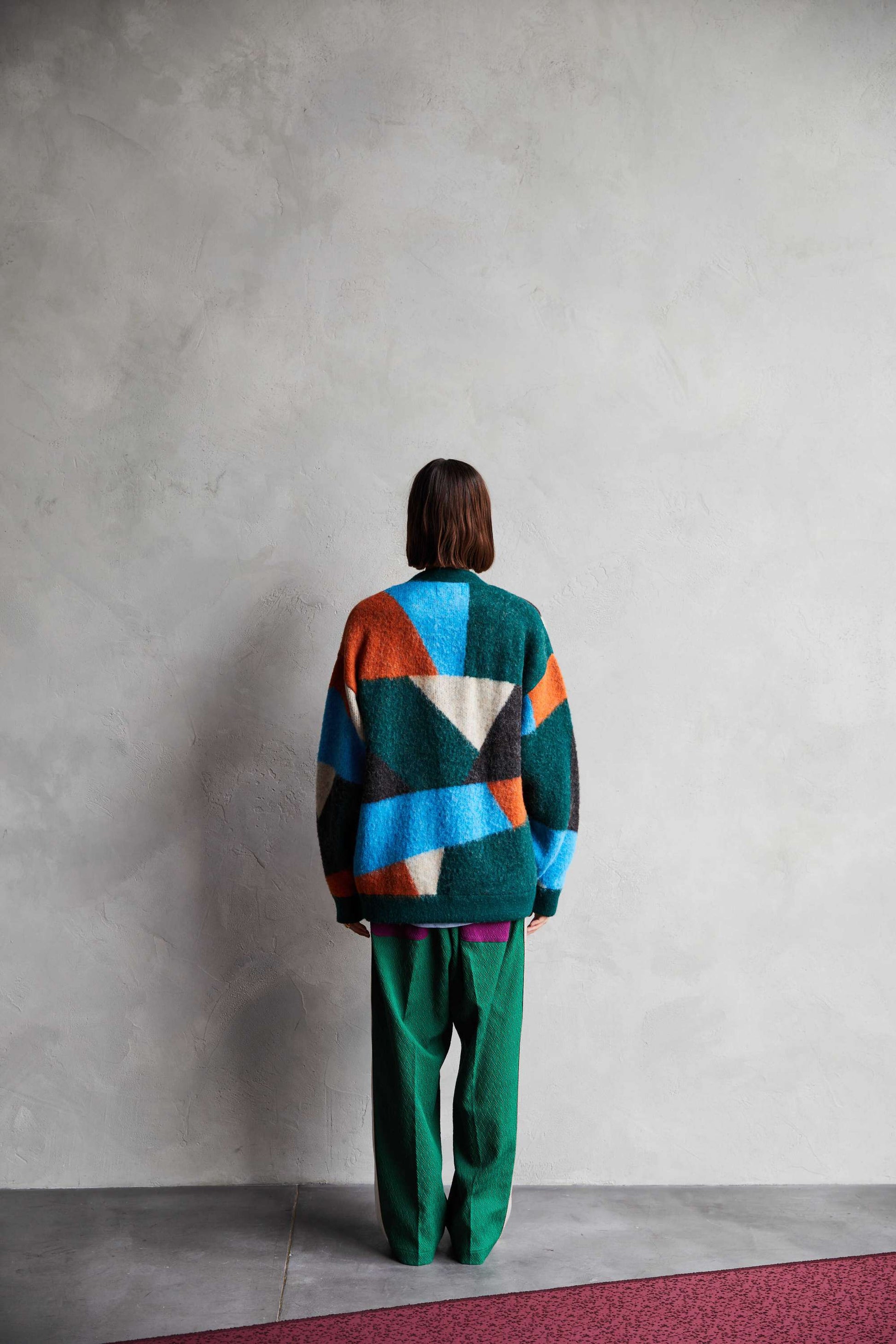 -A loose-fit car guardigan featuring a color scheme with intricate panels. Designed with a rounded, voluminous silhouette with dropped shoulders. By using alpaca yarn with a pile, this item has a warm appearance. We also recommend coordinating it with a muffler of the same color scheme made from the same thread.