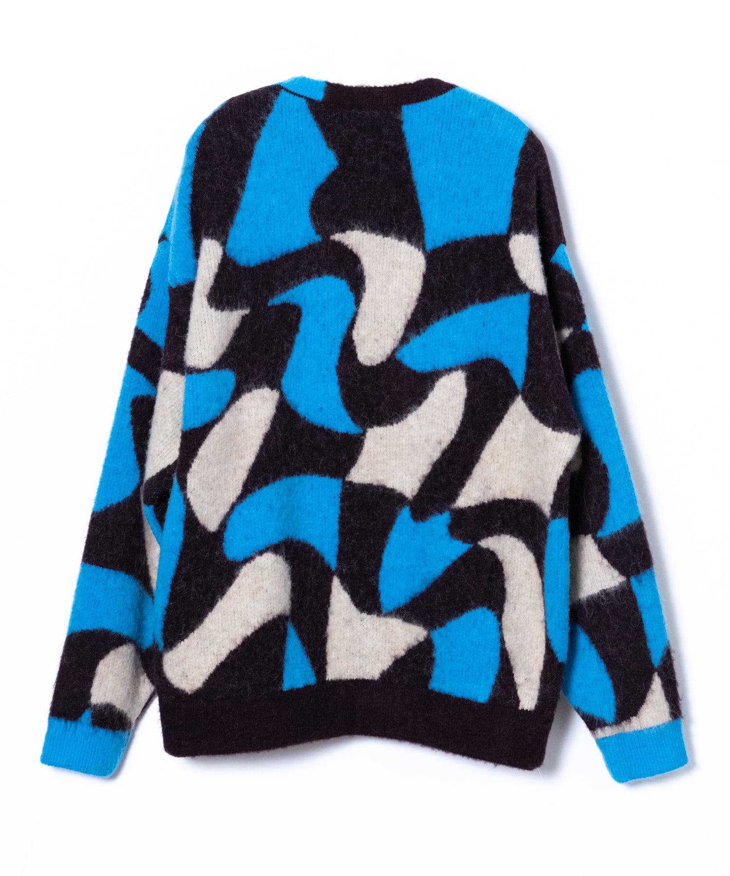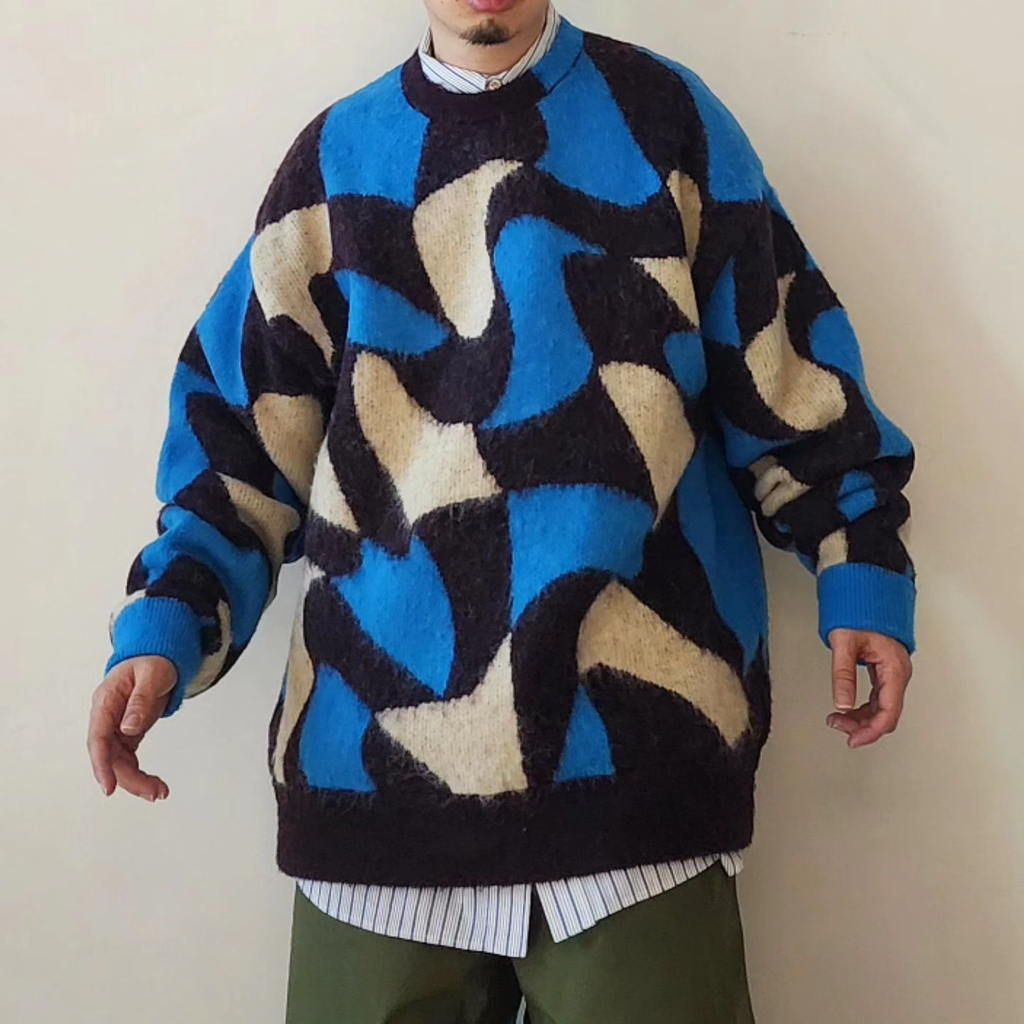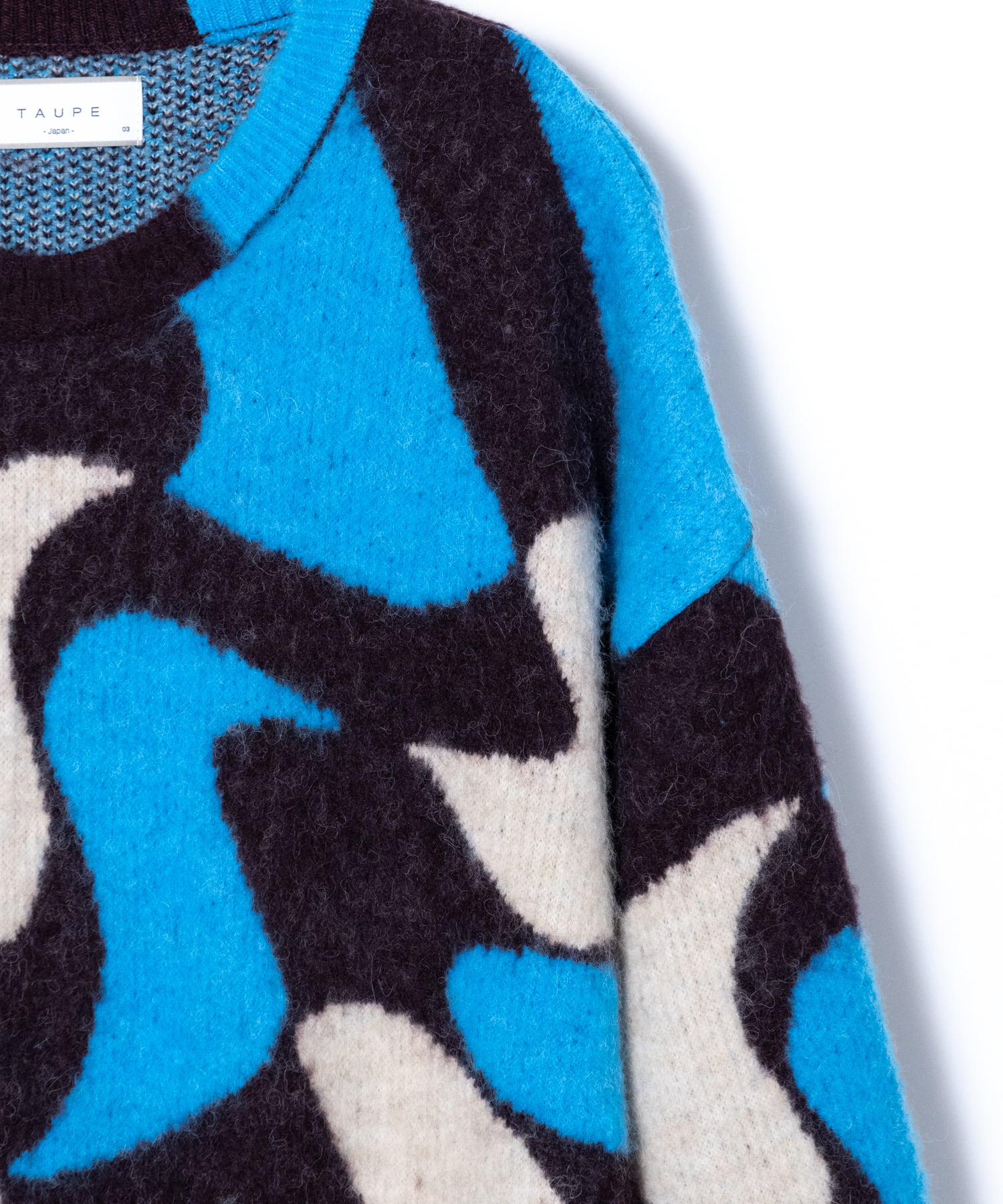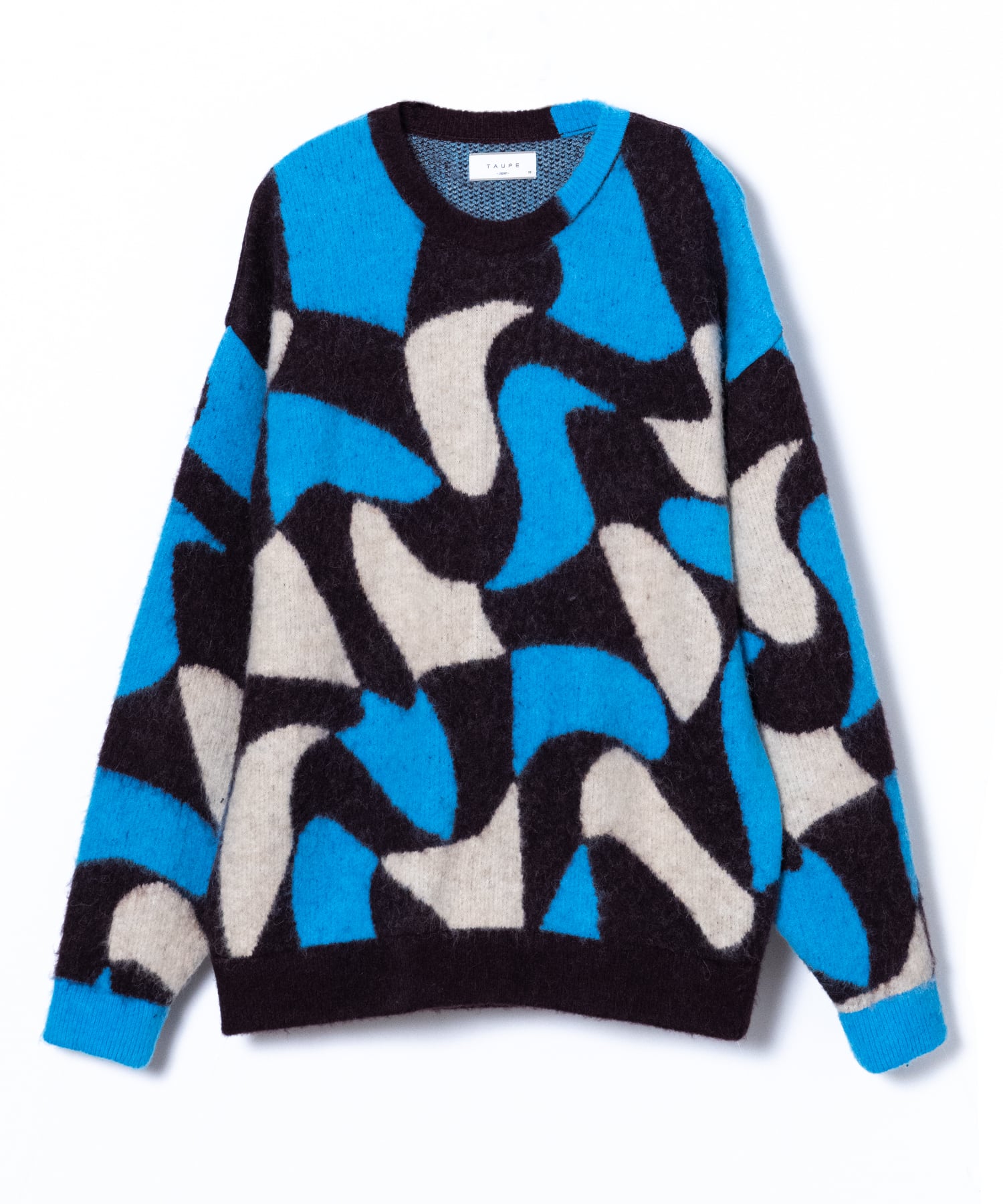 Adopts TAUPE's original wavy pattern with an irregularly distorted plaid pattern. Designed with a relaxed and rounded silhouette. The ribbed neck has an asymmetrical color scheme that adds a sense of playfulness like no other. By using alpaca yarn with a pile, this item has a warm appearance.