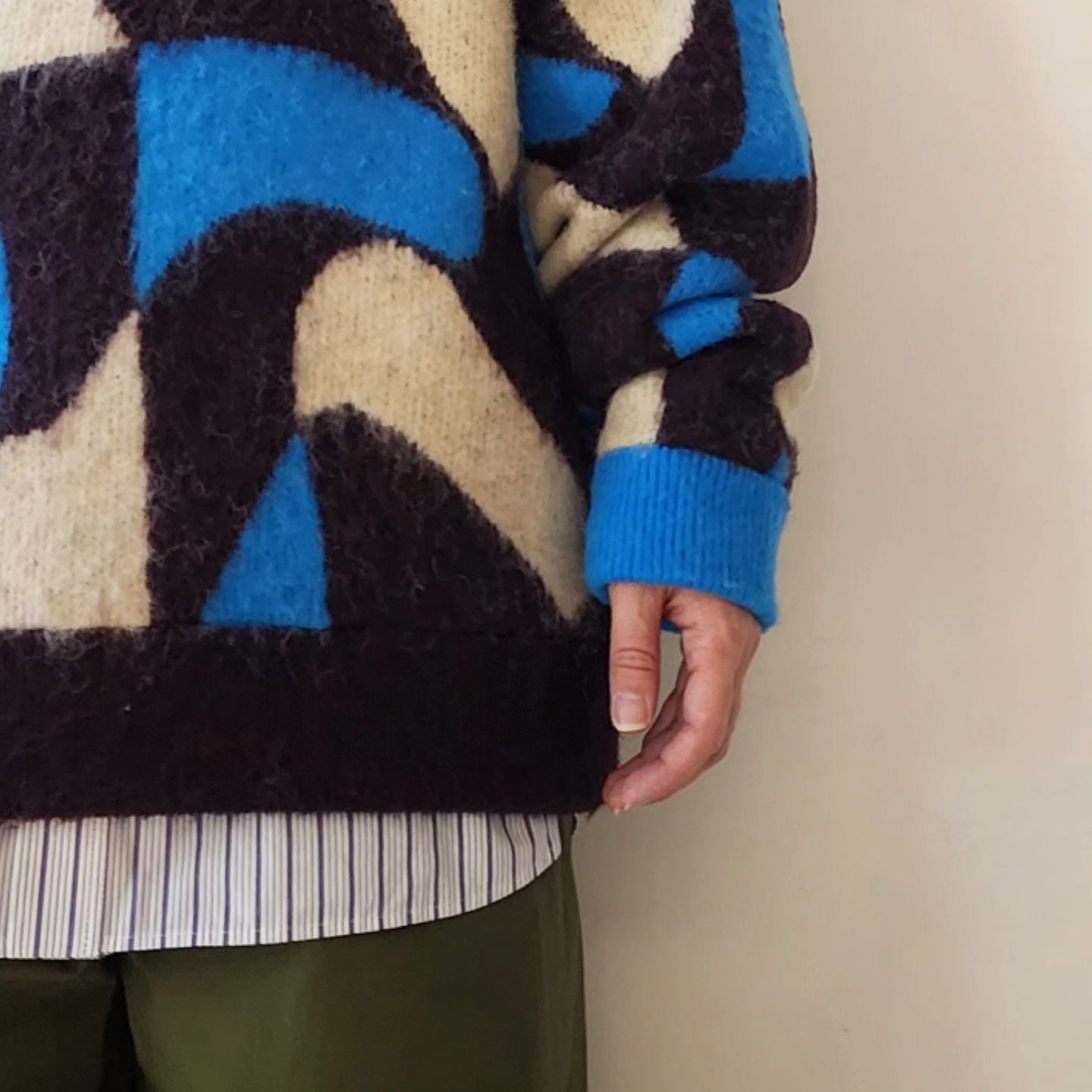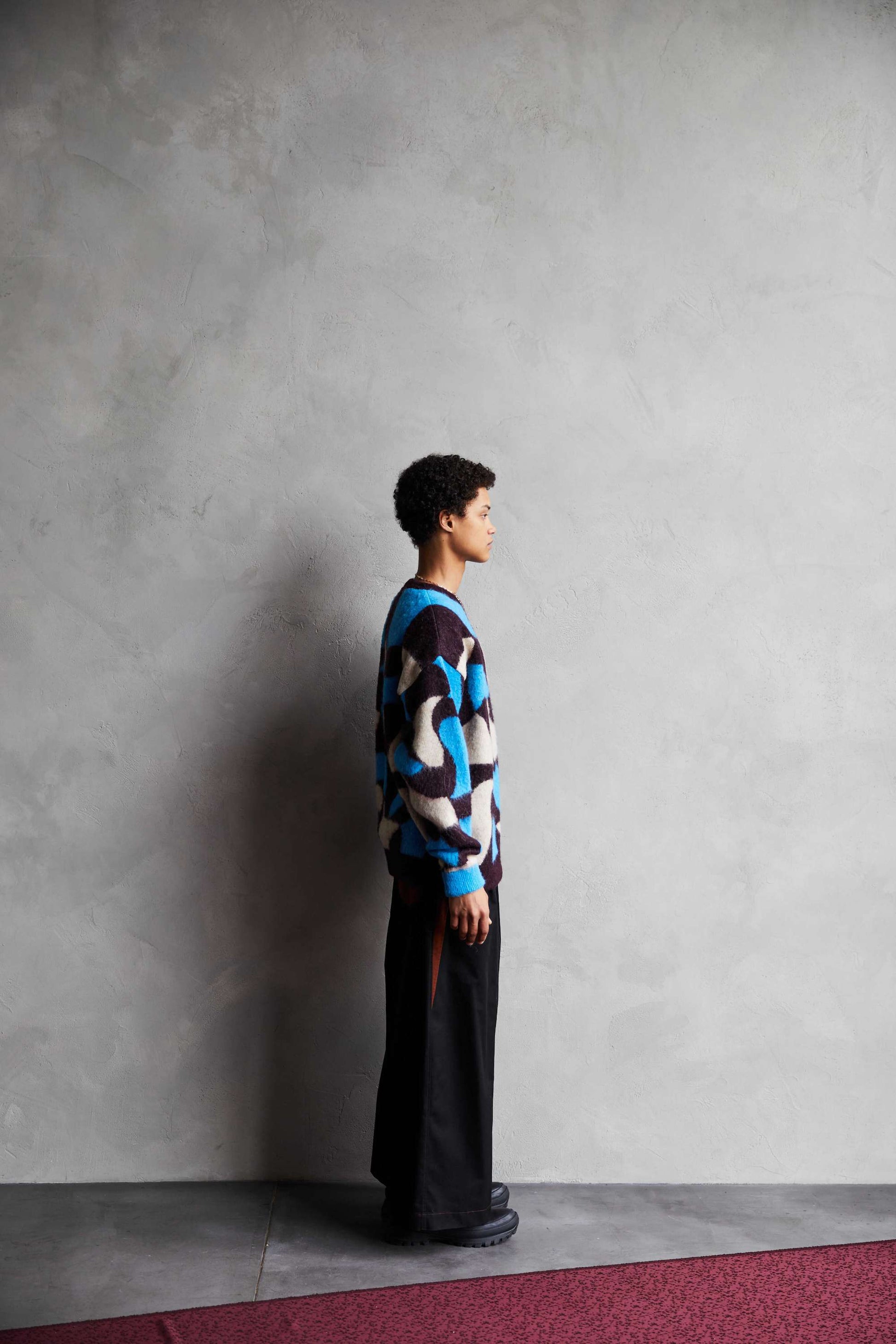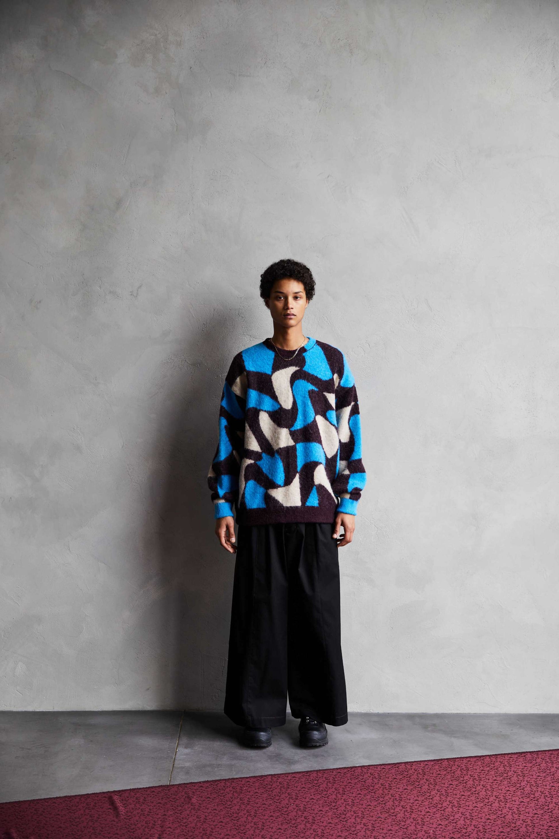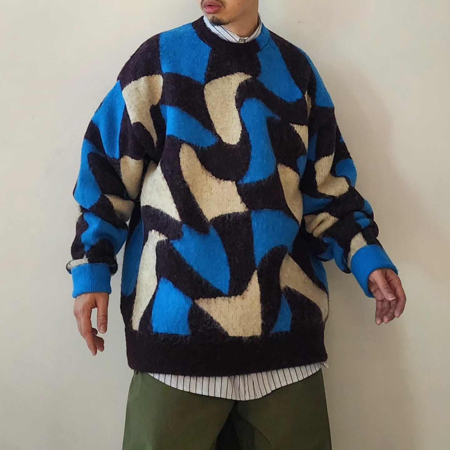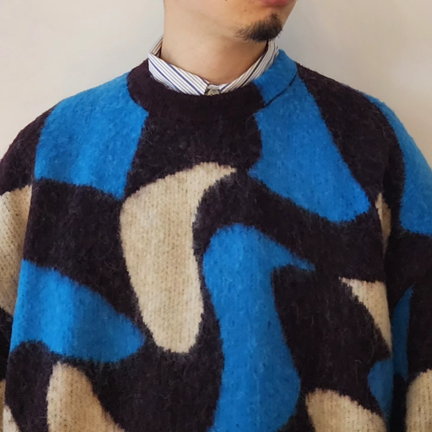 Adopts TAUPE's original wavy pattern with an irregularly distorted plaid pattern. Designed with a relaxed and rounded silhouette. The ribbed neck has an asymmetrical color scheme that adds a sense of playfulness like no other. By using alpaca yarn with a pile, this item has a warm appearance.