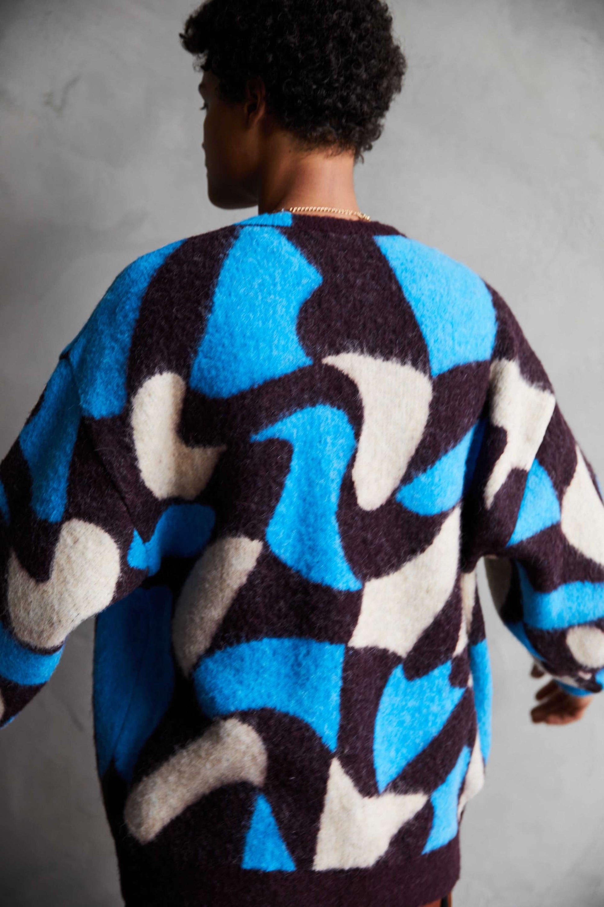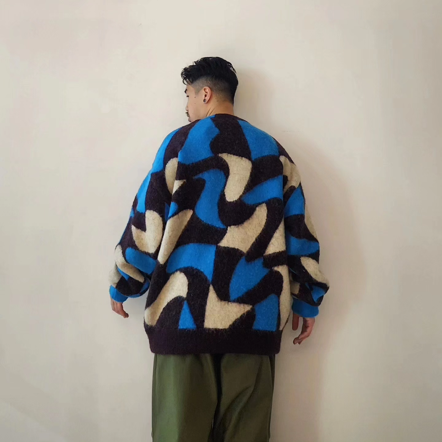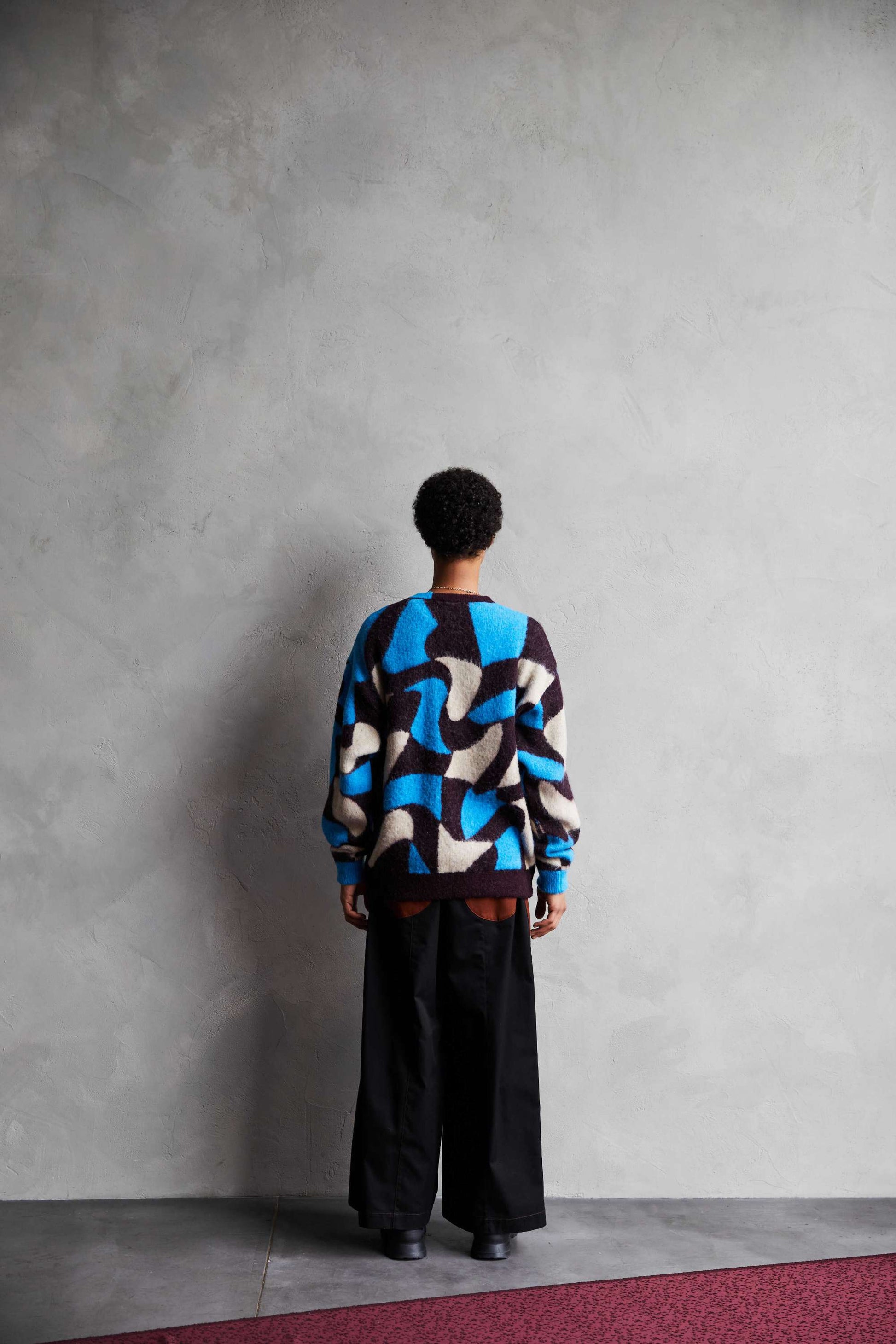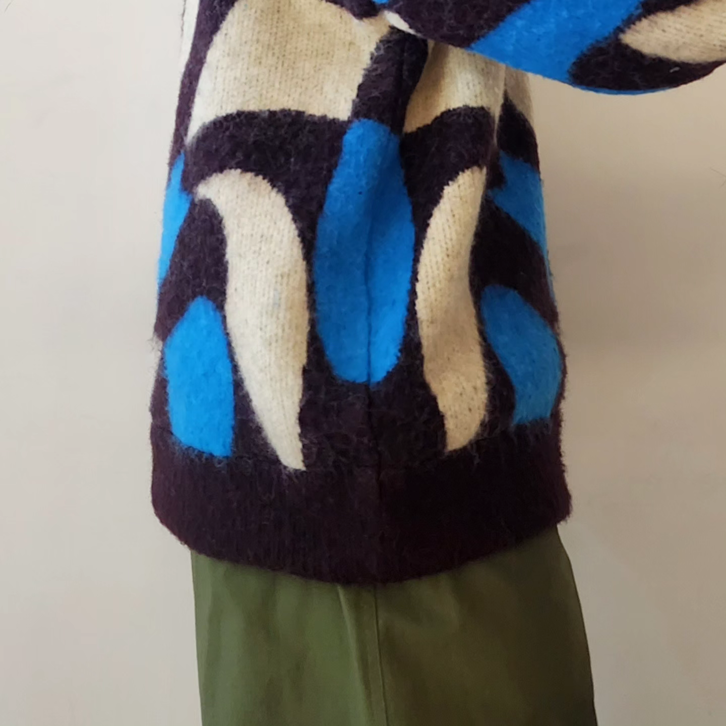 Adopts TAUPE's original wavy pattern with an irregularly distorted plaid pattern. Designed with a relaxed and rounded silhouette. The ribbed neck has an asymmetrical color scheme that adds a sense of playfulness like no other. By using alpaca yarn with a pile, this item has a warm appearance.