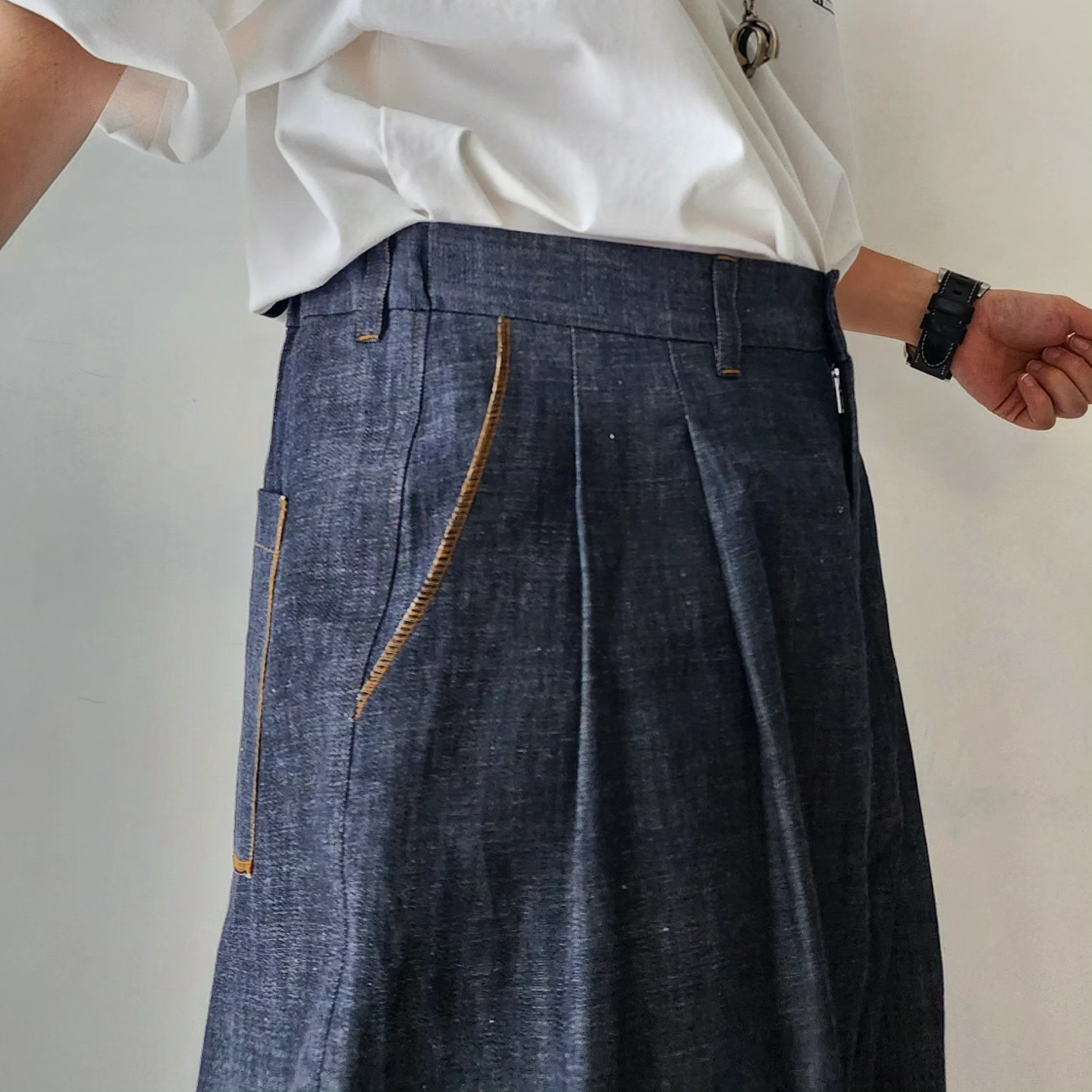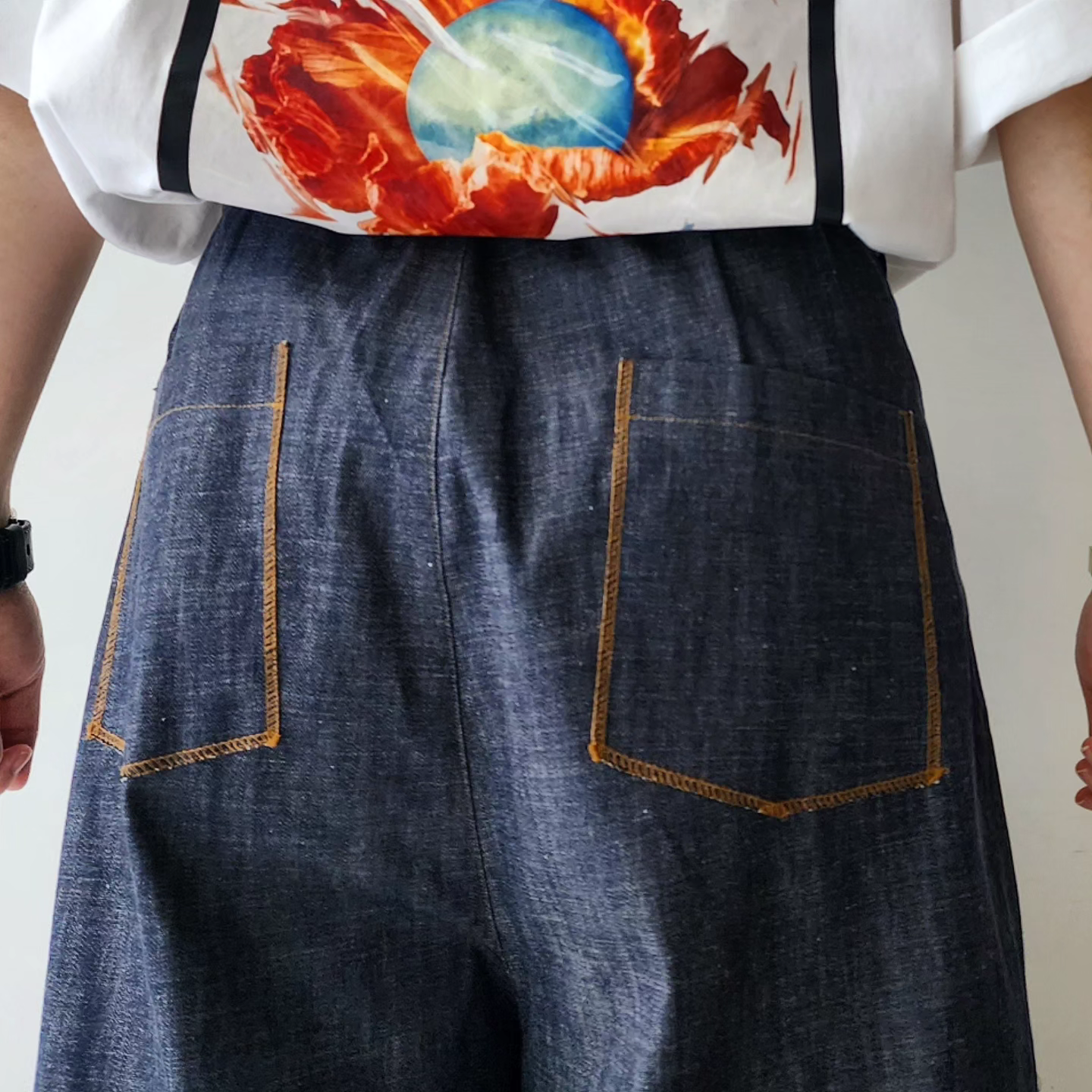 -Longer middle seam give it a bold thickness while keeping the waistline clean. A transition is made around the back of the knee, giving the silhouette a slightly bent leg.
