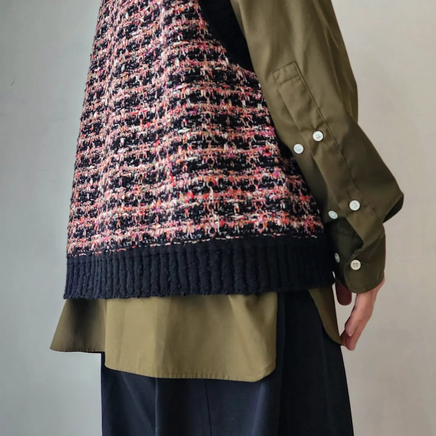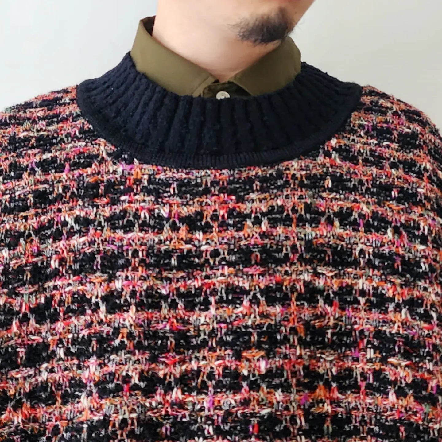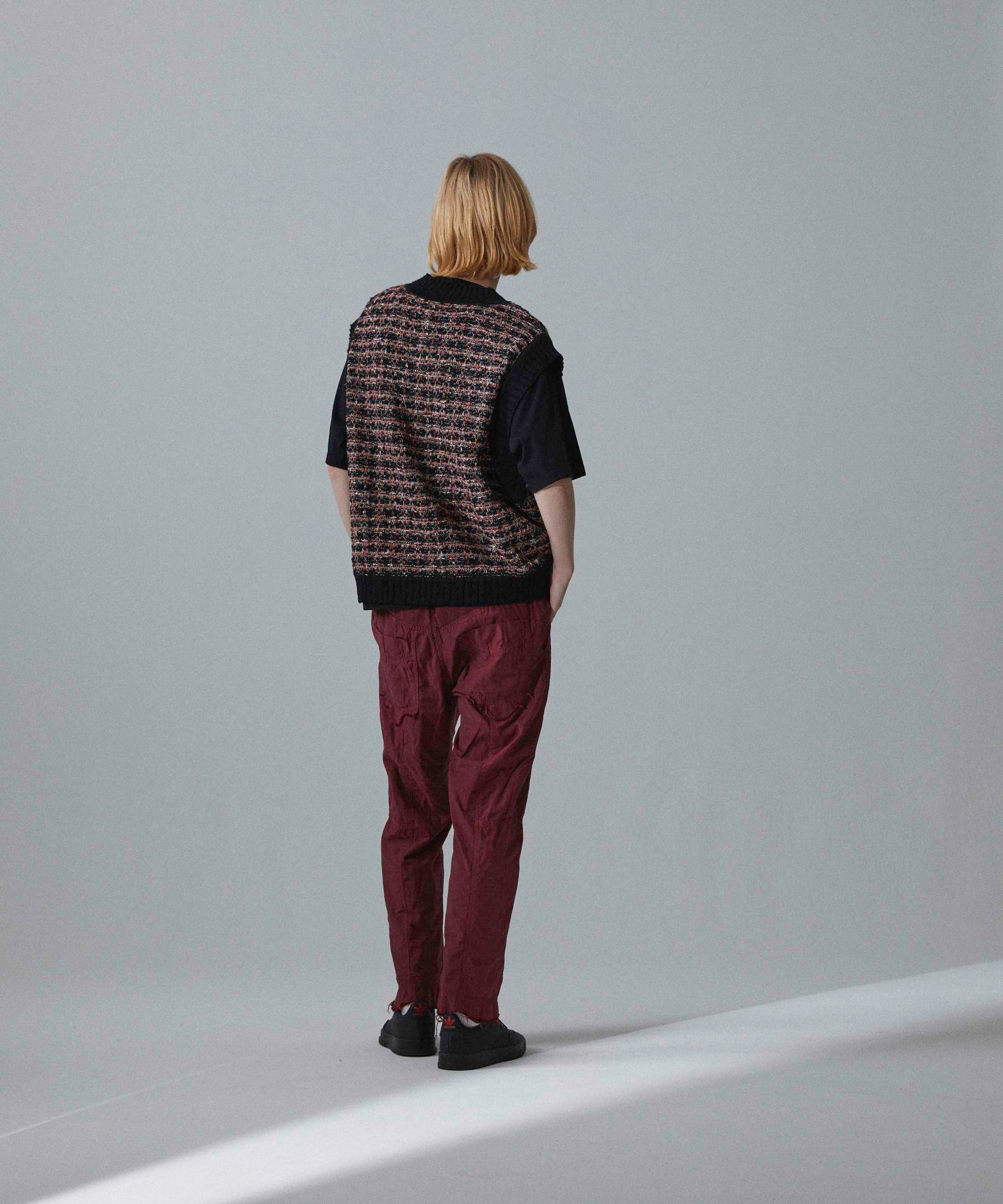 - Thick cotton slub, glossy rayon, colorful kasuri yarn, looped boucle yarn, tweed fabric with depth by knitting 4 materials that are characteristic of these expressions and changing the yarn. is expressed by the knitted fabric, creating a skillful mixed color feeling.