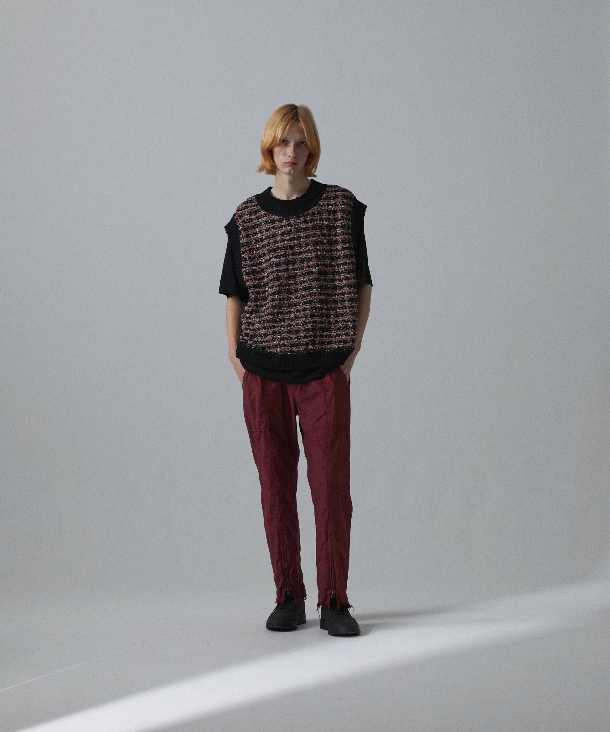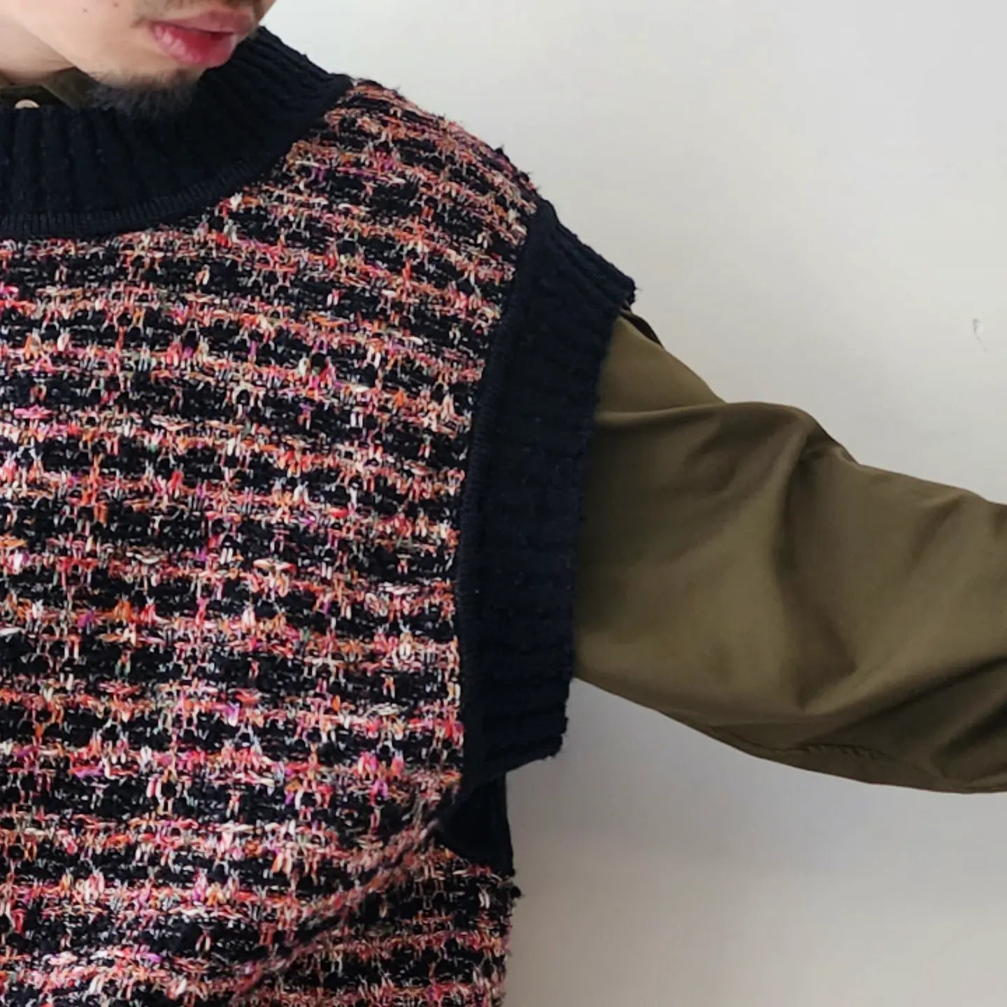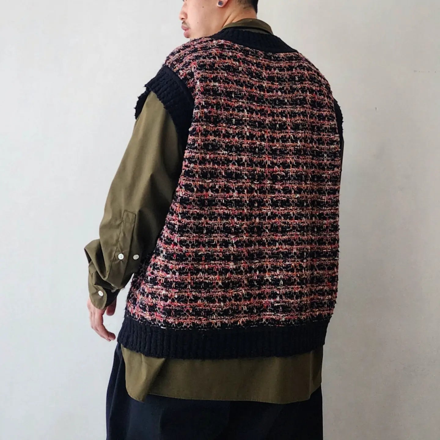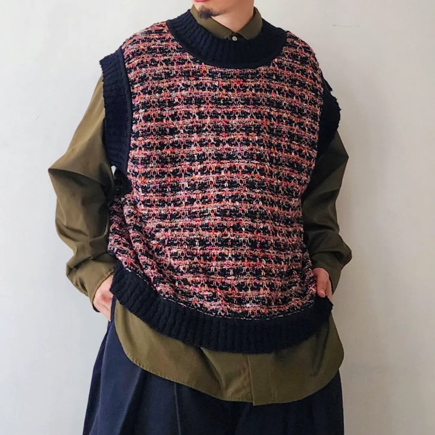 - Thick cotton slub, glossy rayon, colorful kasuri yarn, looped boucle yarn, tweed fabric with depth by knitting 4 materials that are characteristic of these expressions and changing the yarn. is expressed by the knitted fabric, creating a skillful mixed color feeling.