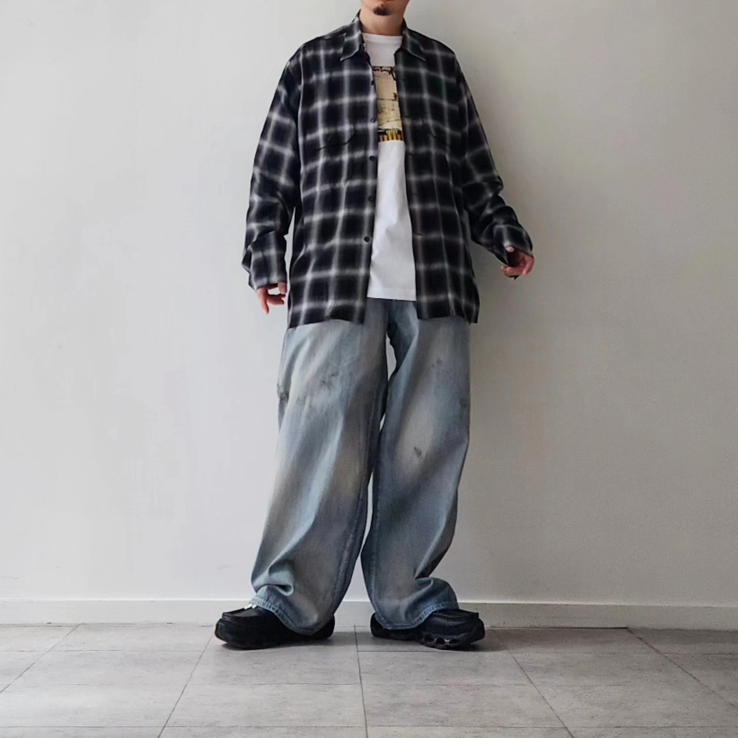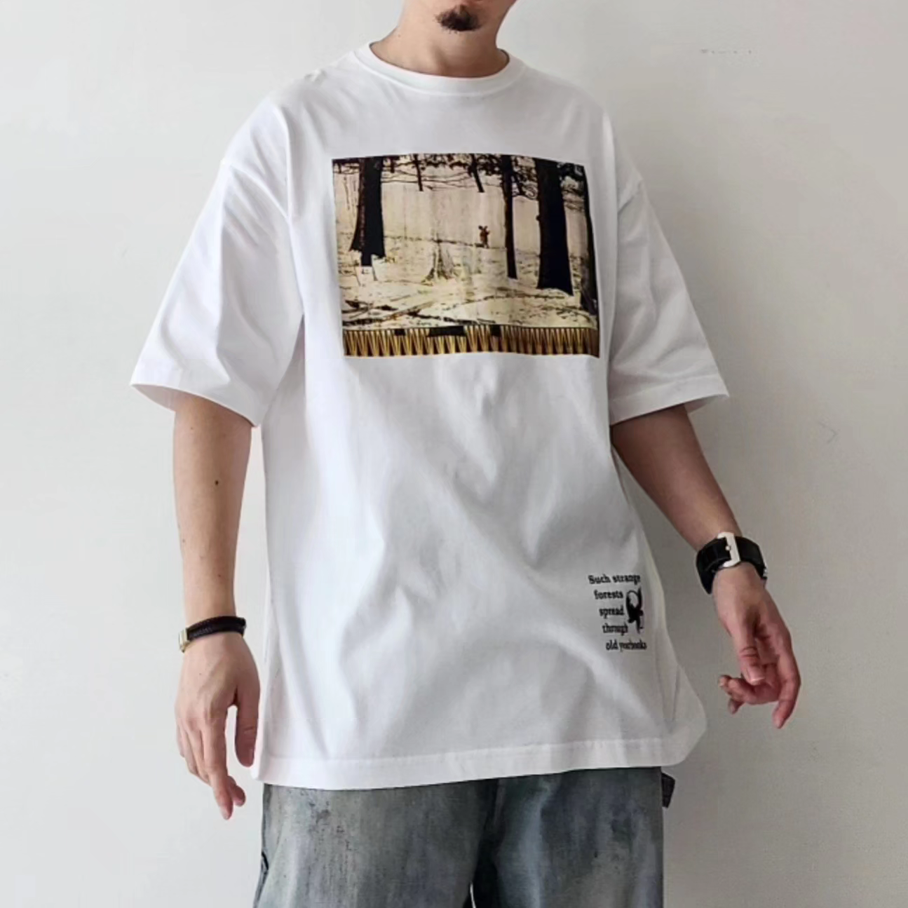 A T-shirt created with a focus on silhouette. It features graphics inspired by the season's theme of bigarrure (mixed colors, diverse patterns; disharmony).