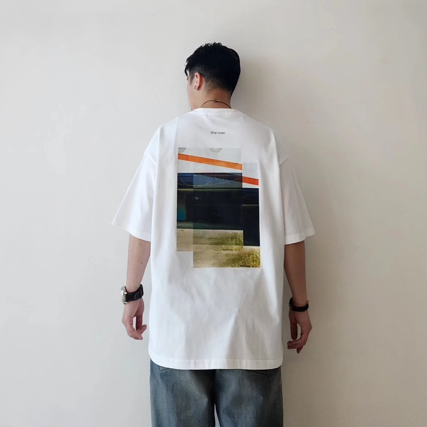 A T-shirt created with a focus on silhouette. A T-shirt printed with a collage design of photographs by photographer Shunsuke Kondo.