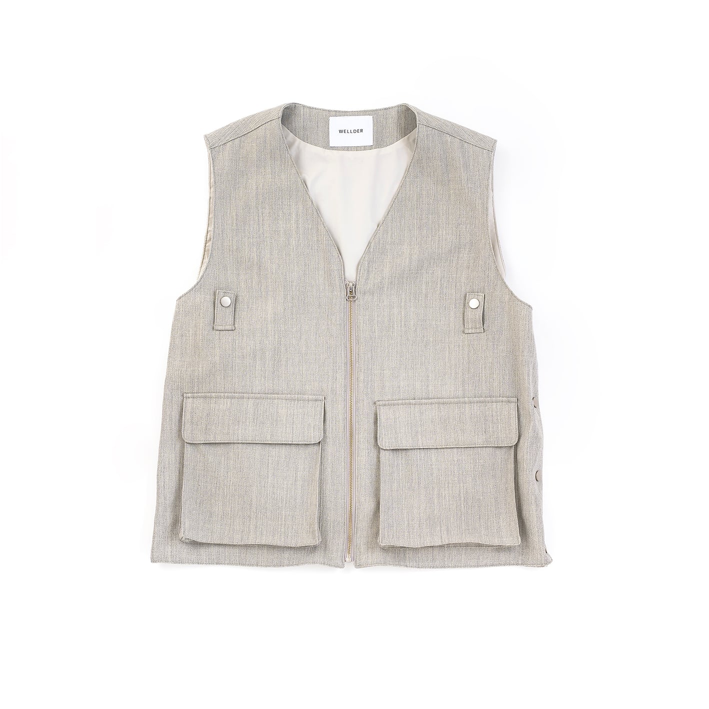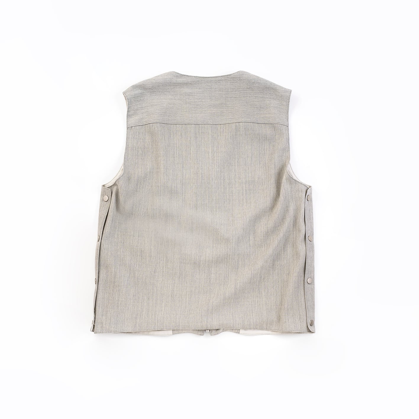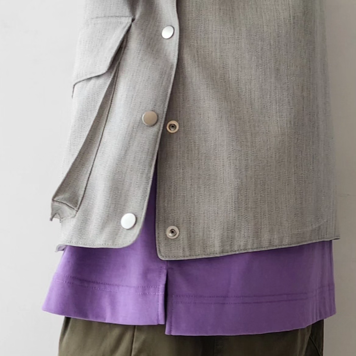 A vest that adds an accent to your outfit. Both sides can be opened and closed with dot buttons, allowing you to vary the silhouette and outfit.