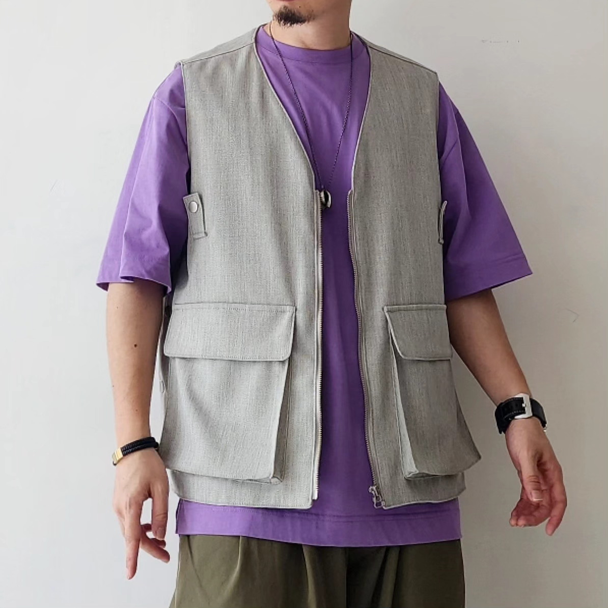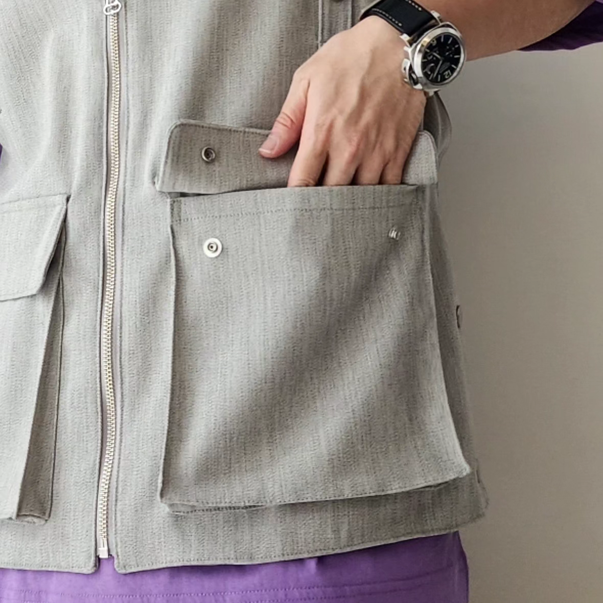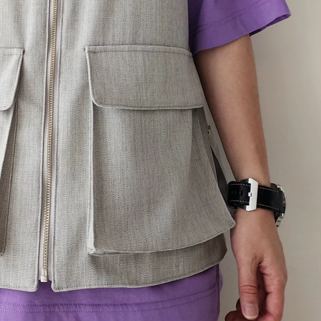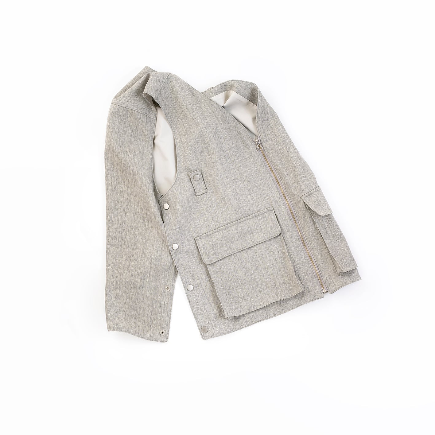 A vest that adds an accent to your outfit. Both sides can be opened and closed with dot buttons, allowing you to vary the silhouette and outfit.